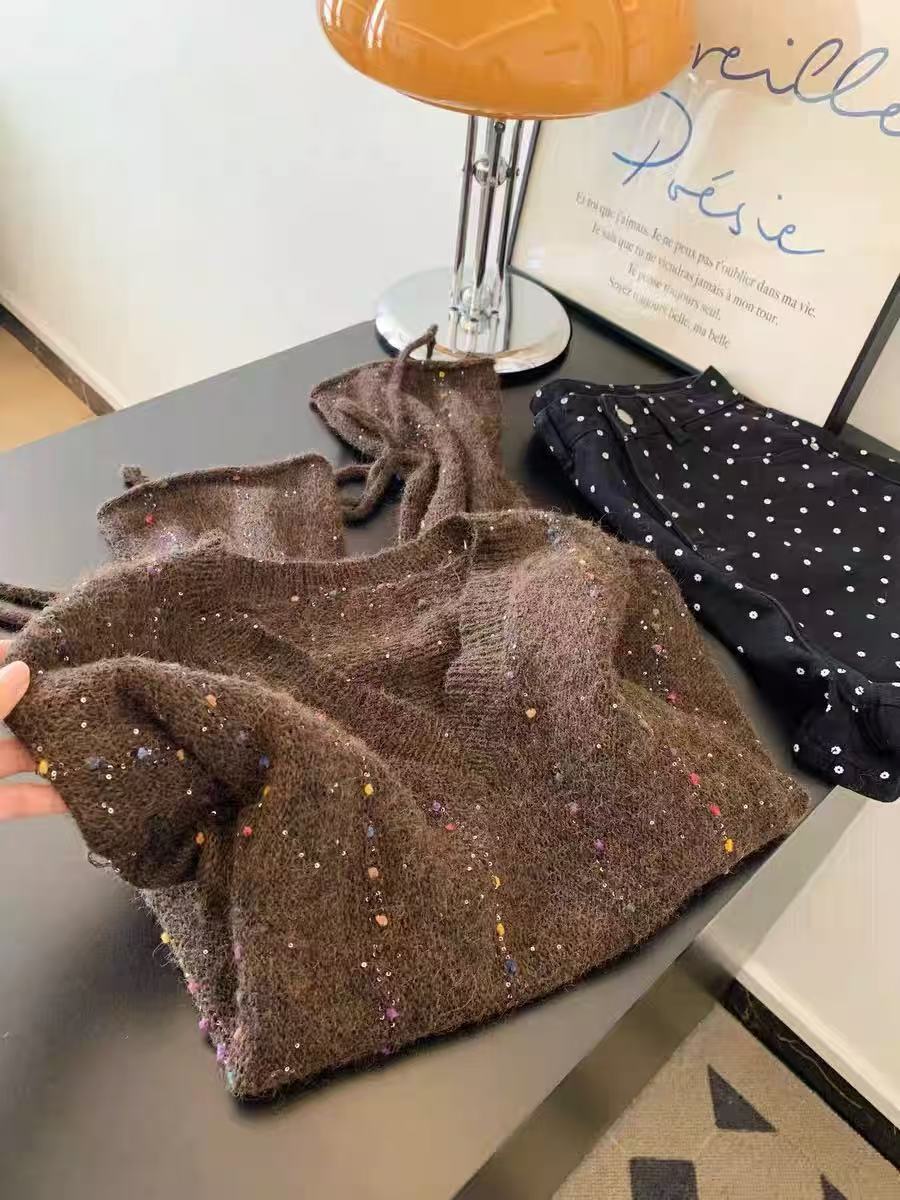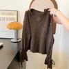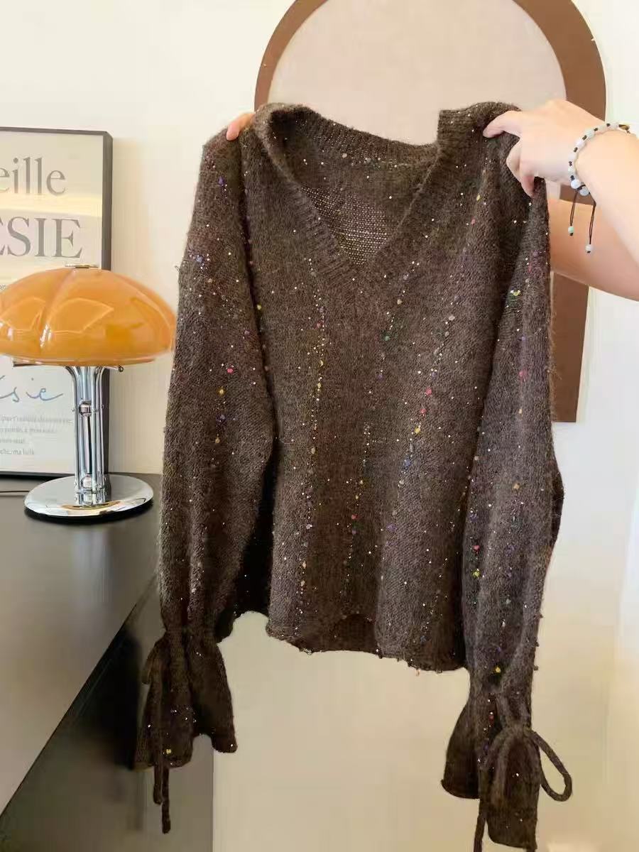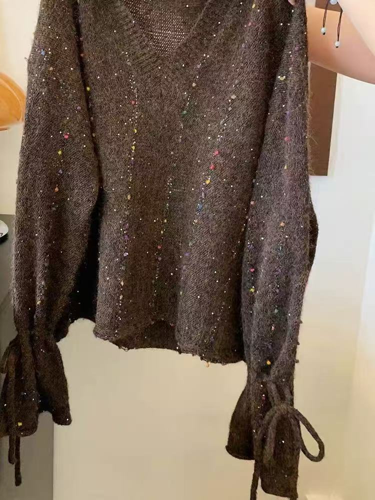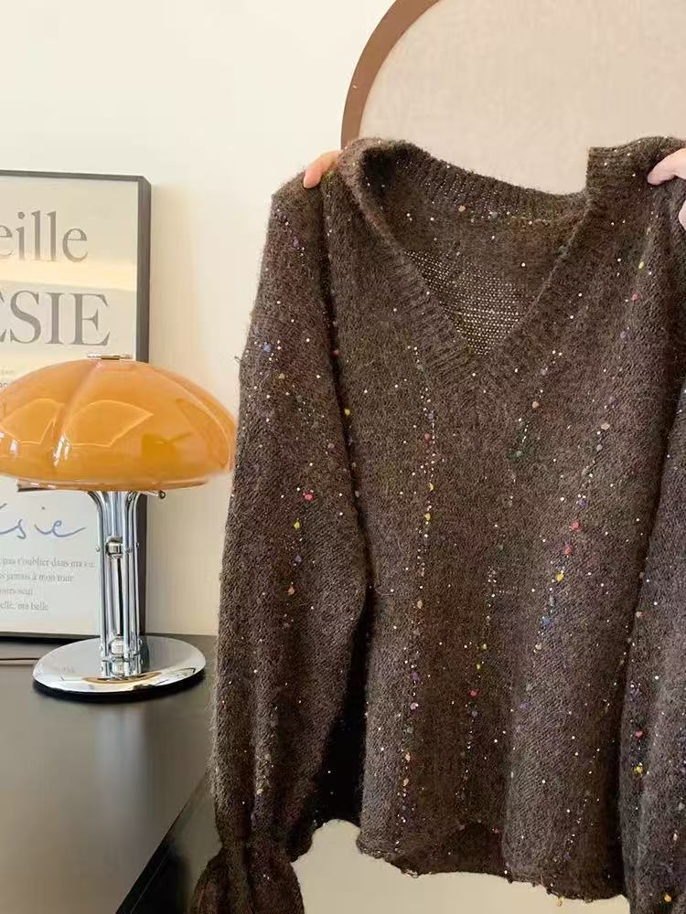 Suéter de manga linterna retro con cuello en V, manga larga, holgado, para exterior, para mujer, perezoso, de alta gama, grueso, tejido