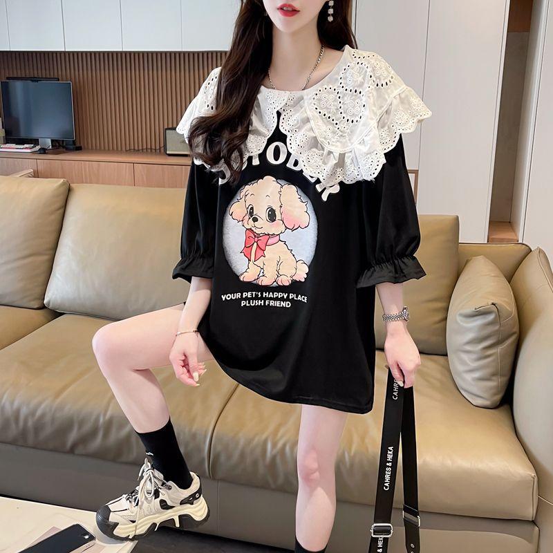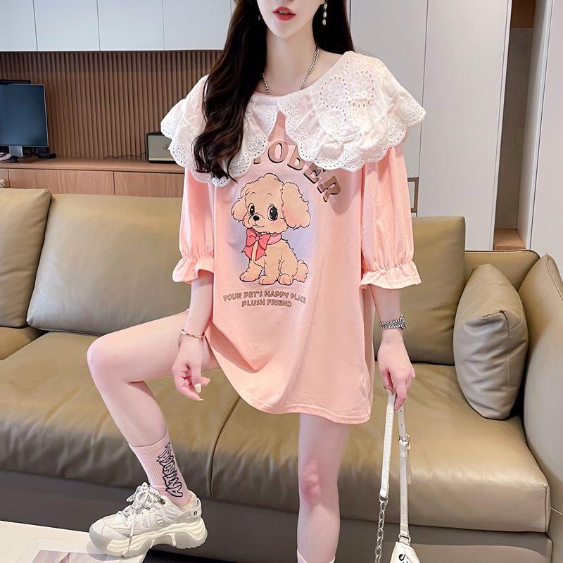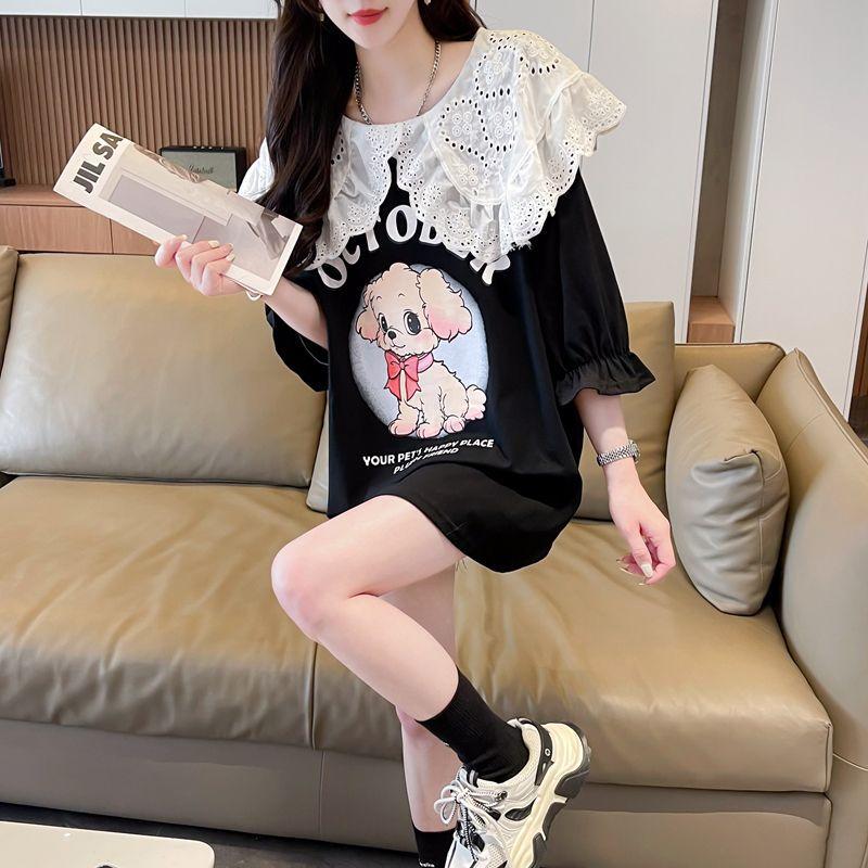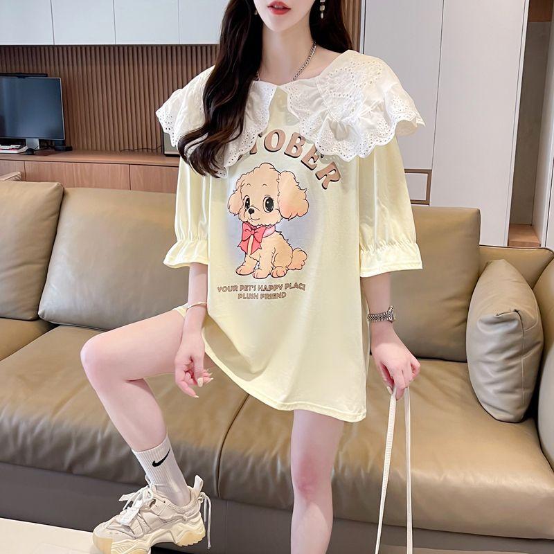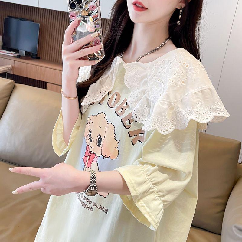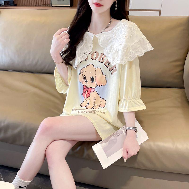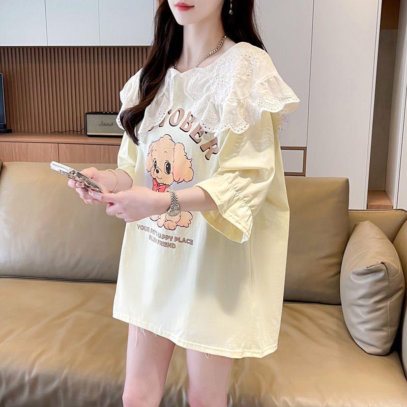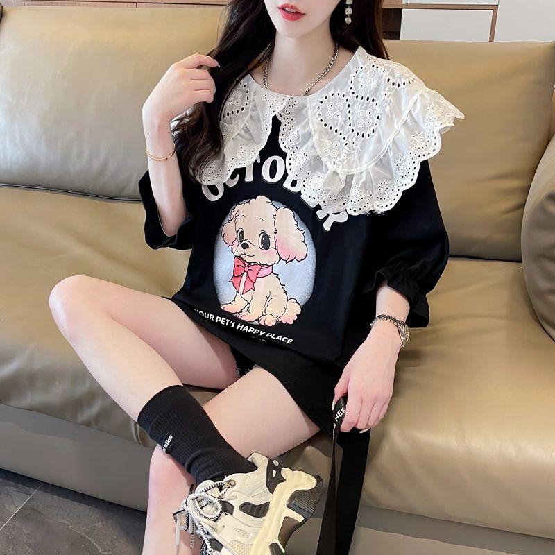 Camiseta de Manga Corta de Algodón Puro con Cuello de Muñeca Nicho de Moda para Mujer con Estampado de Dibujos Animados, Talla Grande, Top Versátil Elegante