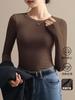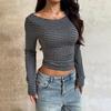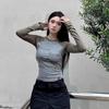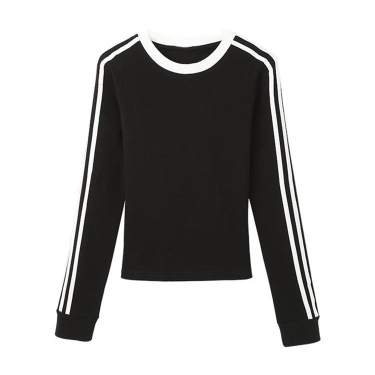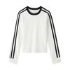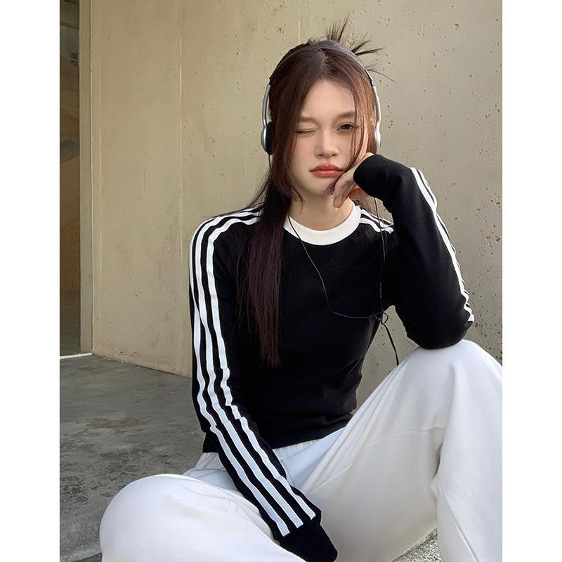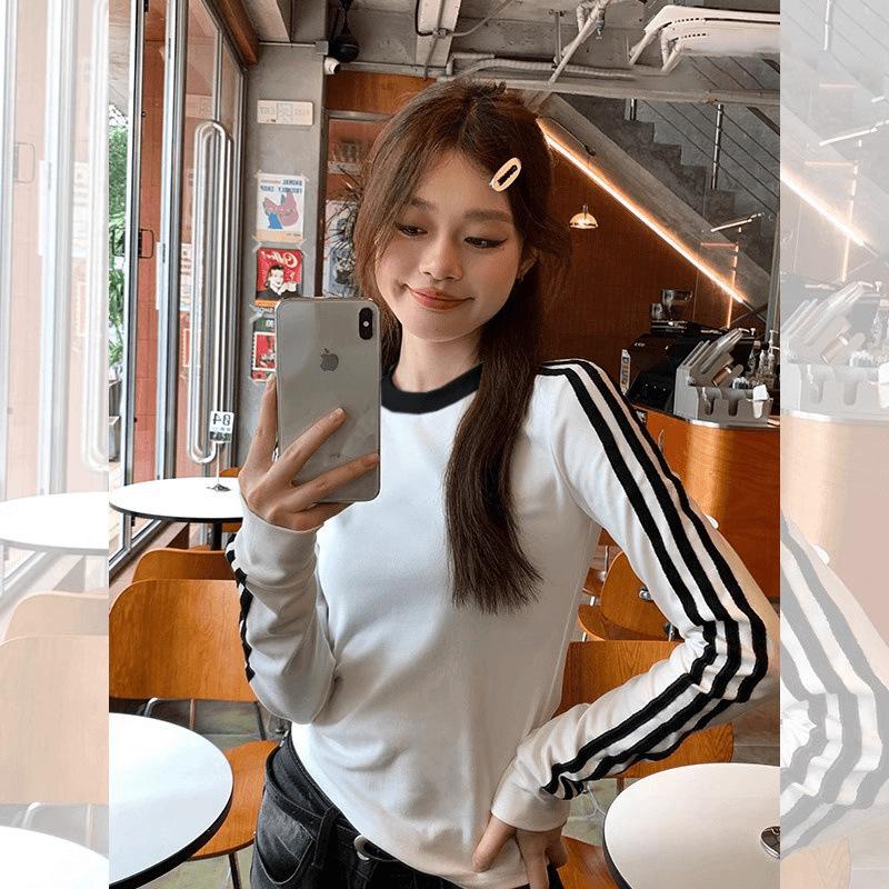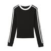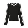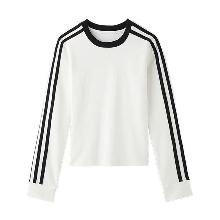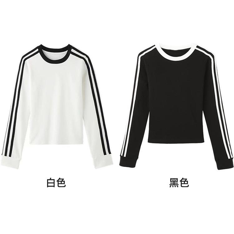 2025 Primavera y Otoño Camiseta de Manga Larga Tres Rayas Mujer Adelgazante Chica Caliente Bloque de Color Casual Cuello Redondo Parche Top Tendencia