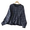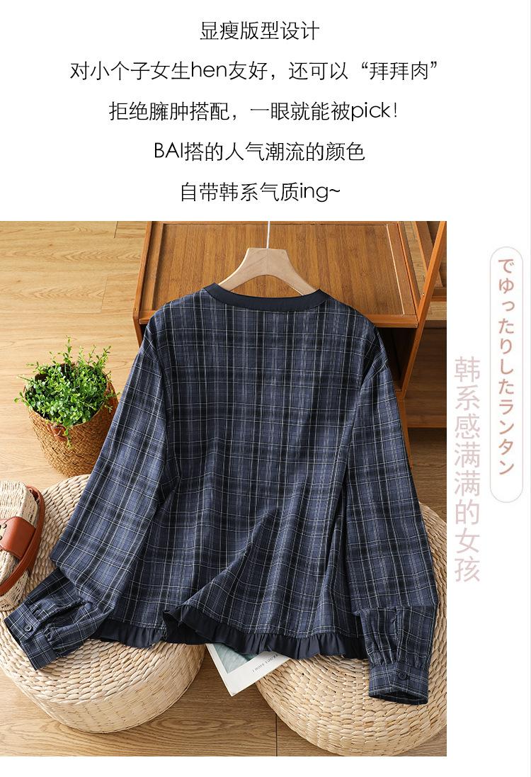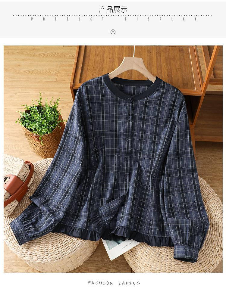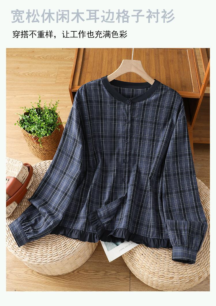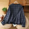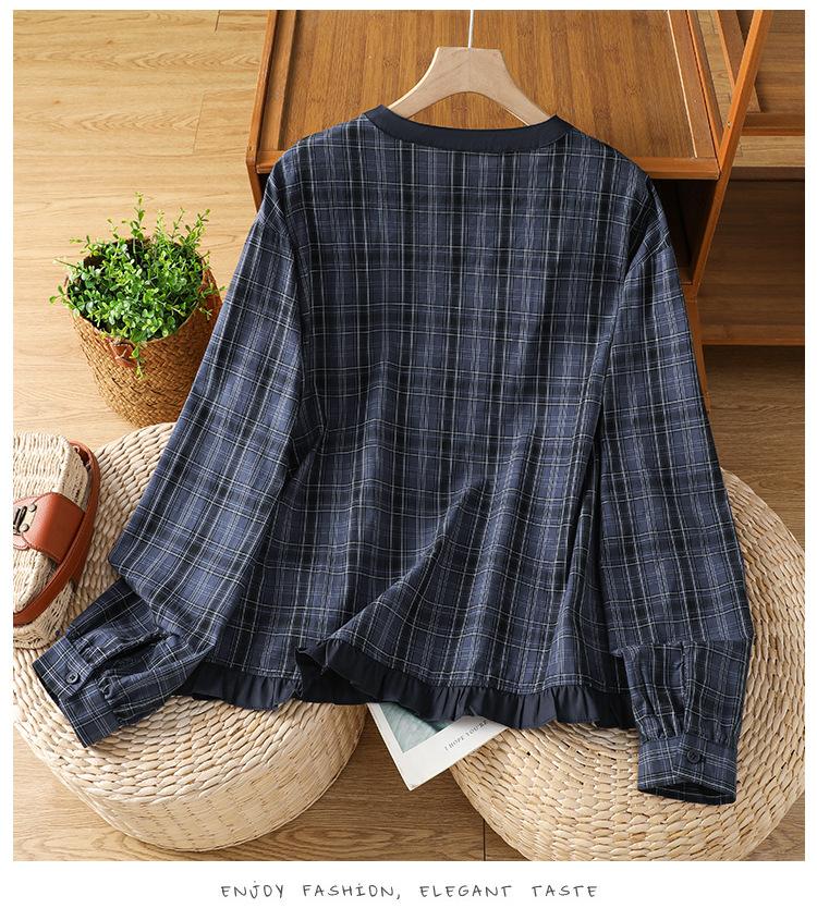 Foto Real 2025 Camisa Casual Simple a Cuadros Otoño Suelta Casual Cuello Redondo Top con Borde de Volantes Mujer