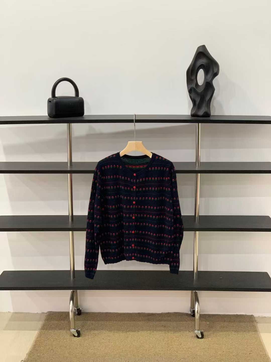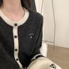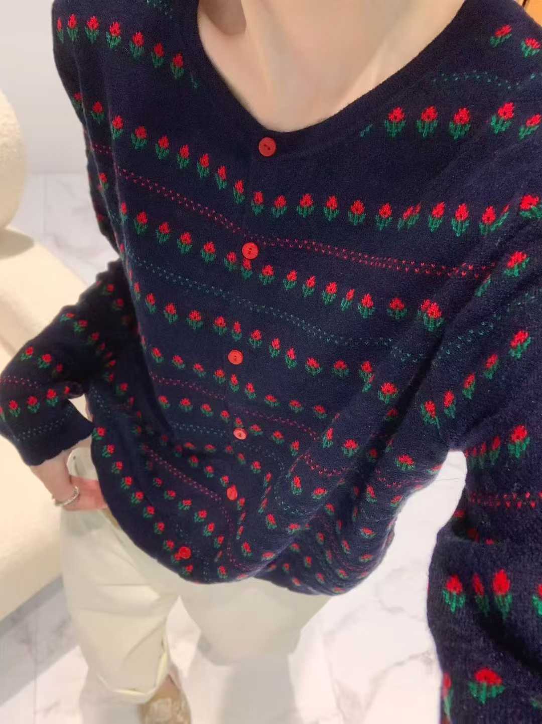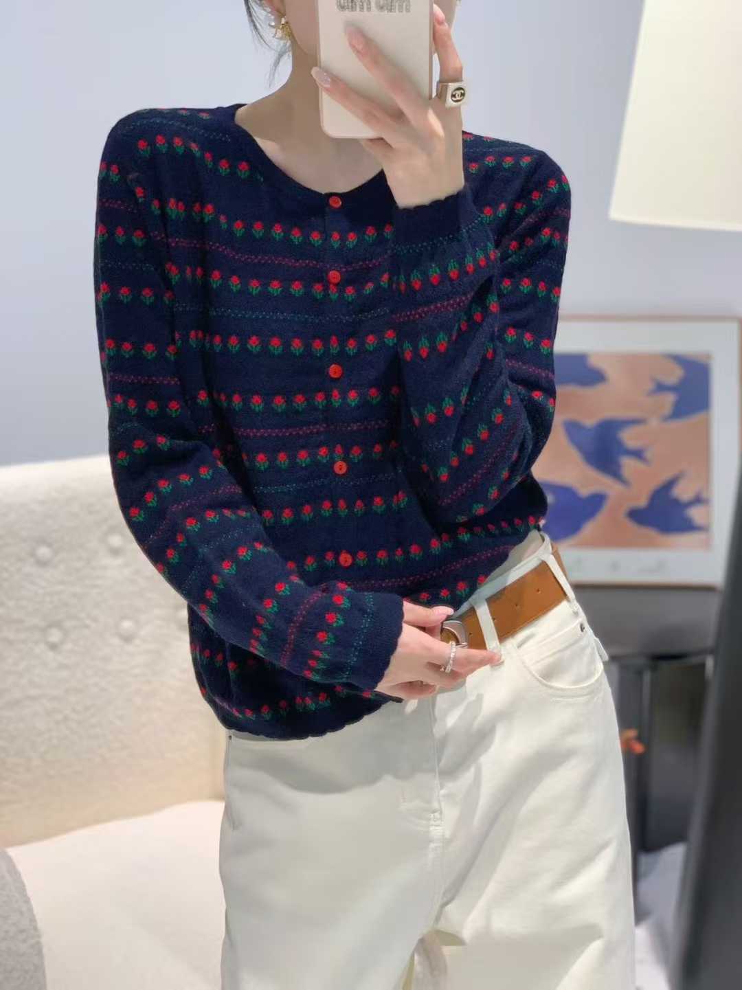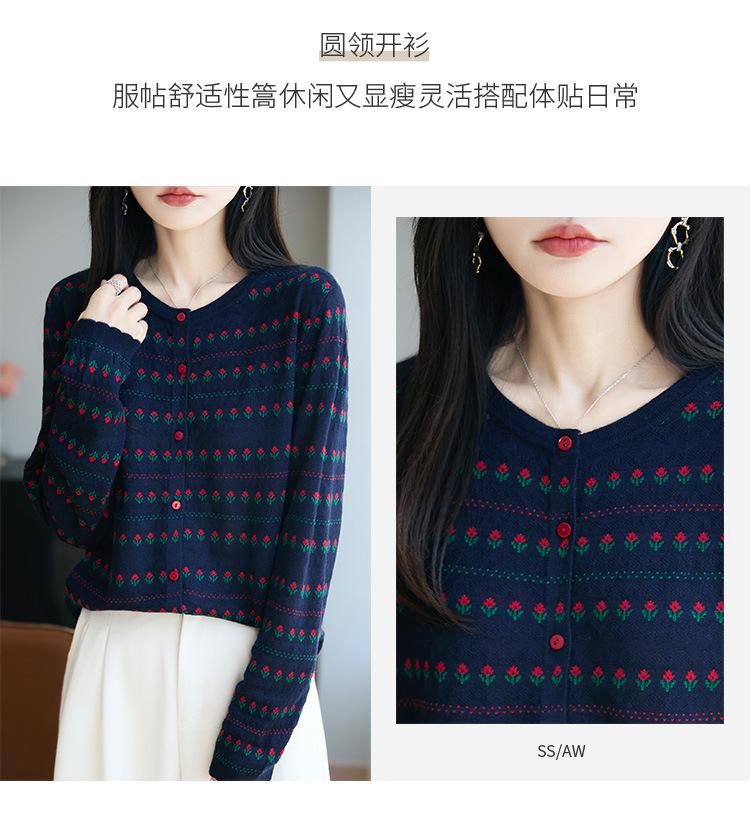 Cárdigan de Punto Nuevo de Otoño Temprano Bordado Flores Pequeñas Bloque de Color Chaqueta Manga Larga Casual Cuello Redondo Top Adelgazante Versátil