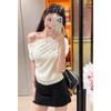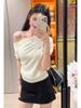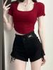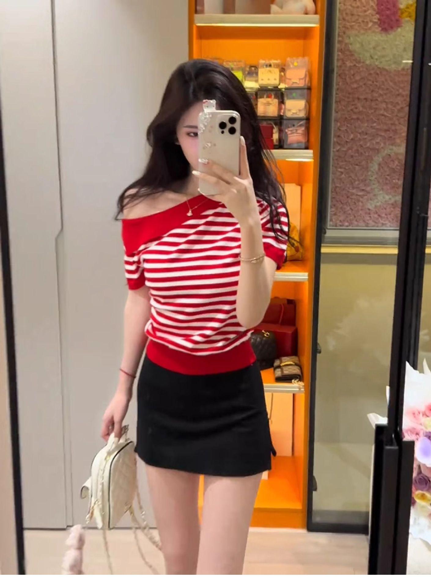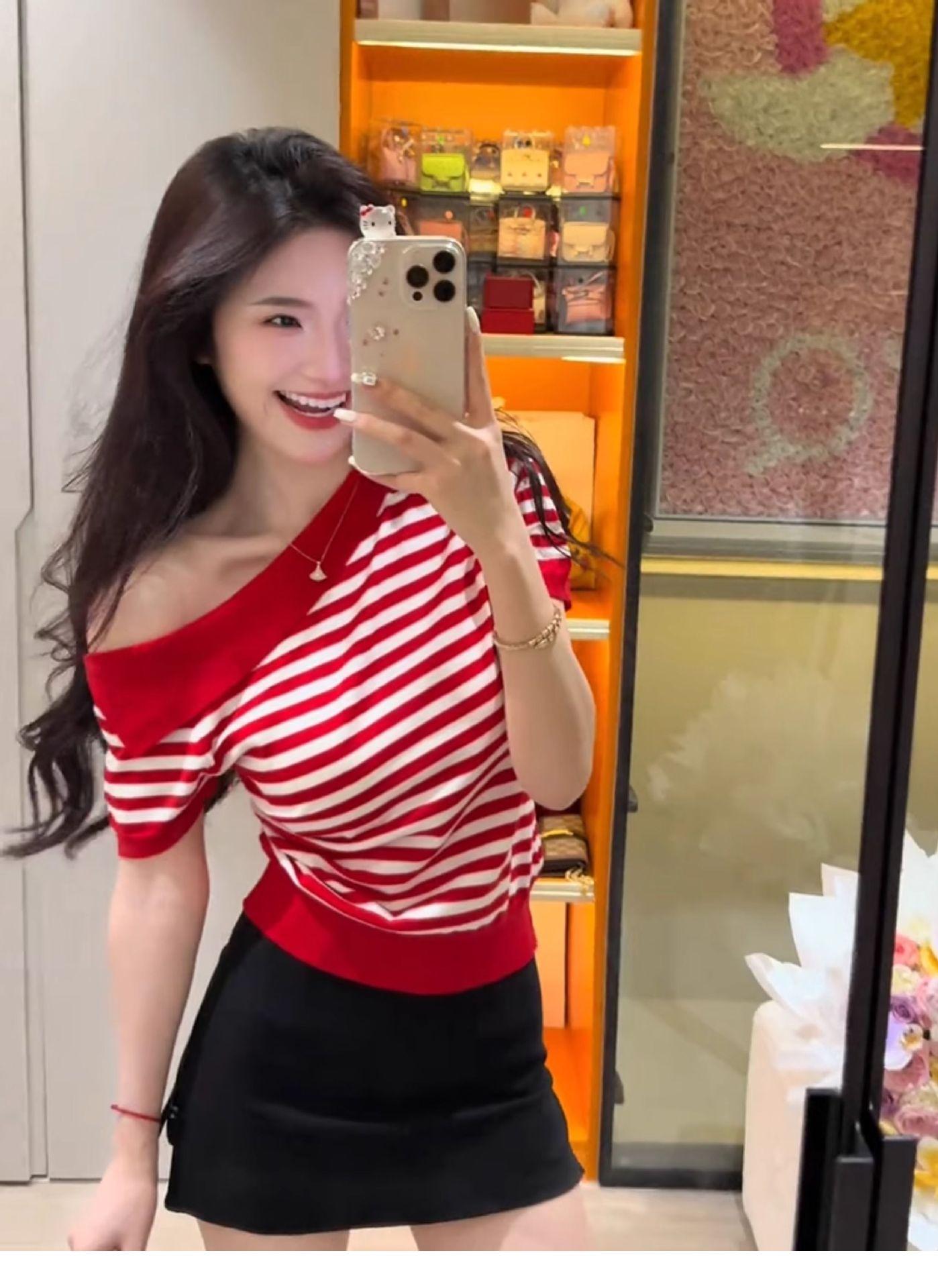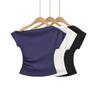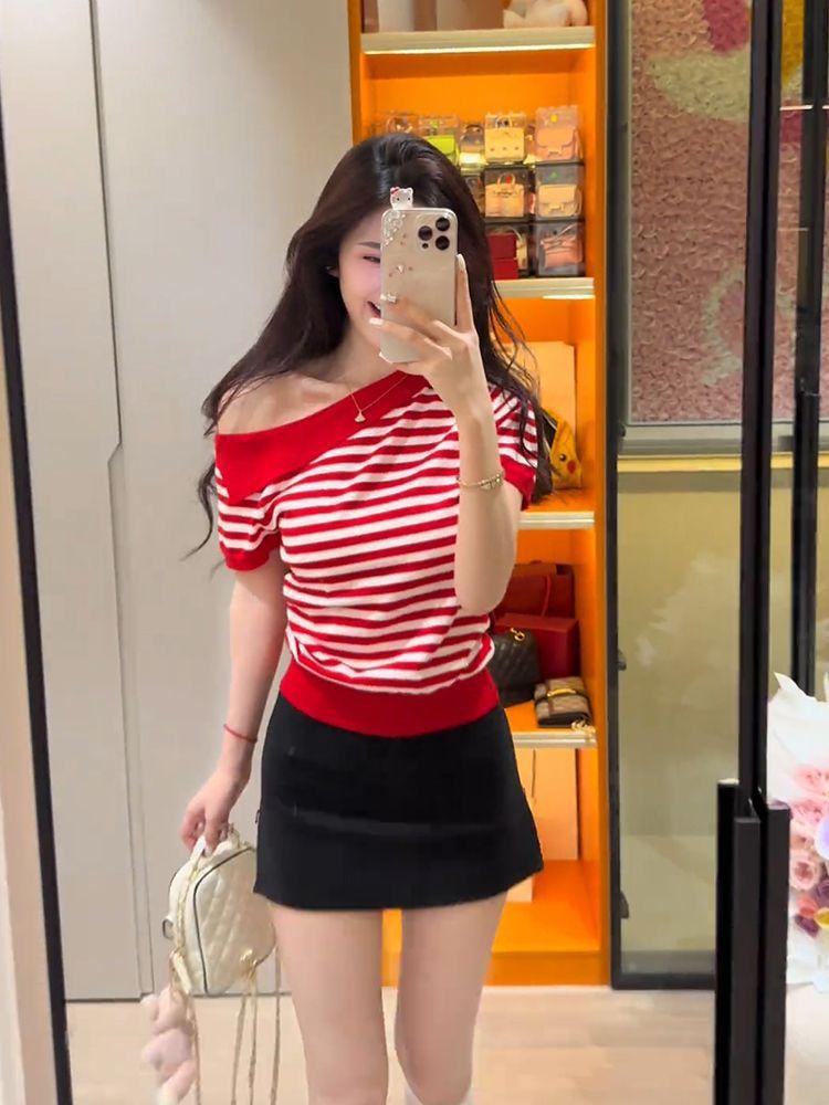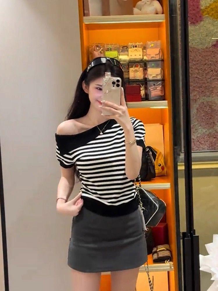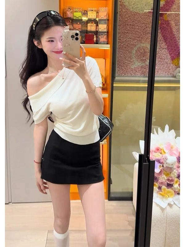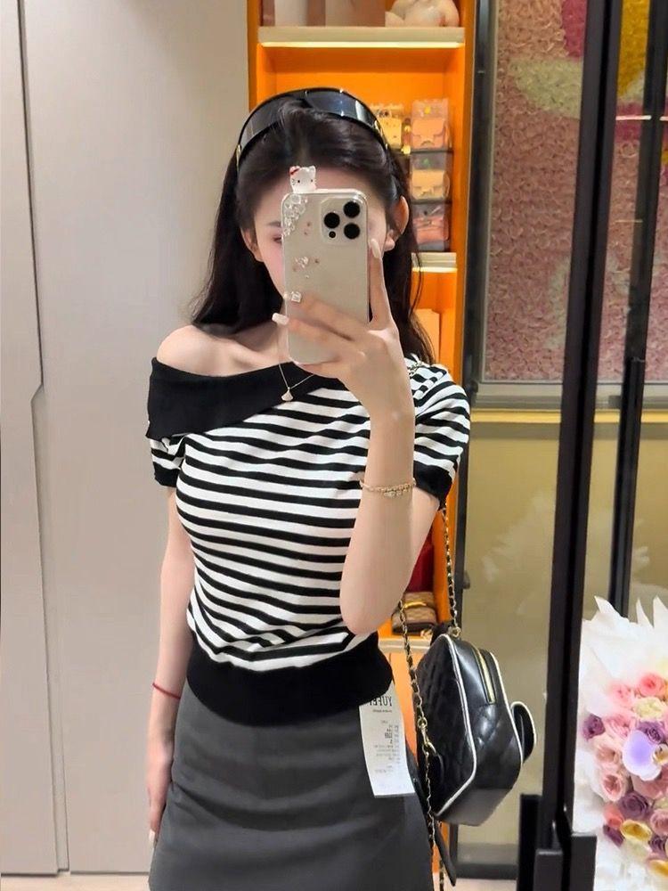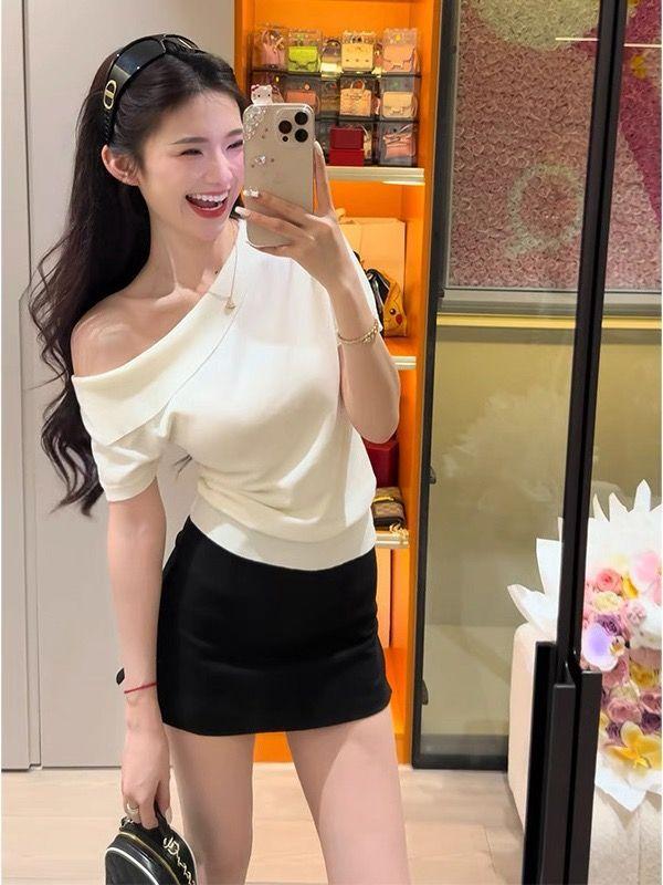 Playera de Manga Corta con Un Hombro Descubierto, Pura y Sexy para Mujer, Verano, Diseño Ajustado, Sentido de la Moda, Bloque de Color, Muestra la Clavícula, Temperamento, Tendencia Superior