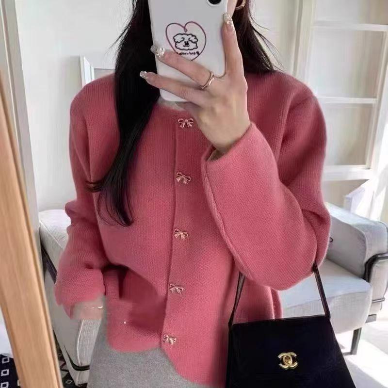 Compra Cárdigan de punto estilo Chanel pequeño francés con lazo otoño e invierno nuevo hebilla metálica elegante versátil suéter holgado abrigo mujeres al por mayor en Joom.pro