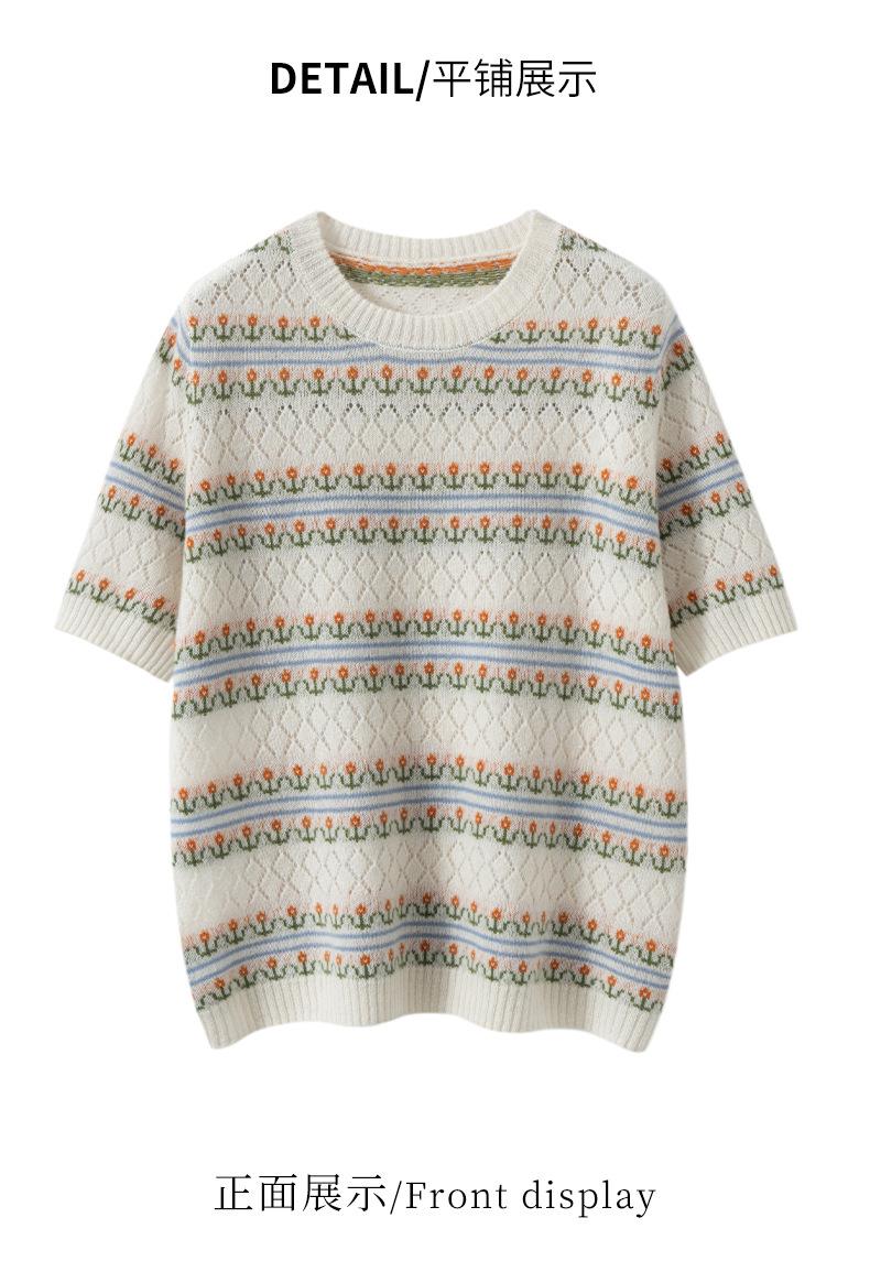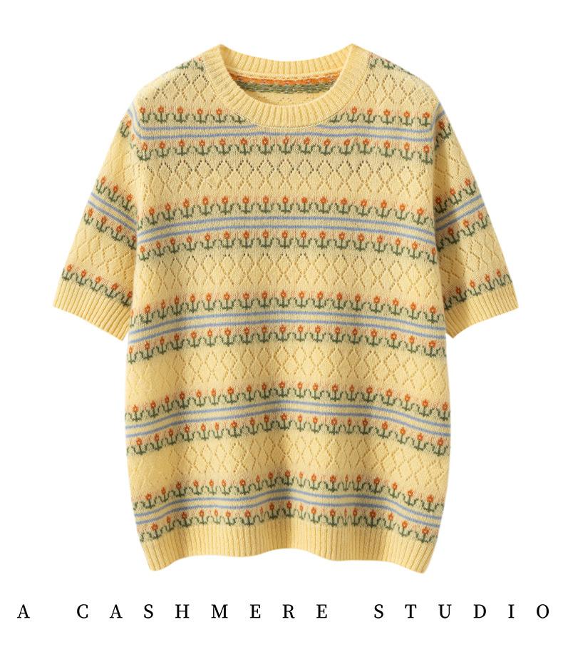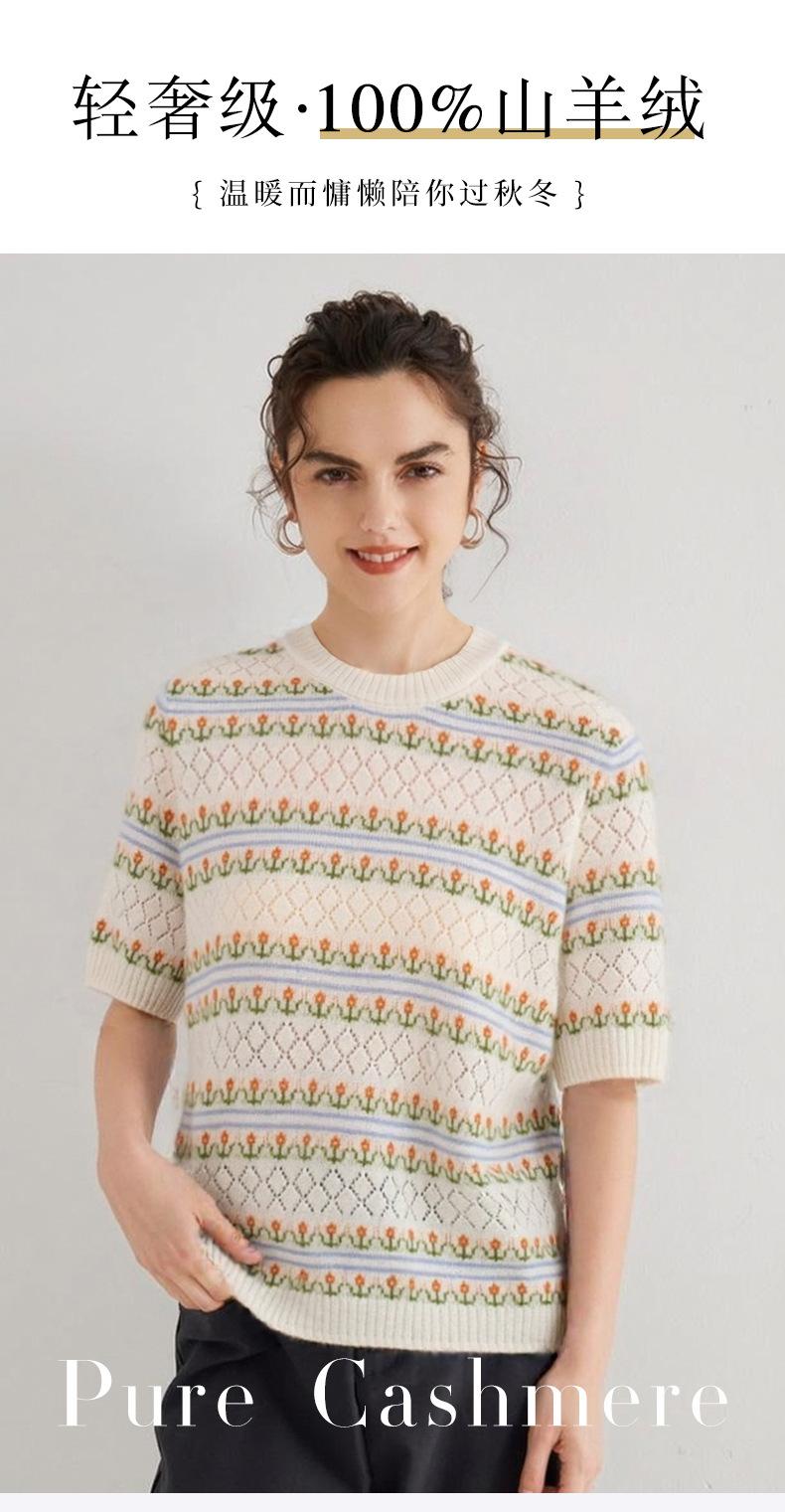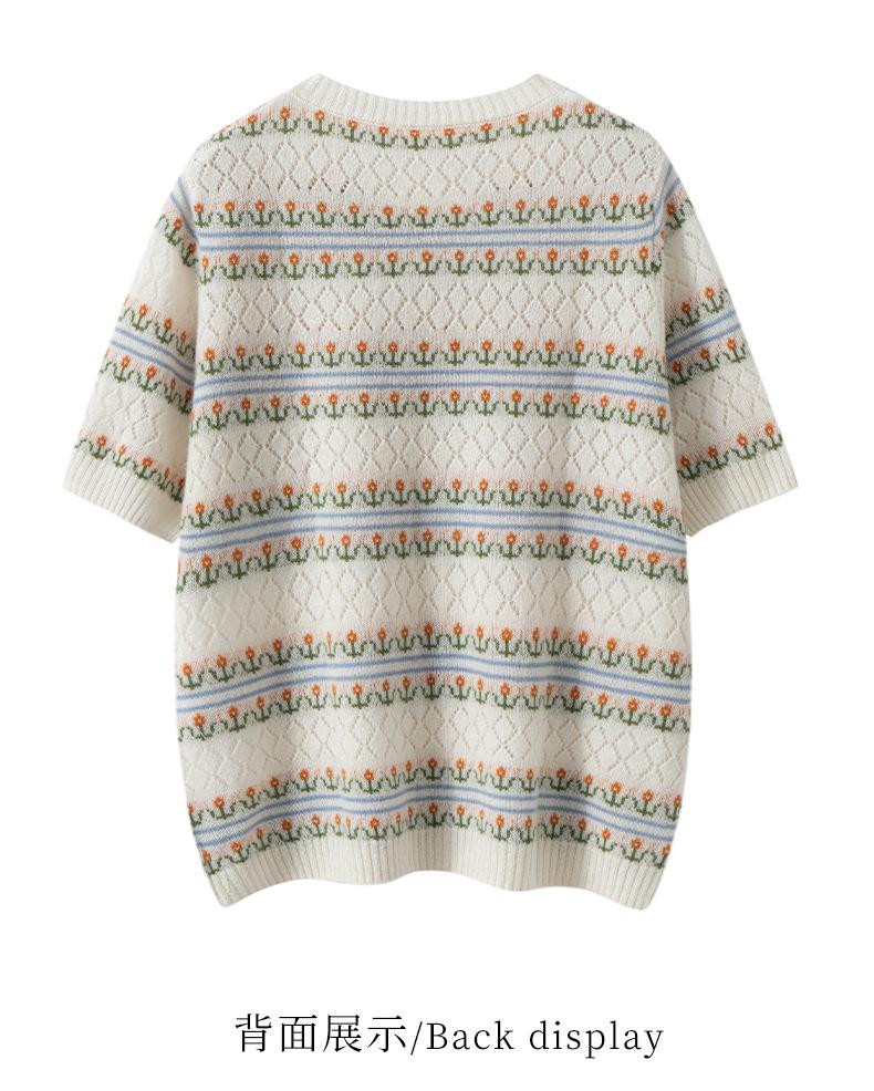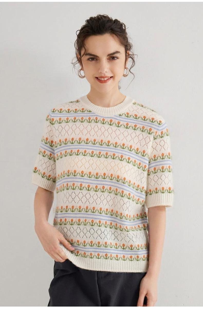 Nuevo Otoño e Invierno Casual Versátil Rayado Jacquard Cuello Redondo Jersey Tejido de Cachemira Suéter de Cachemira Pura de Manga Corta para Mujer