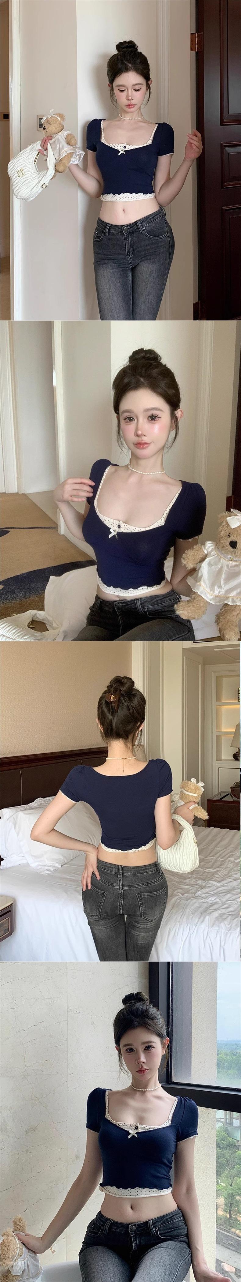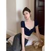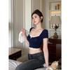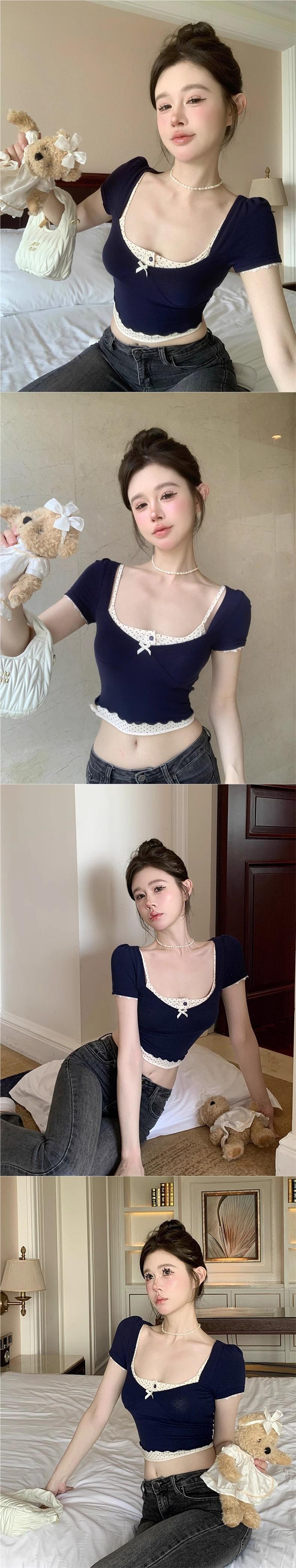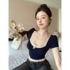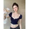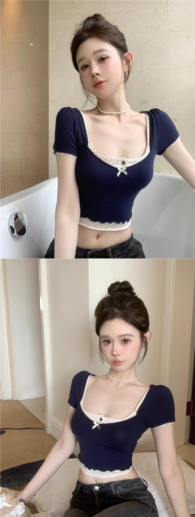 Top corto de cintura alta para chica caliente pura y sexy, camiseta de manga corta, diseño de camisola de lunares, sentido del diseño, nicho de dos piezas falsas, top absolutamente hermoso