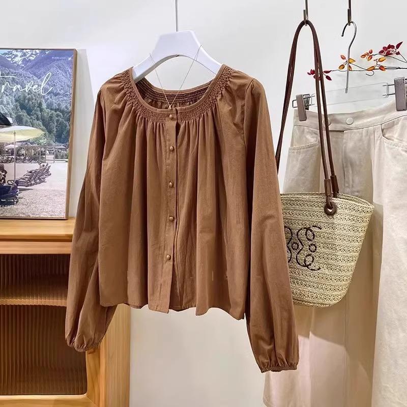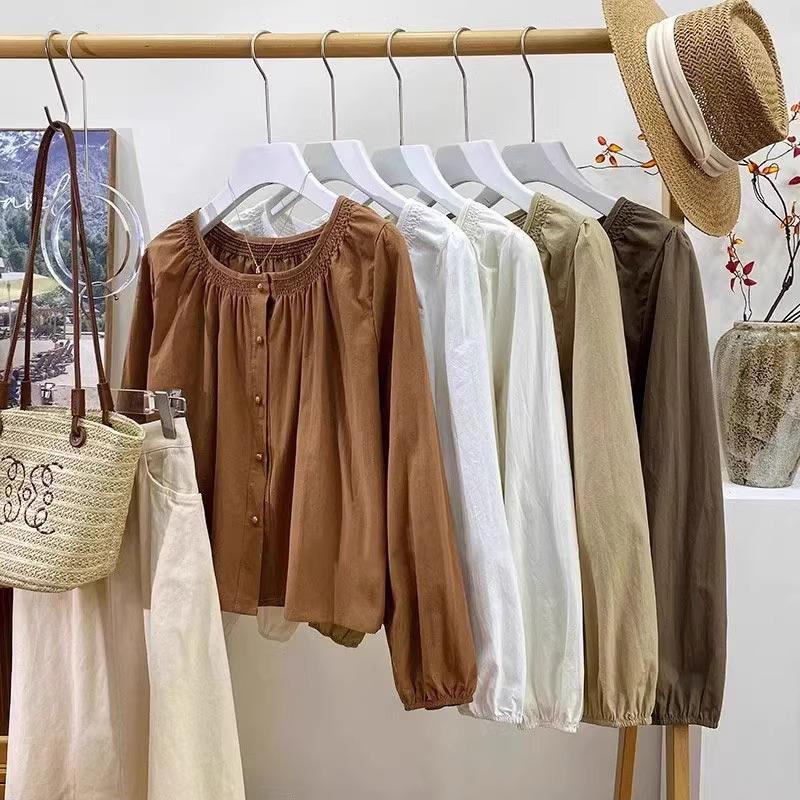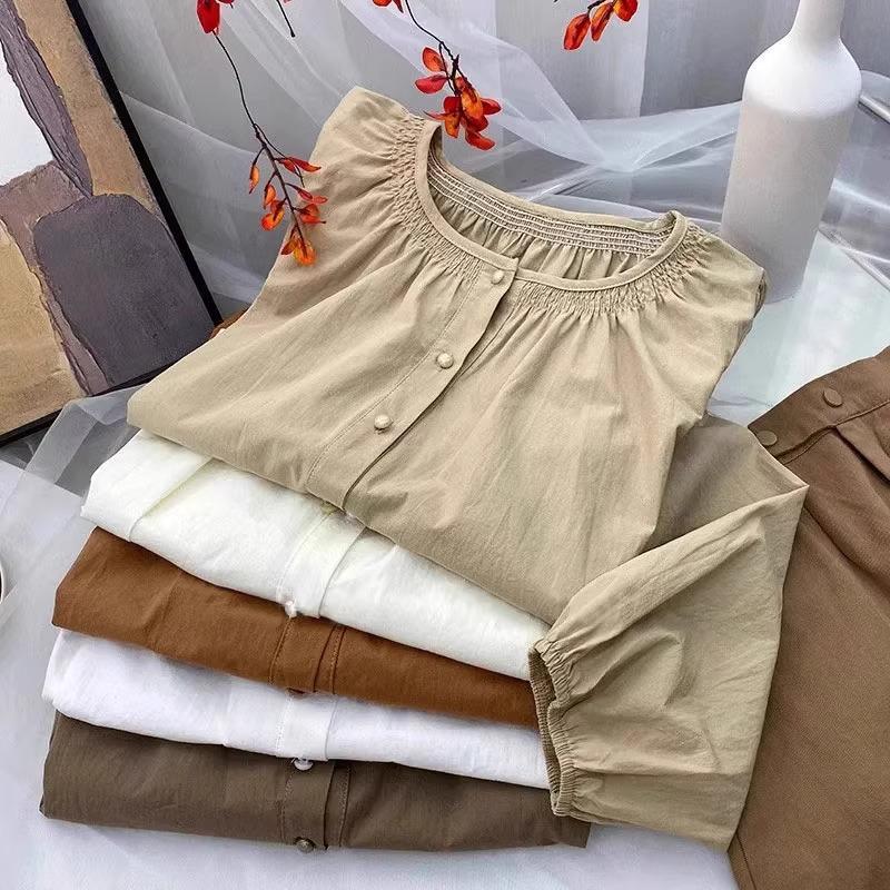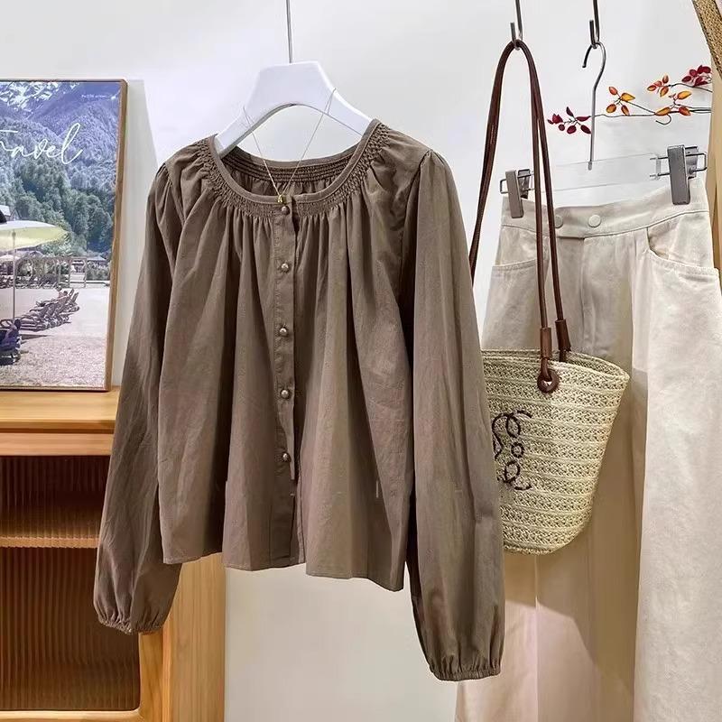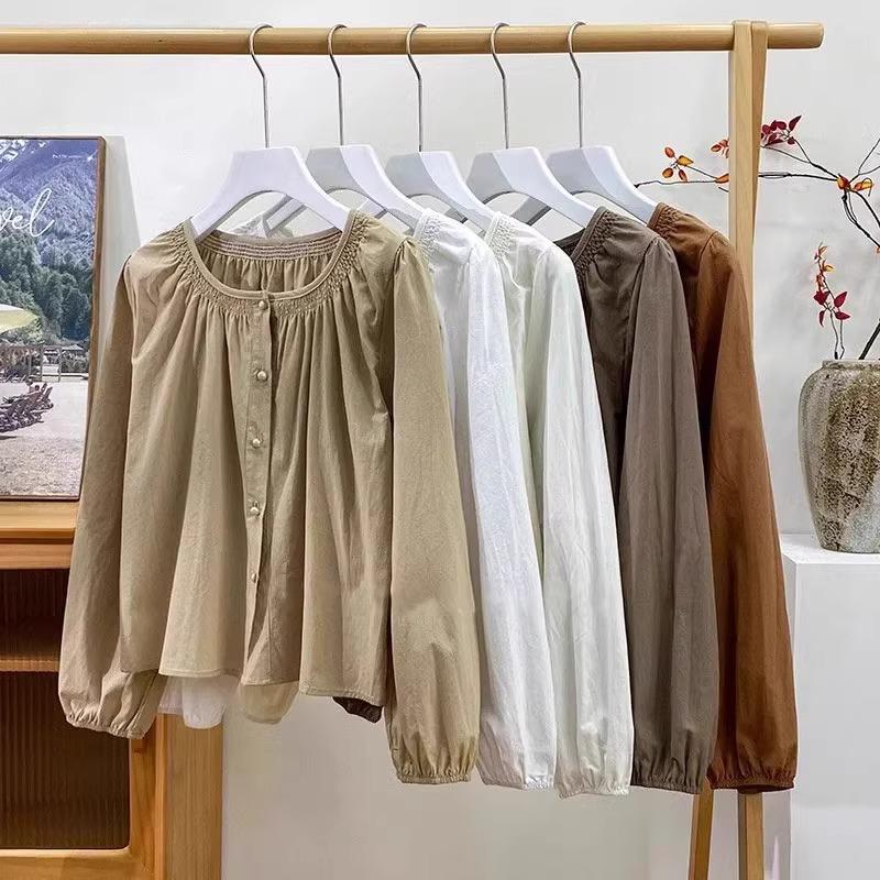 Camiseta de Algodón Cuello Redondo para Mujer Nuevo Estilo Coreano Combinable Color Sólido Monopetalera Manga Larga Top Camiseta Pequeña para Mujer A2992