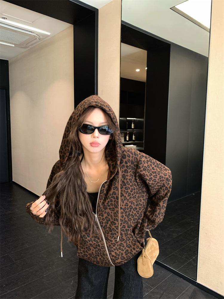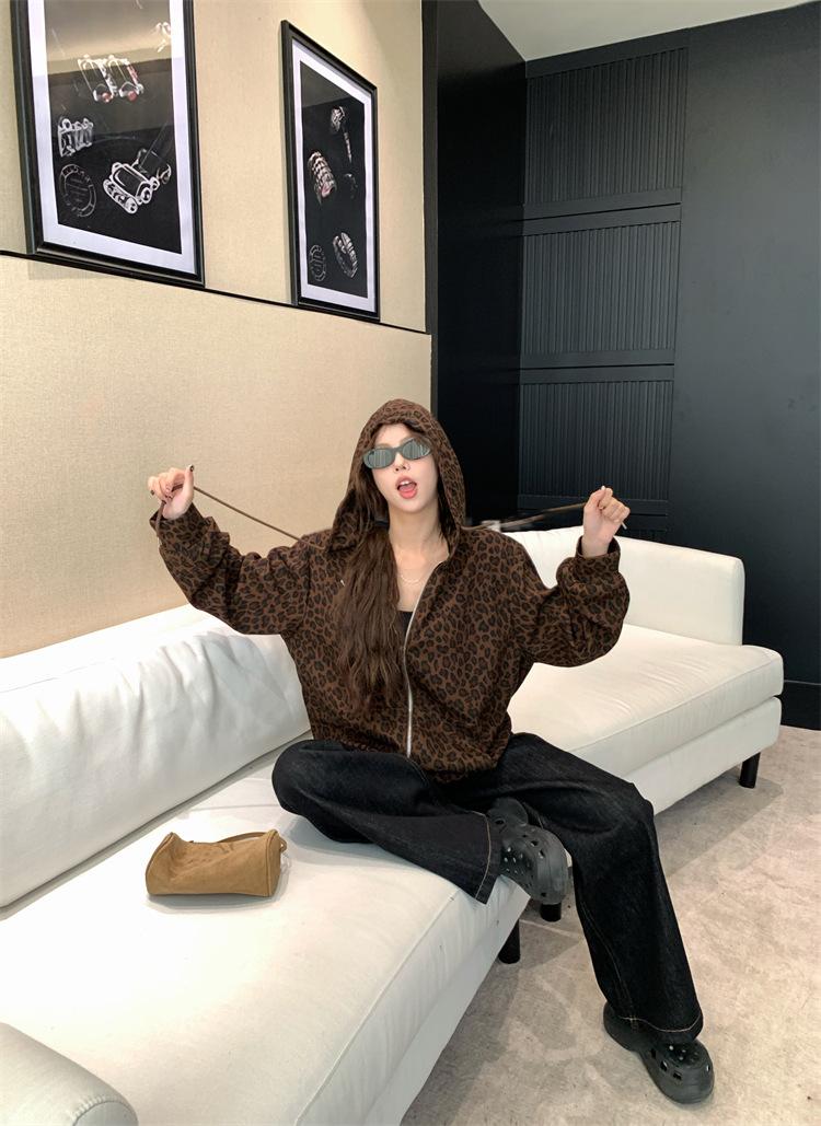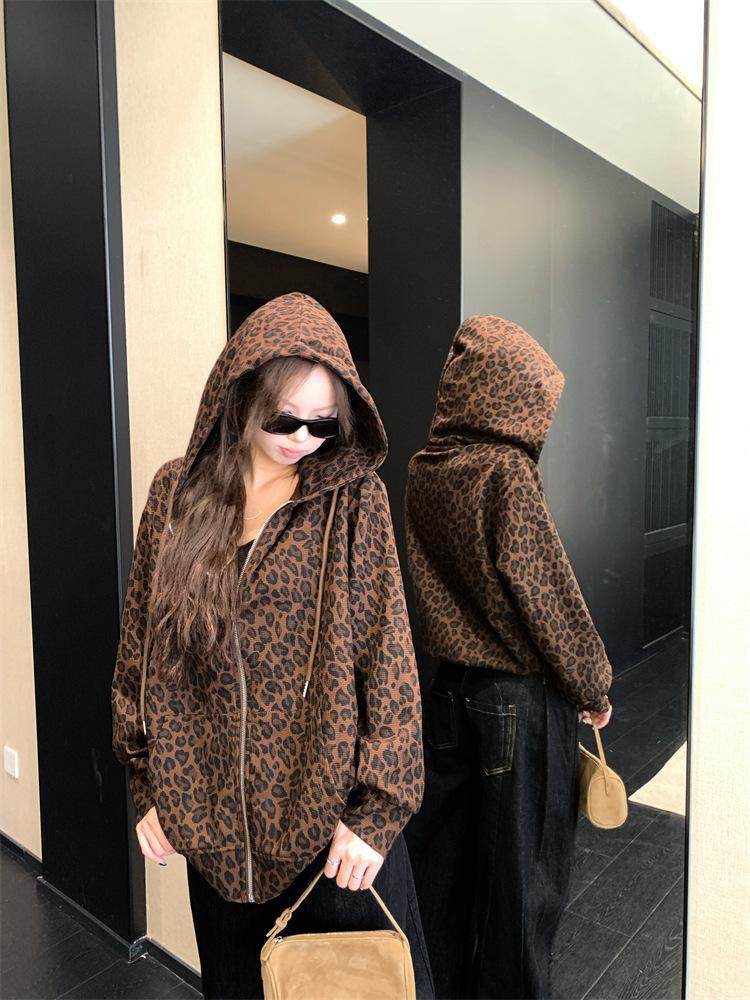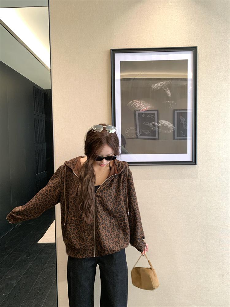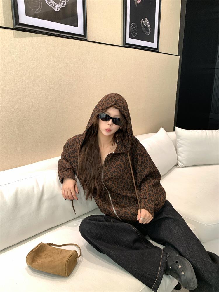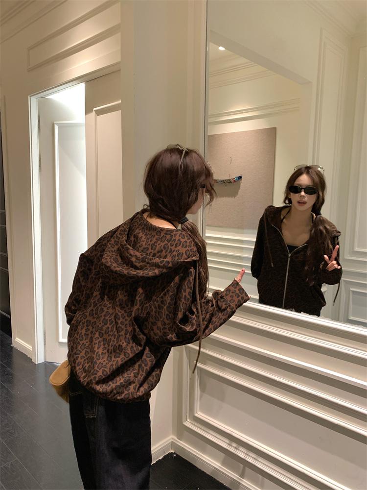 Foto en vivo~ Sudadera casual con capucha y cremallera de principios de otoño retro americano con estampado de leopardo para mujer, holgada, estilo coreano, ropa de mujer