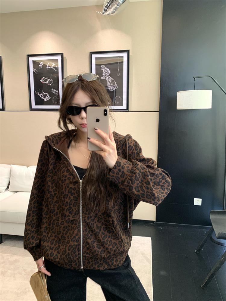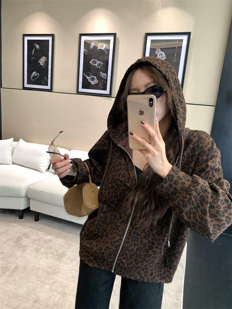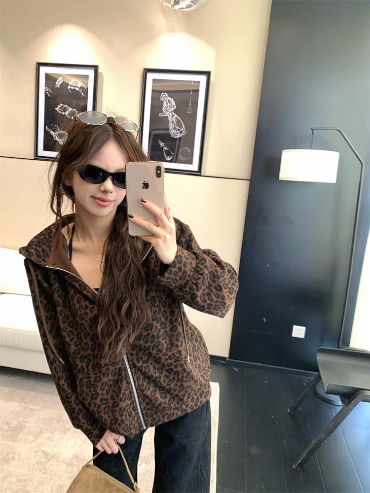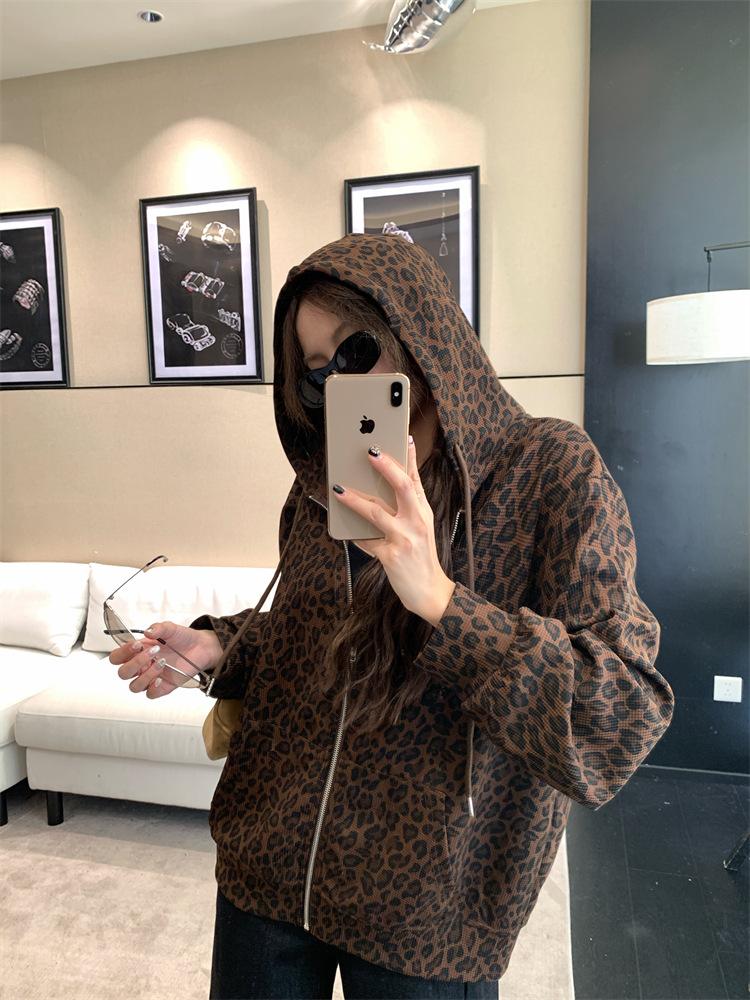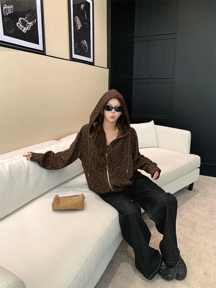 Foto en vivo~ Sudadera casual con capucha y cremallera de principios de otoño retro americano con estampado de leopardo para mujer, holgada, estilo coreano, ropa de mujer