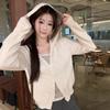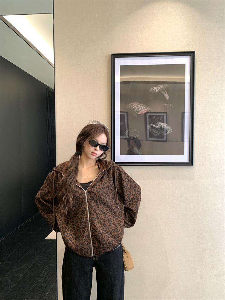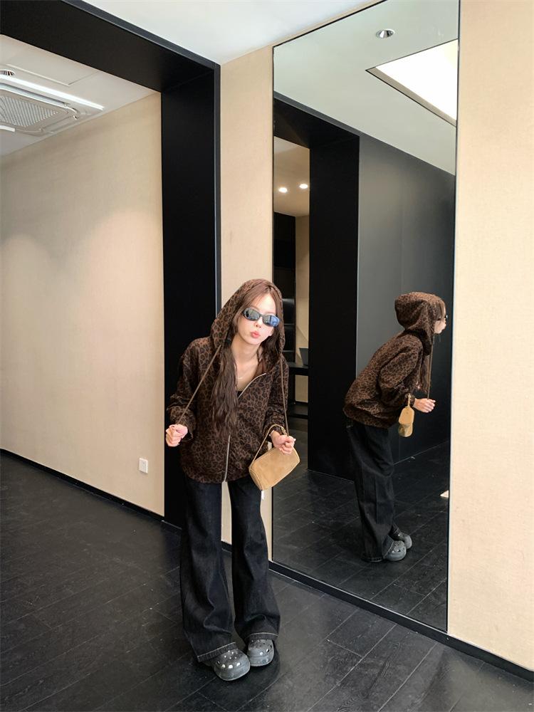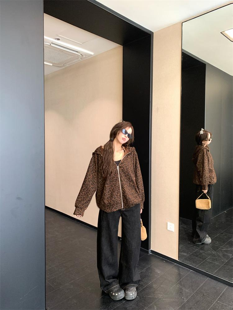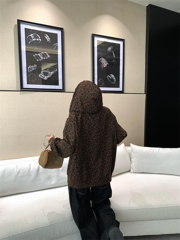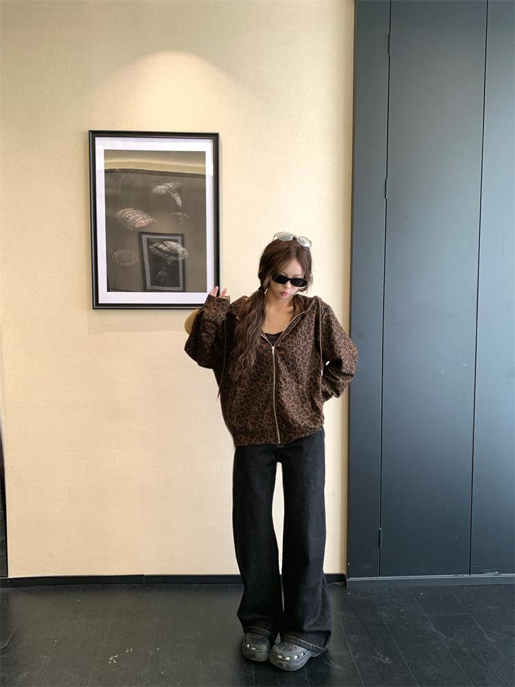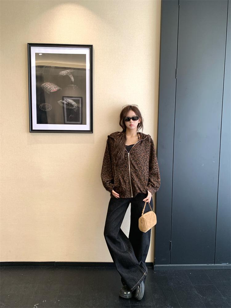Foto en vivo~ Sudadera casual con capucha y cremallera de principios de otoño retro americano con estampado de leopardo para mujer, holgada, estilo coreano, ropa de mujer