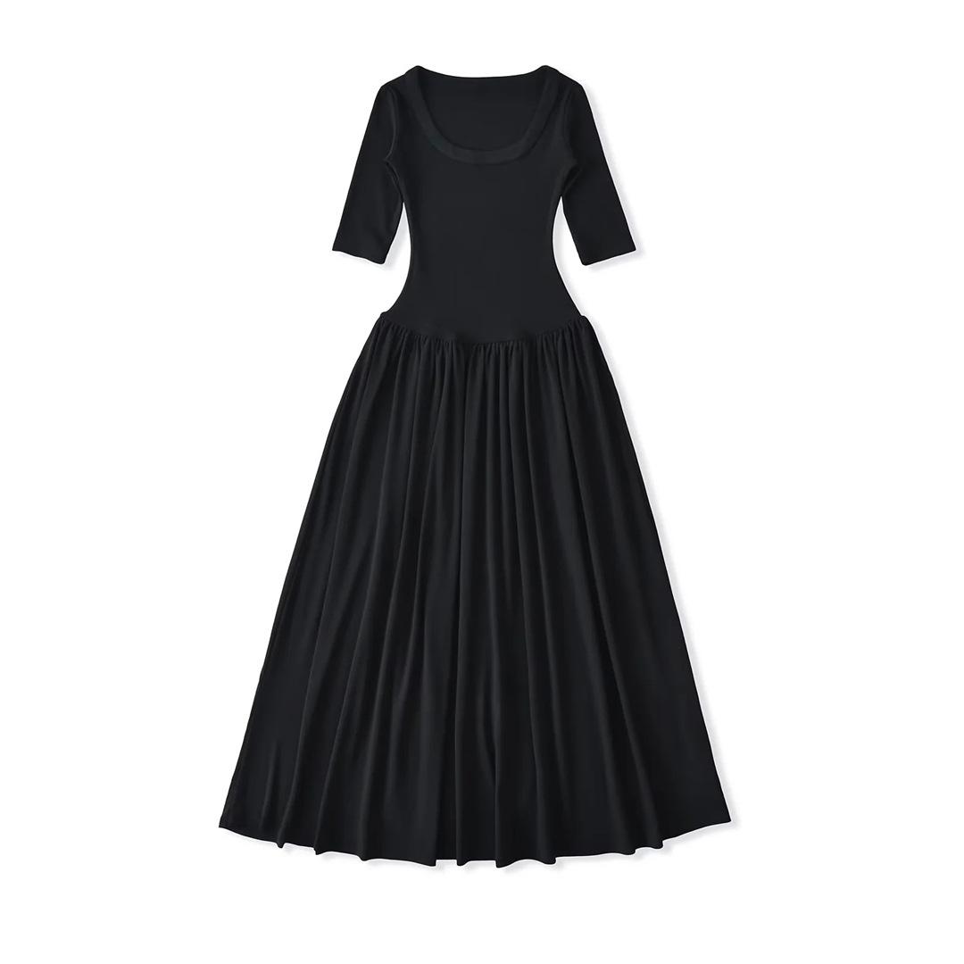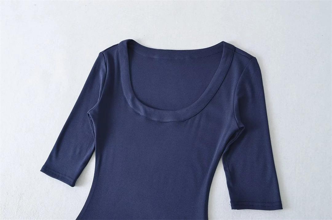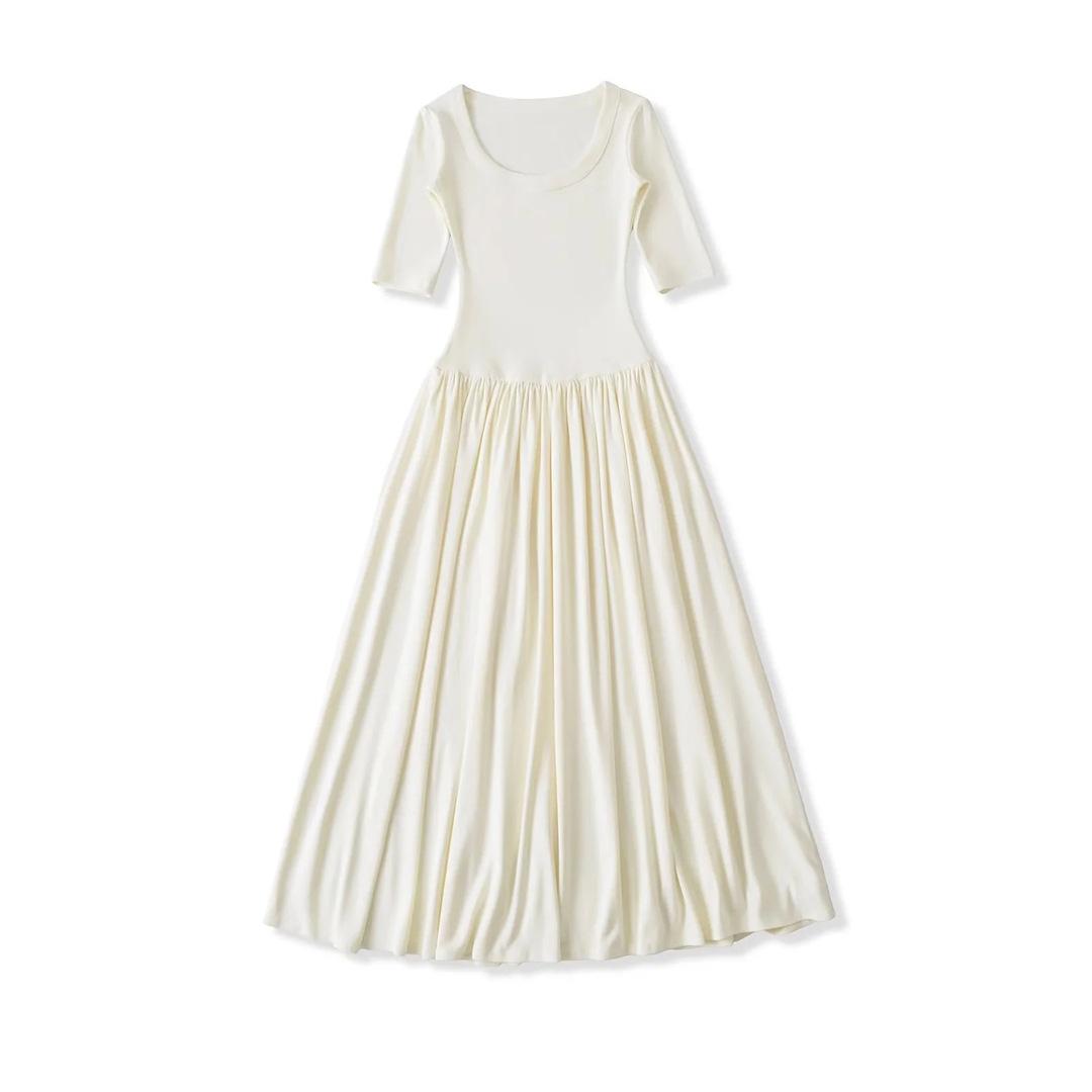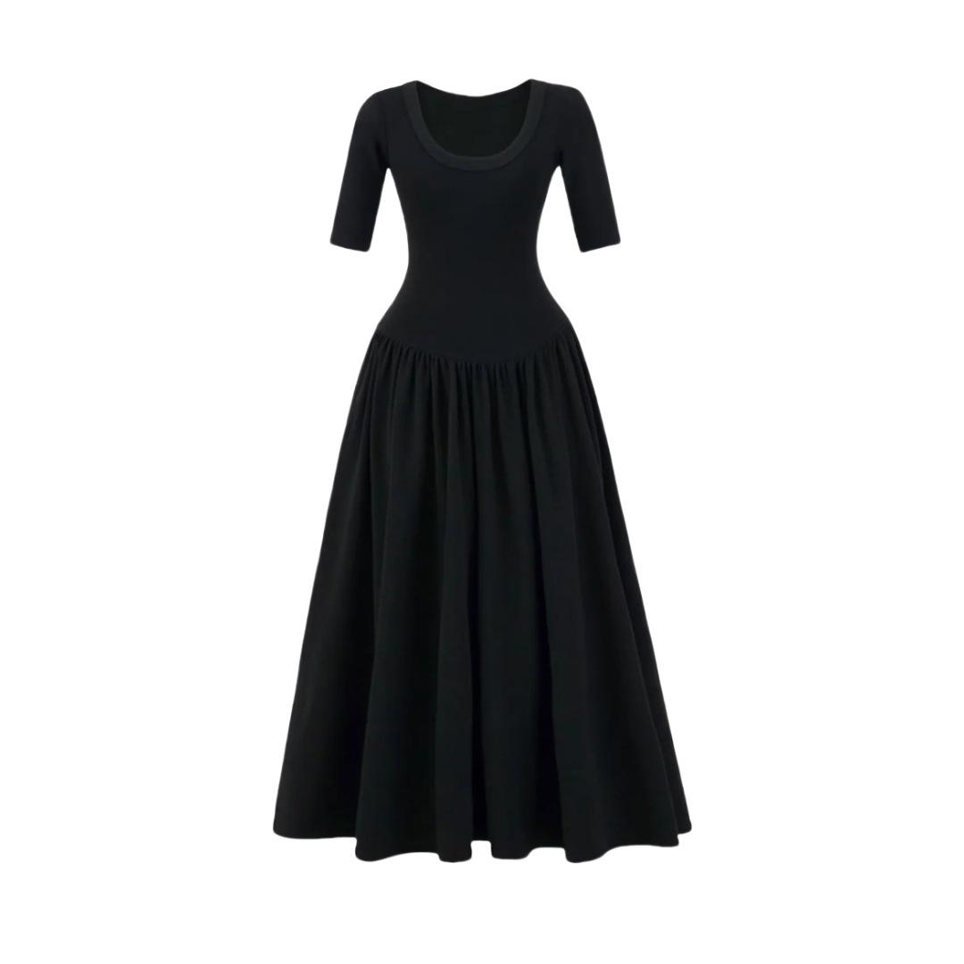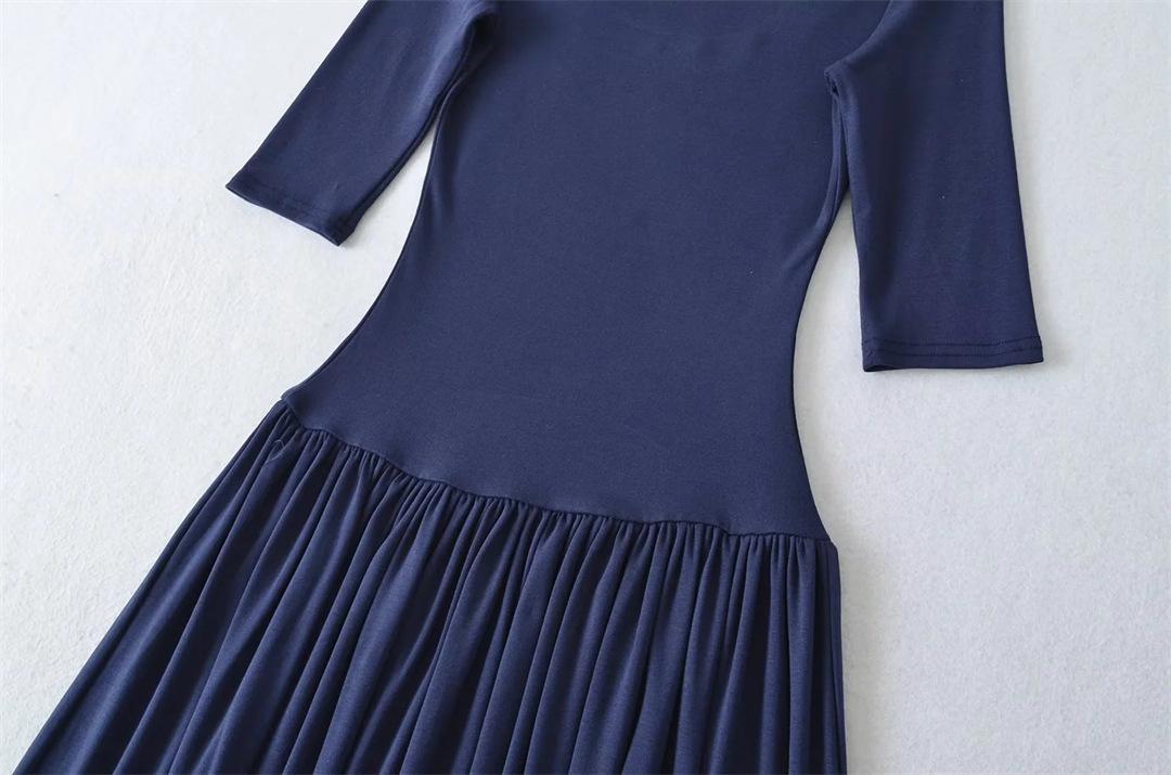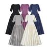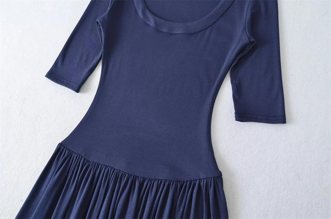 Vestido Sexy de Color Sólido Estilo Francés con Cuello en U Escotado de Manga Media con Temperamento Elástico, Corte Ajustado, Parcheado, Fruncido y Falda Larga Acampanada