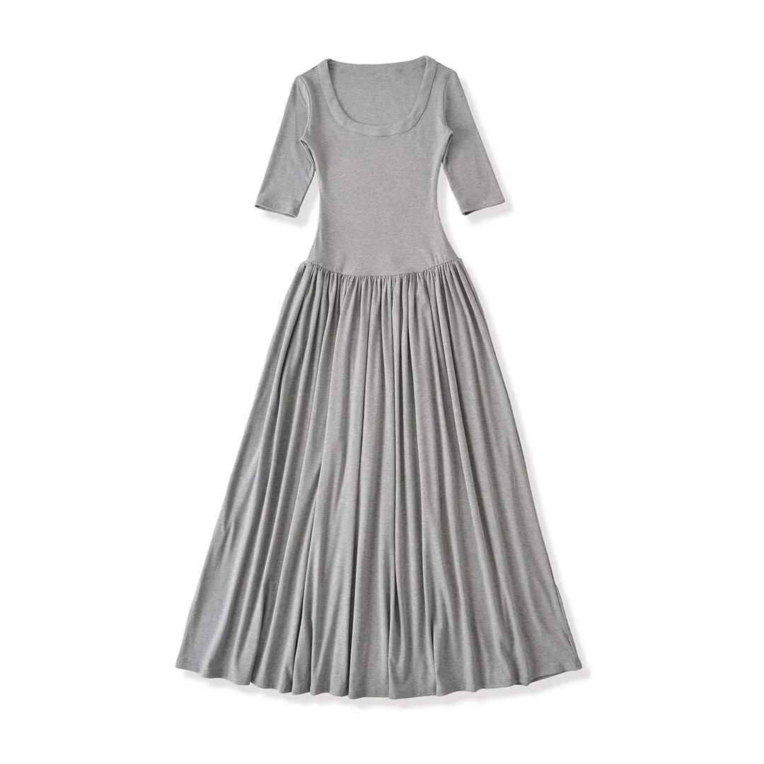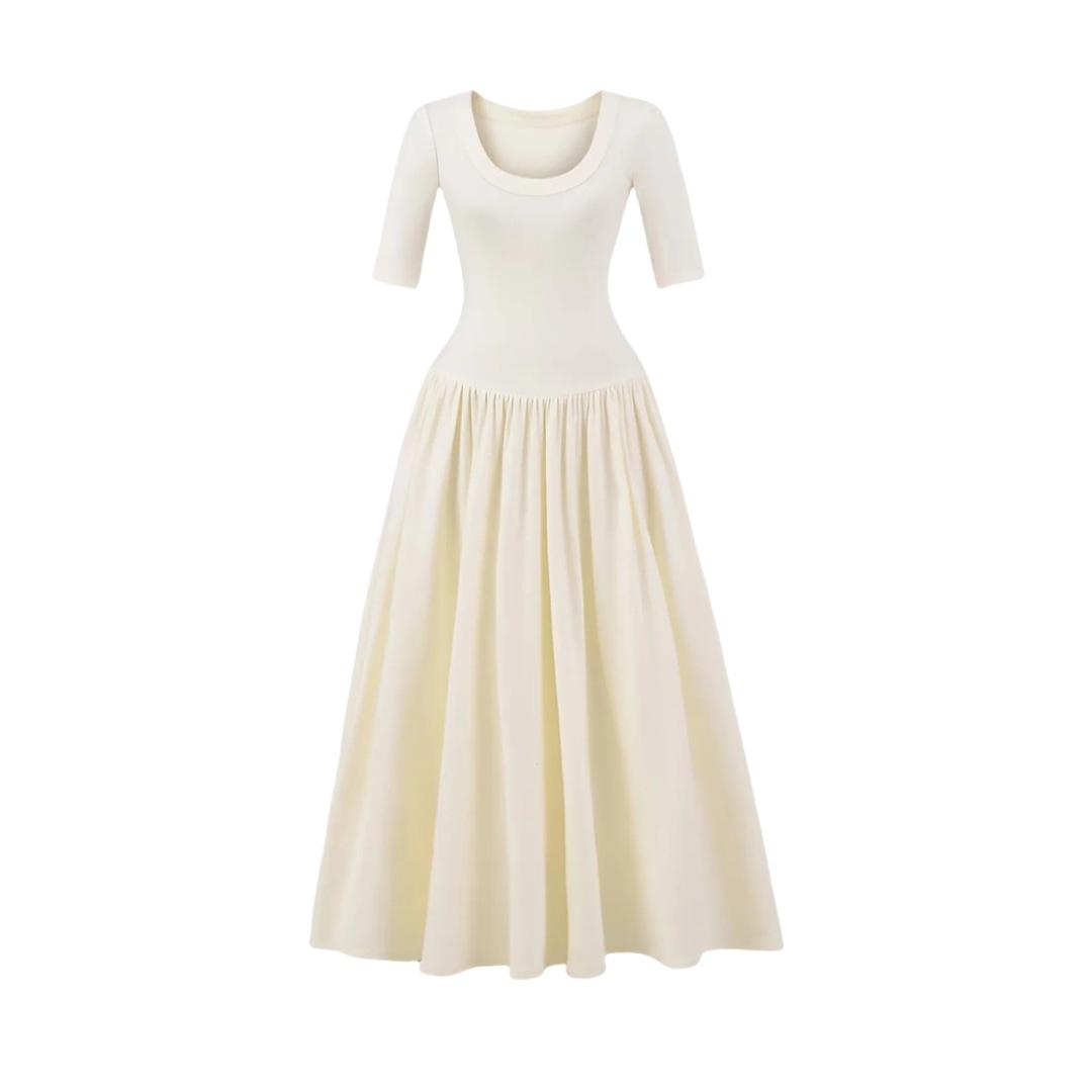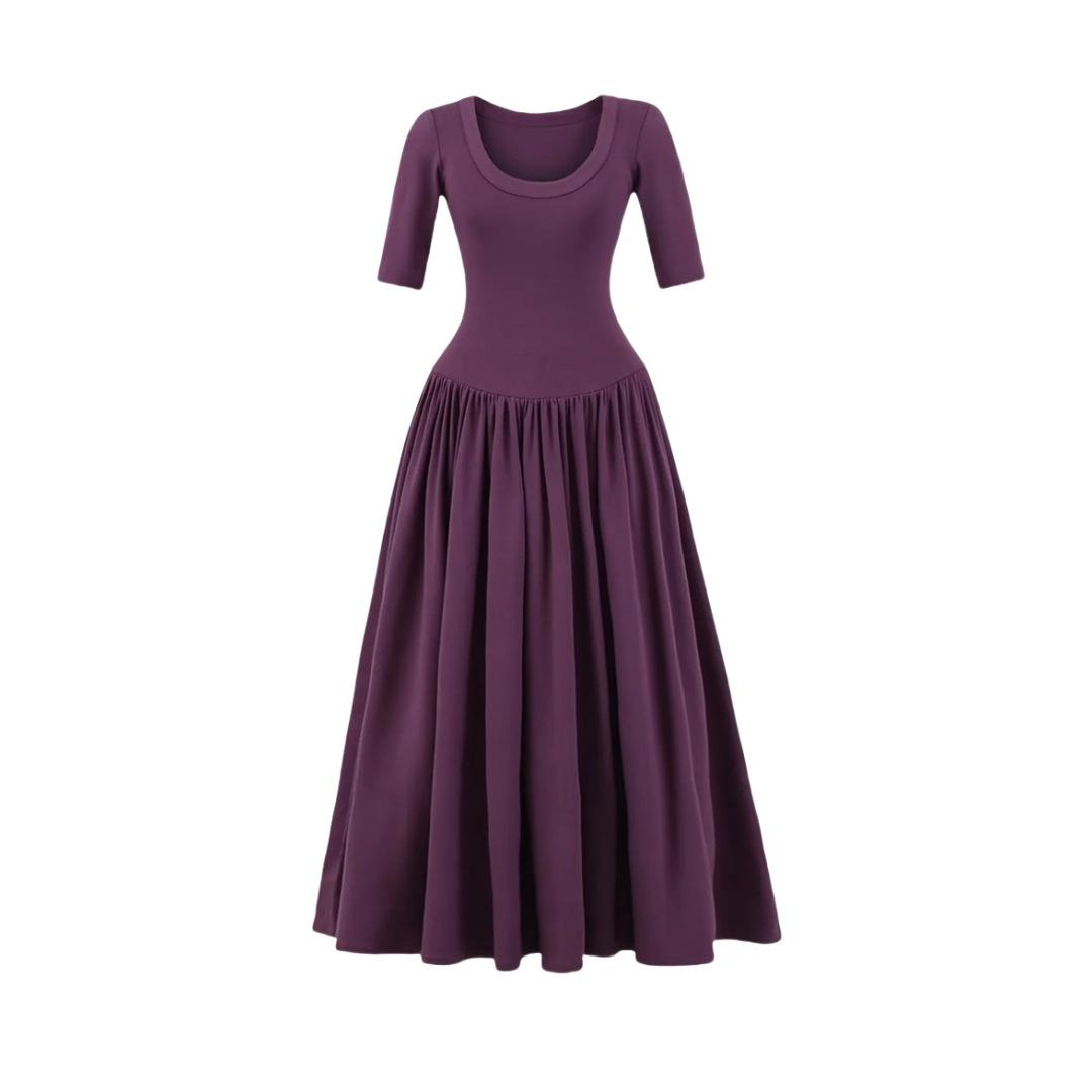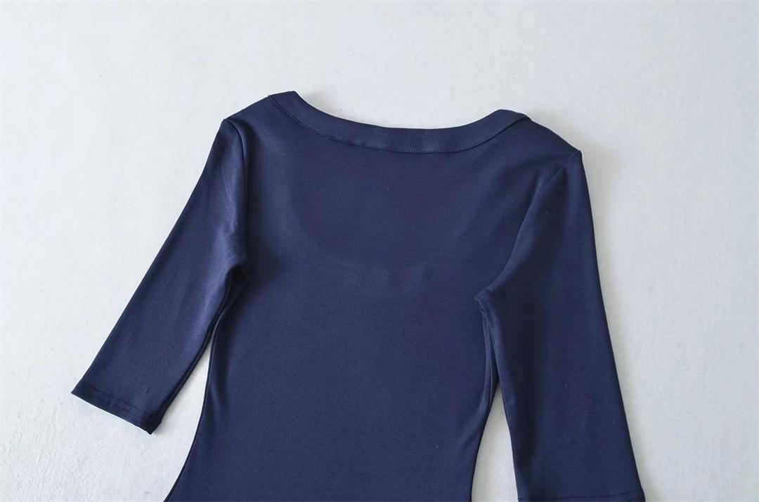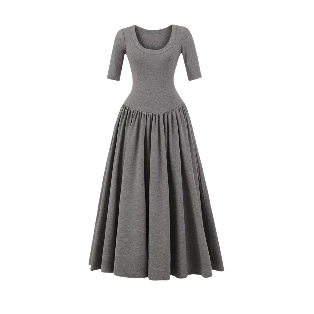 Vestido Sexy de Color Sólido Estilo Francés con Cuello en U Escotado de Manga Media con Temperamento Elástico, Corte Ajustado, Parcheado, Fruncido y Falda Larga Acampanada