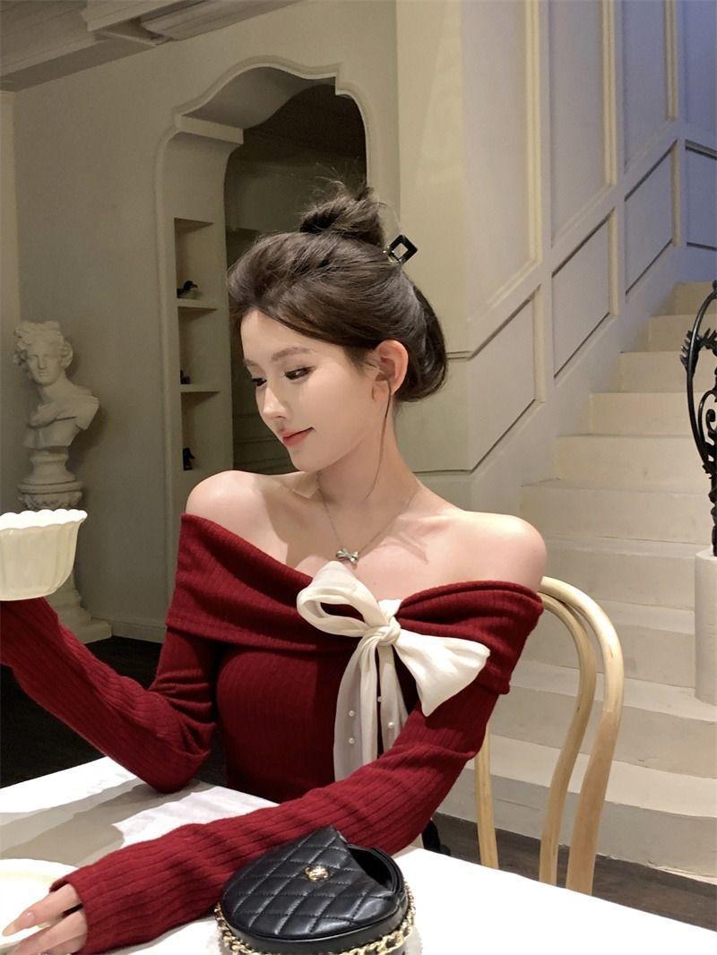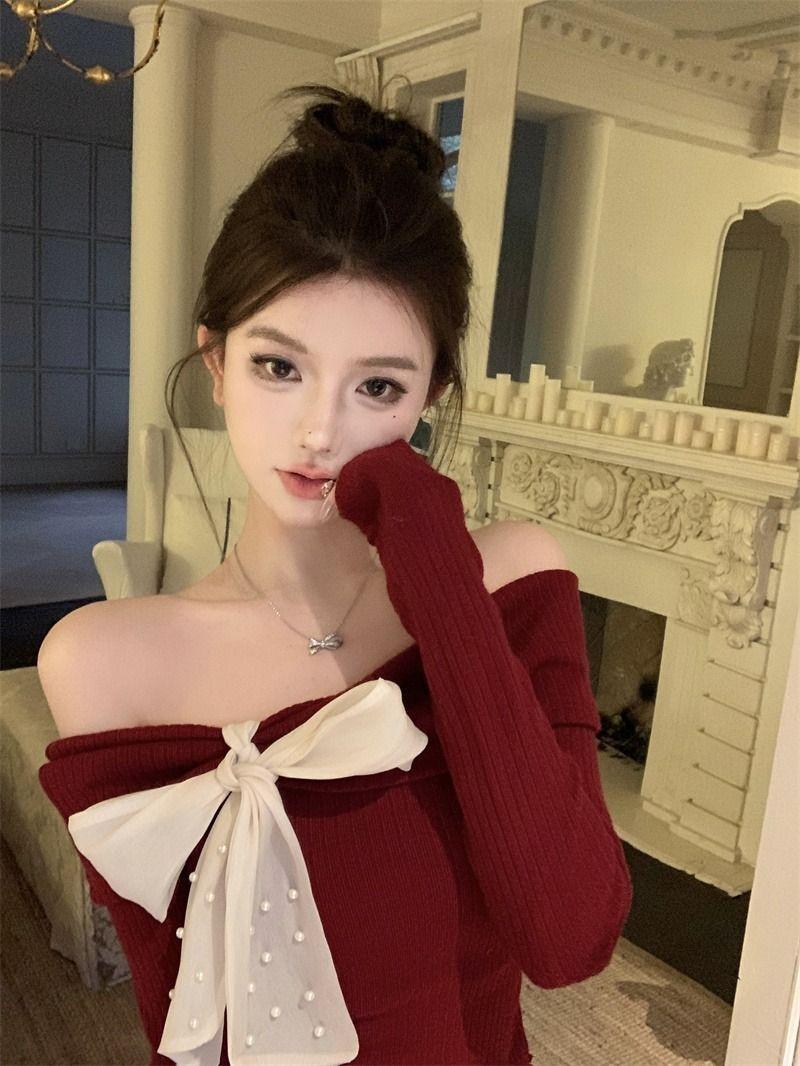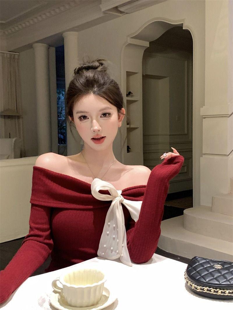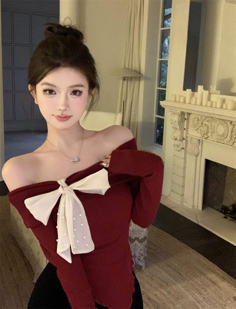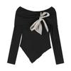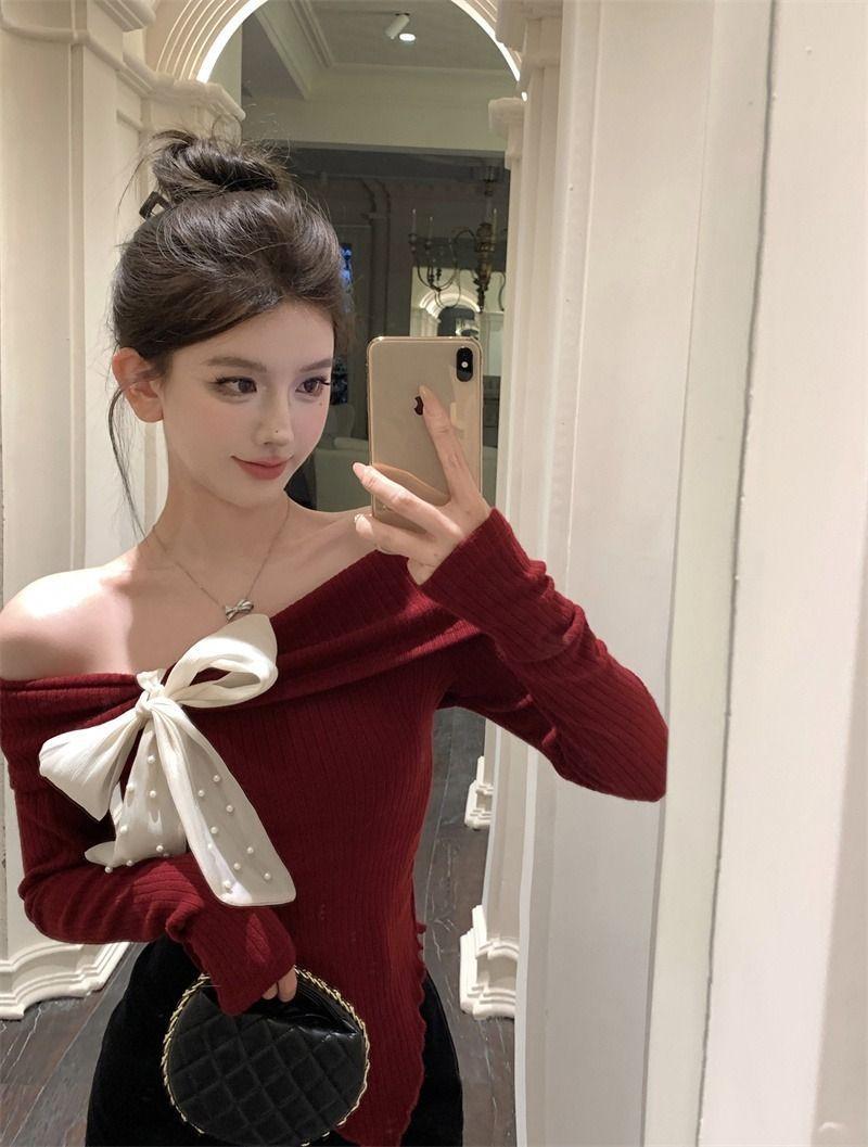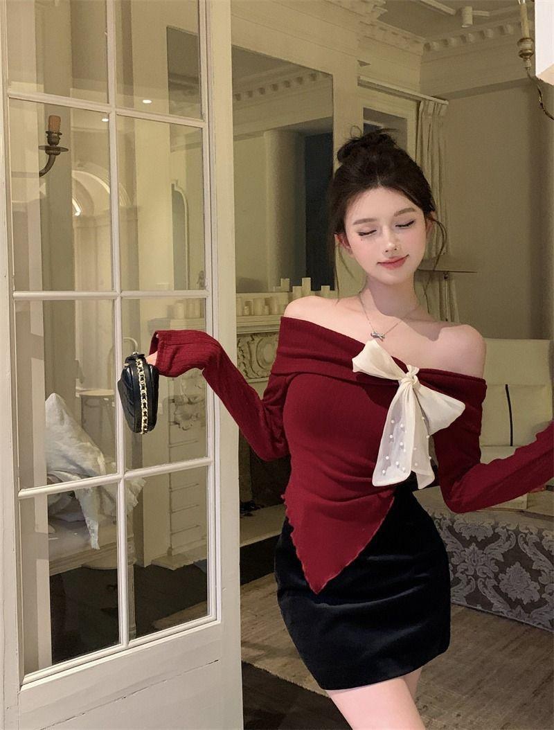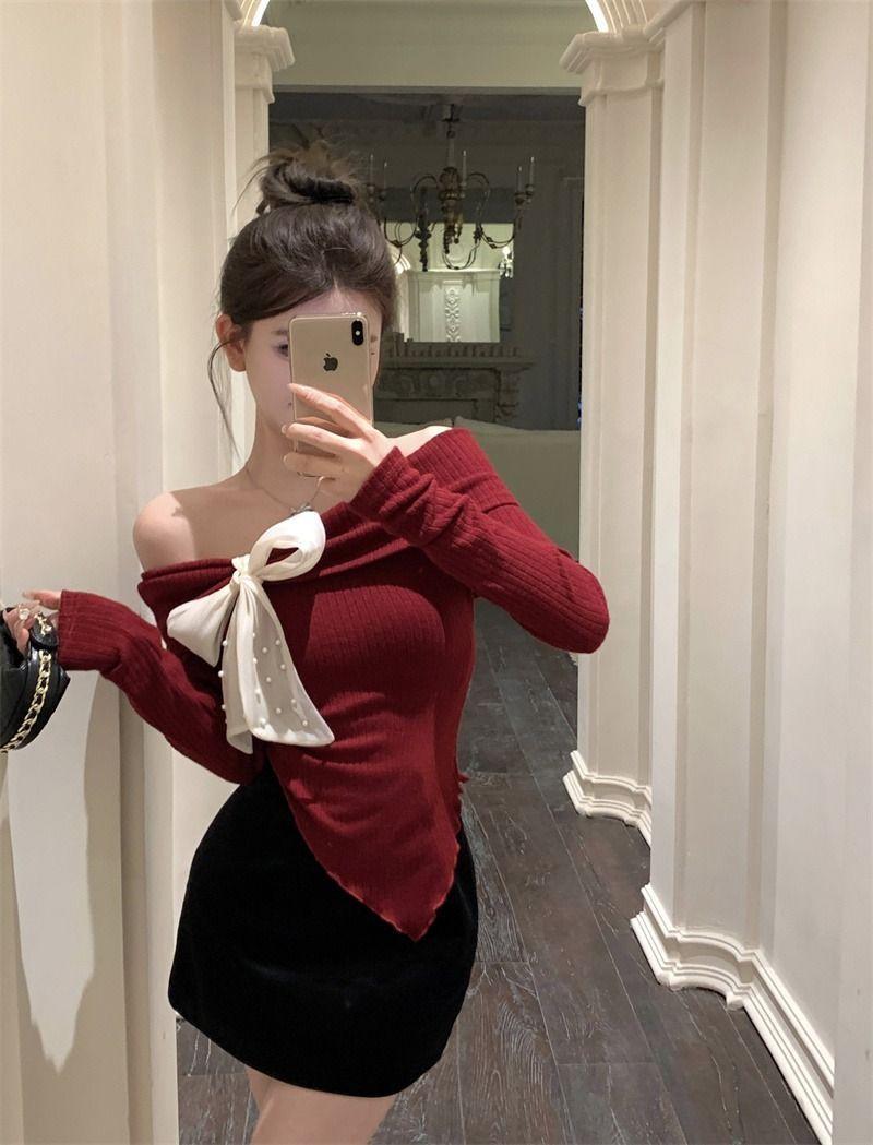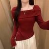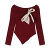 Suéter rojo de hombros descubiertos y manga larga para mujer, nuevo de primavera 2025, top ajustado irregular corto para usar debajo