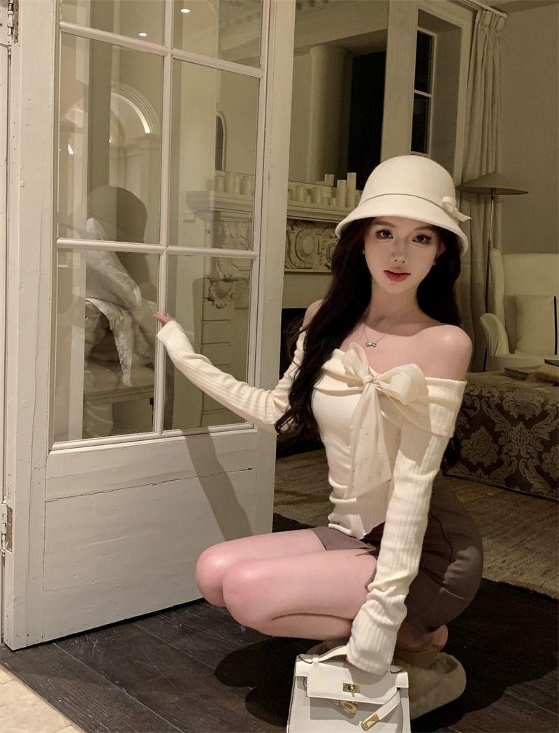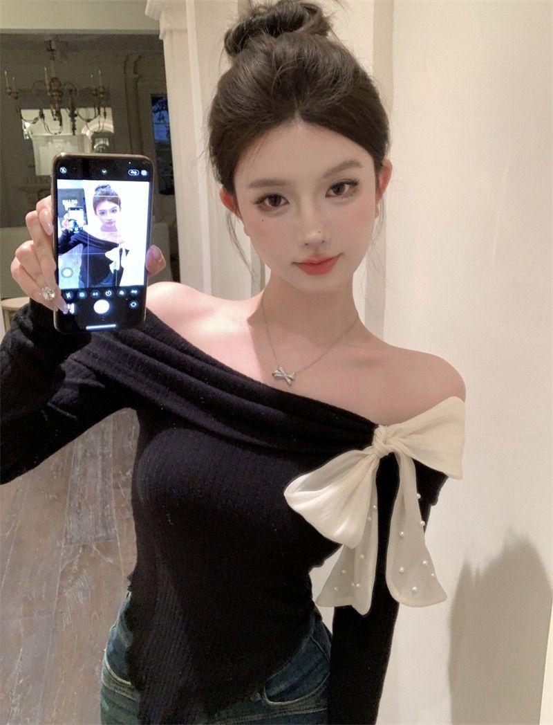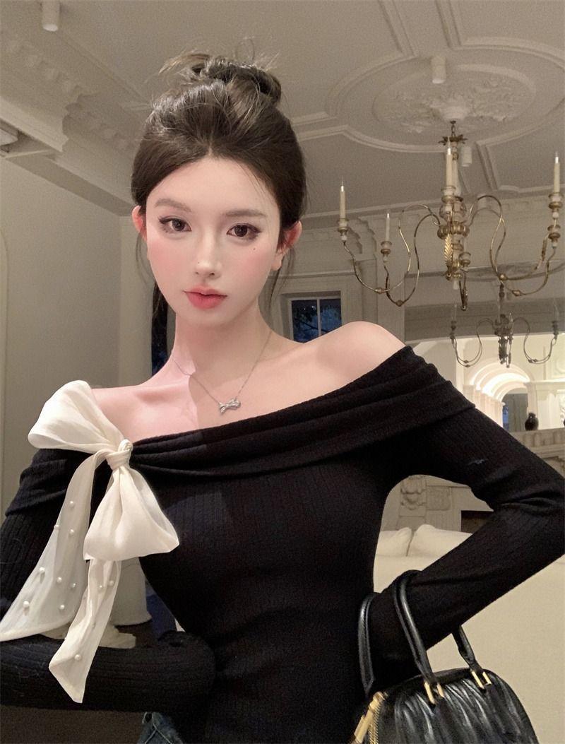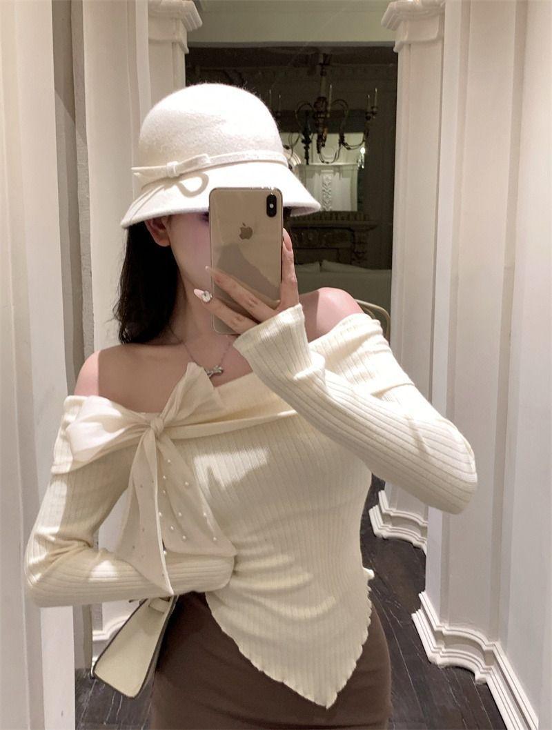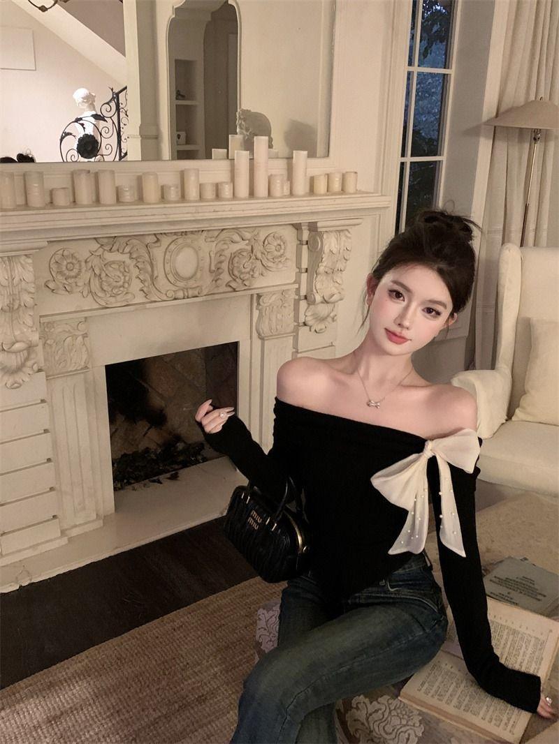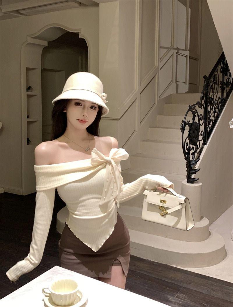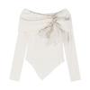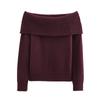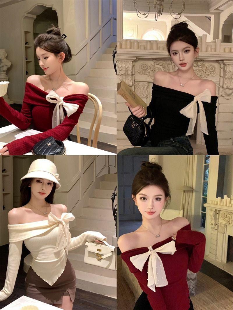 Suéter rojo de hombros descubiertos y manga larga para mujer, nuevo de primavera 2025, top ajustado irregular corto para usar debajo