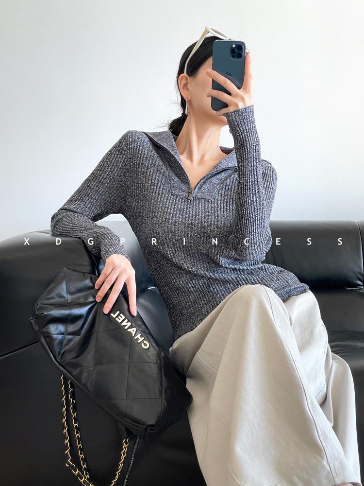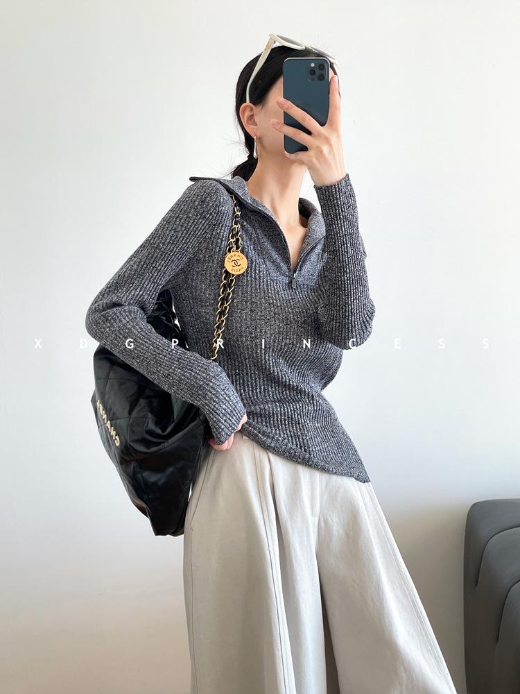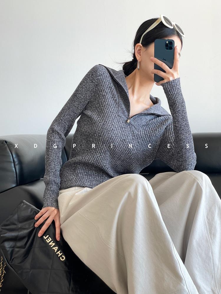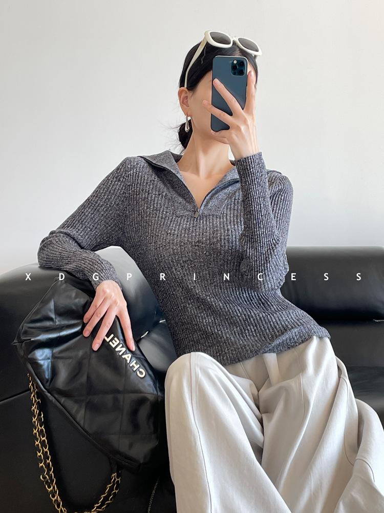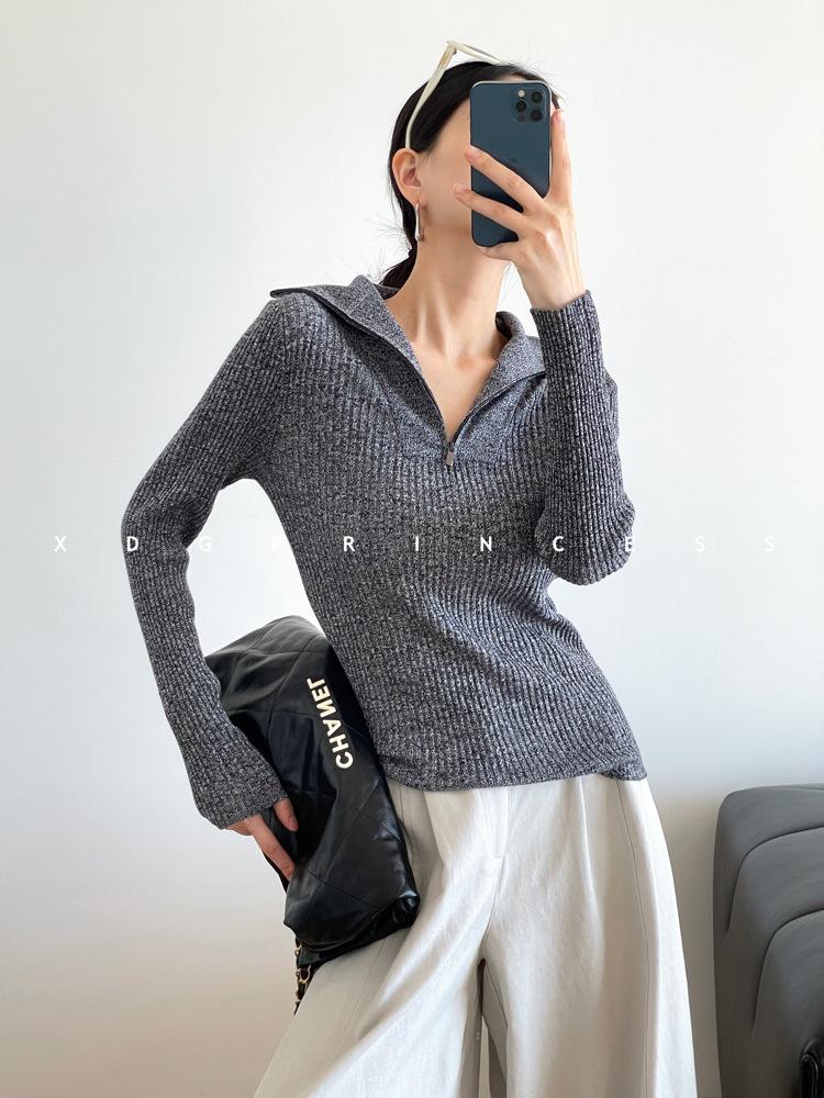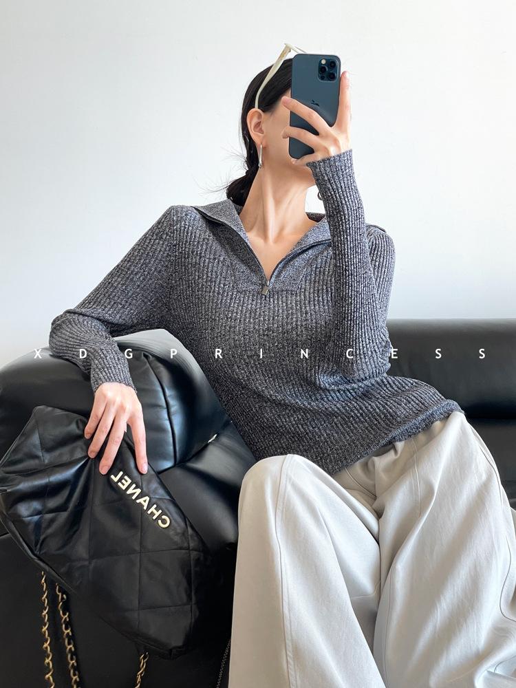 Suéter Tejido Simple de Lana Merino Retro con Cuello de Cremallera para Mujer Primavera Otoño Adelgazante Ropa Interior Suéter Top 082