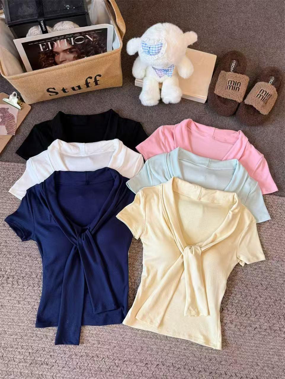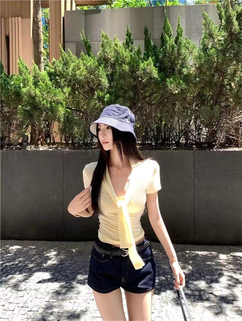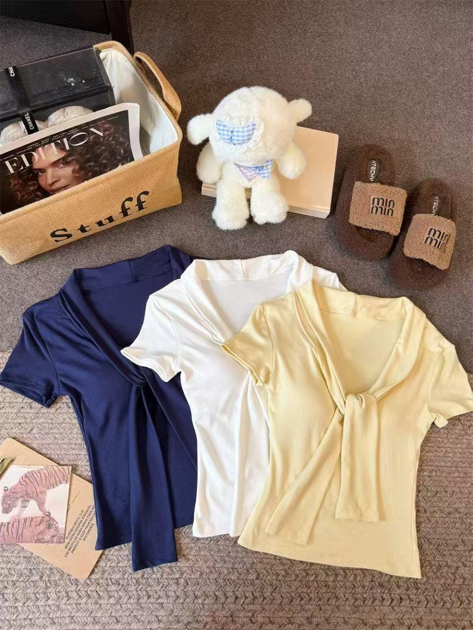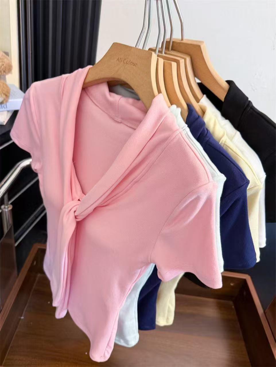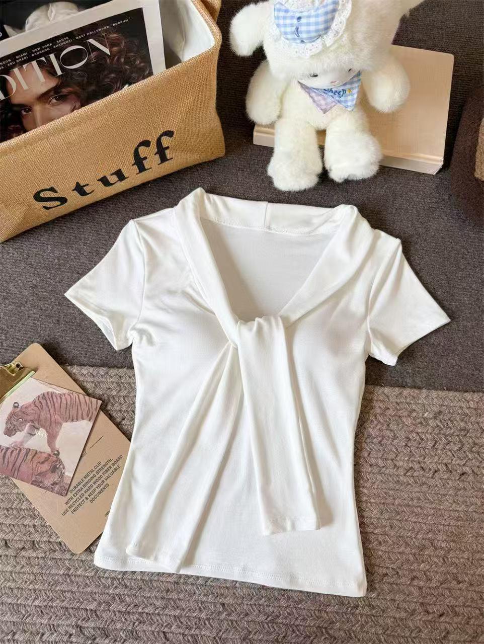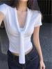 Camiseta chic casual con cordones para mujer verano nuevo temperamento en capas versátil ajuste ceñido simple plisado prenda exterior