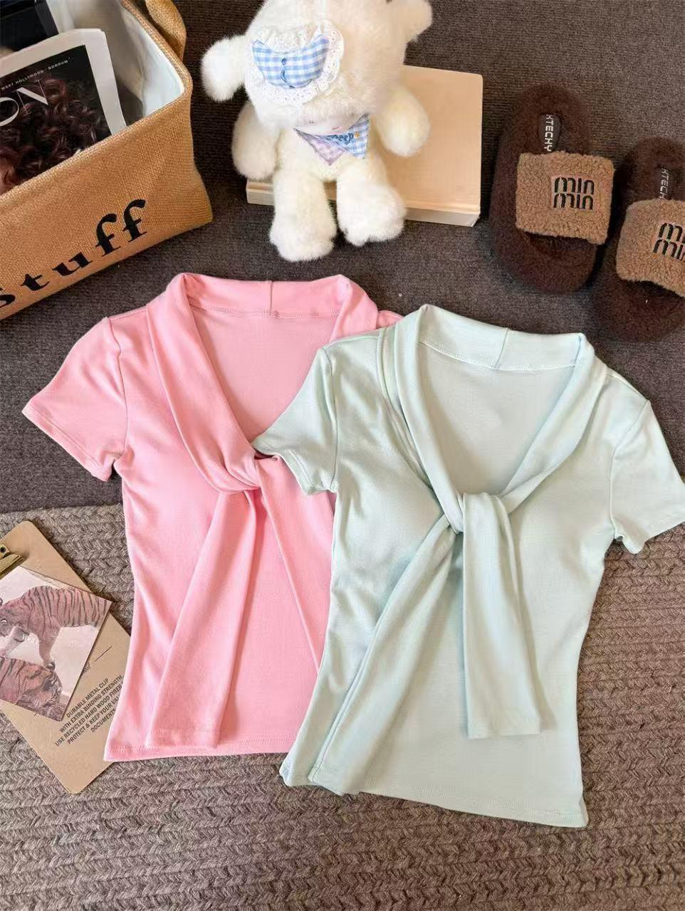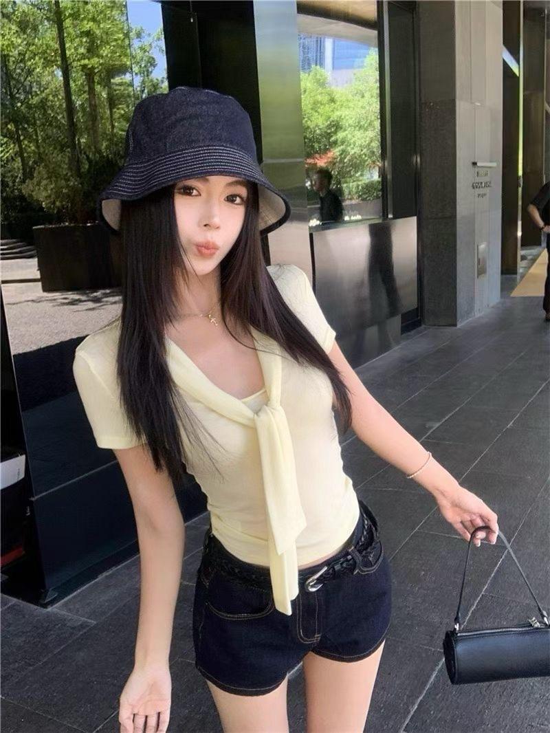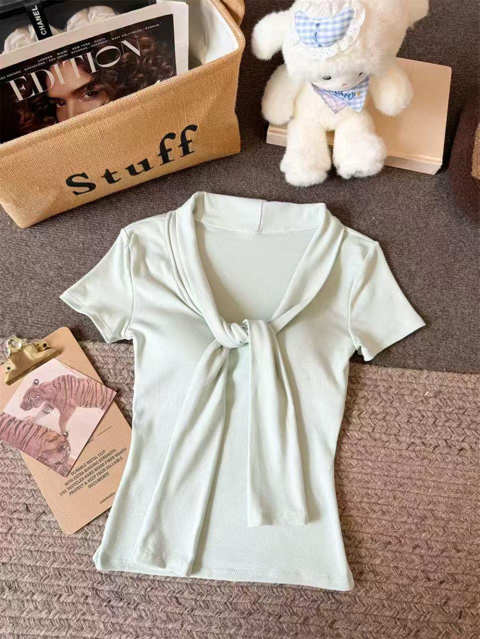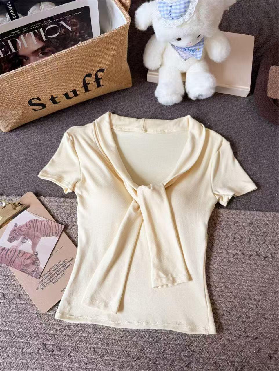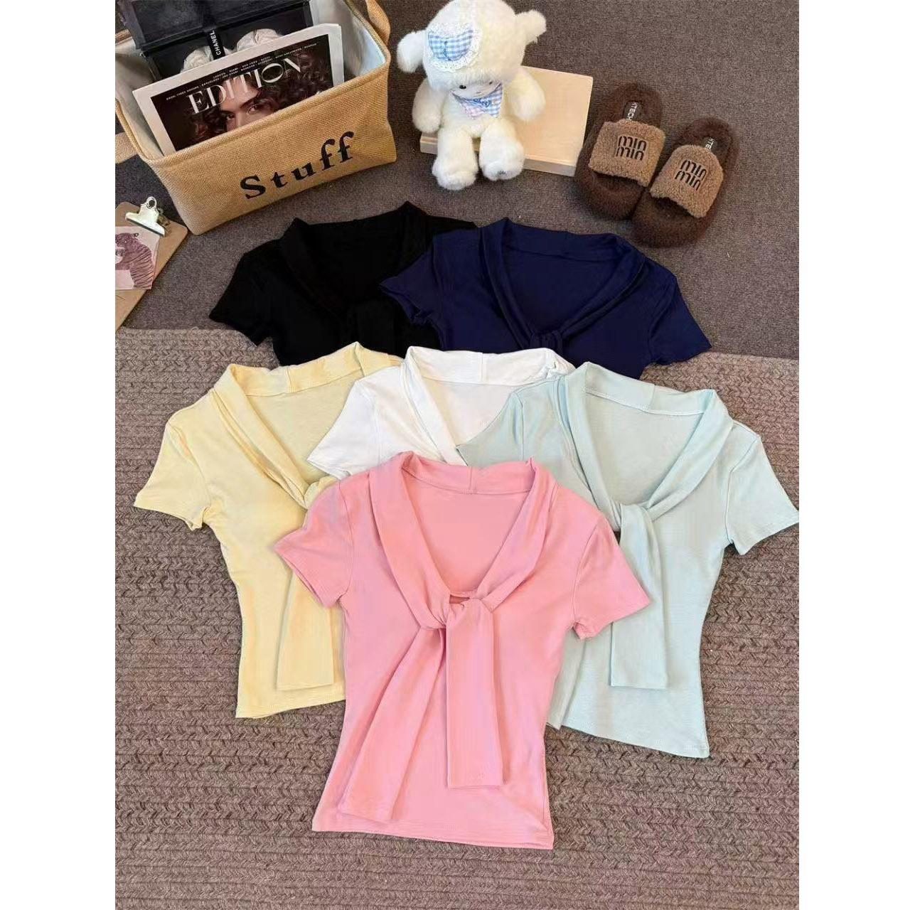 Camiseta chic casual con cordones para mujer verano nuevo temperamento en capas versátil ajuste ceñido simple plisado prenda exterior