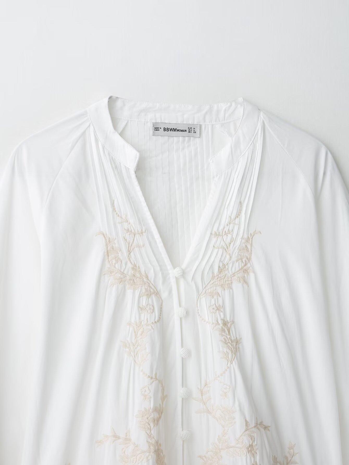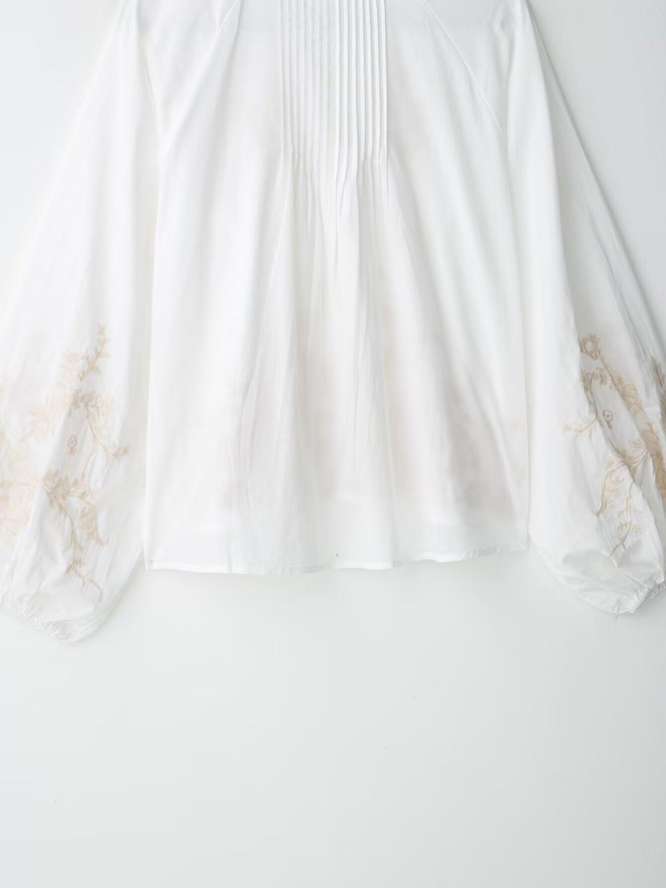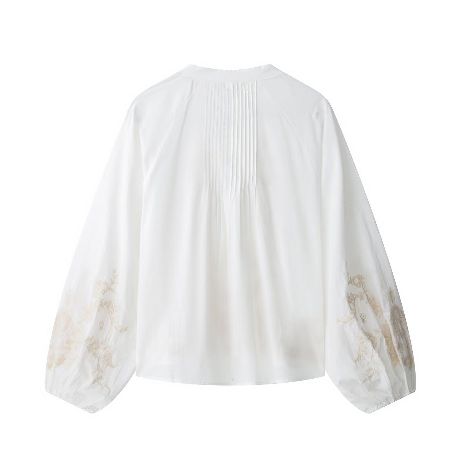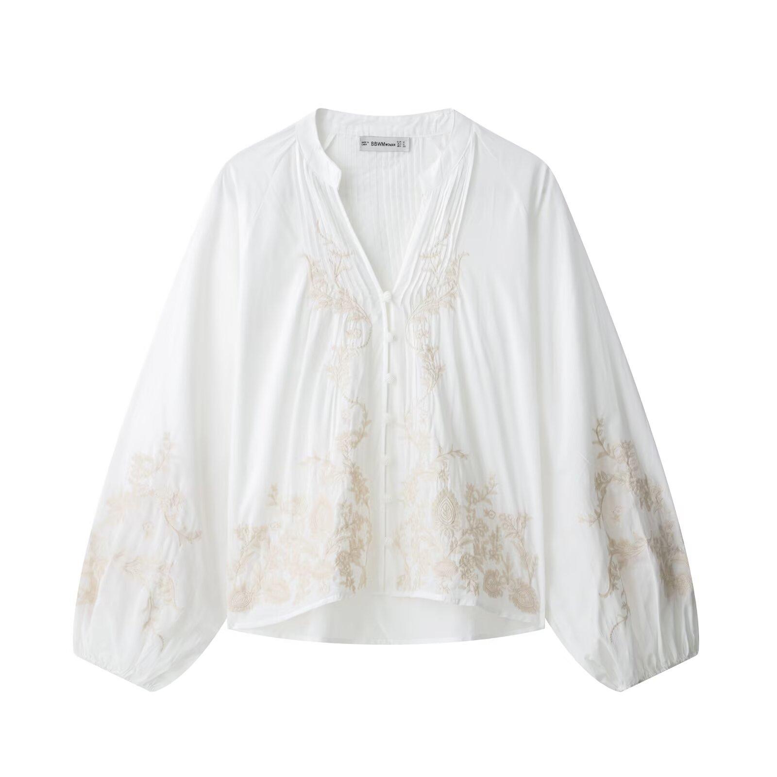 Exportación Transfronteriza Ropa de Mujer 2025 Verano Estilo Europeo y Americano Cuello en V Manga Larga Camisas con Pliegues y Flores Bordadas Tops para Mujer A36553