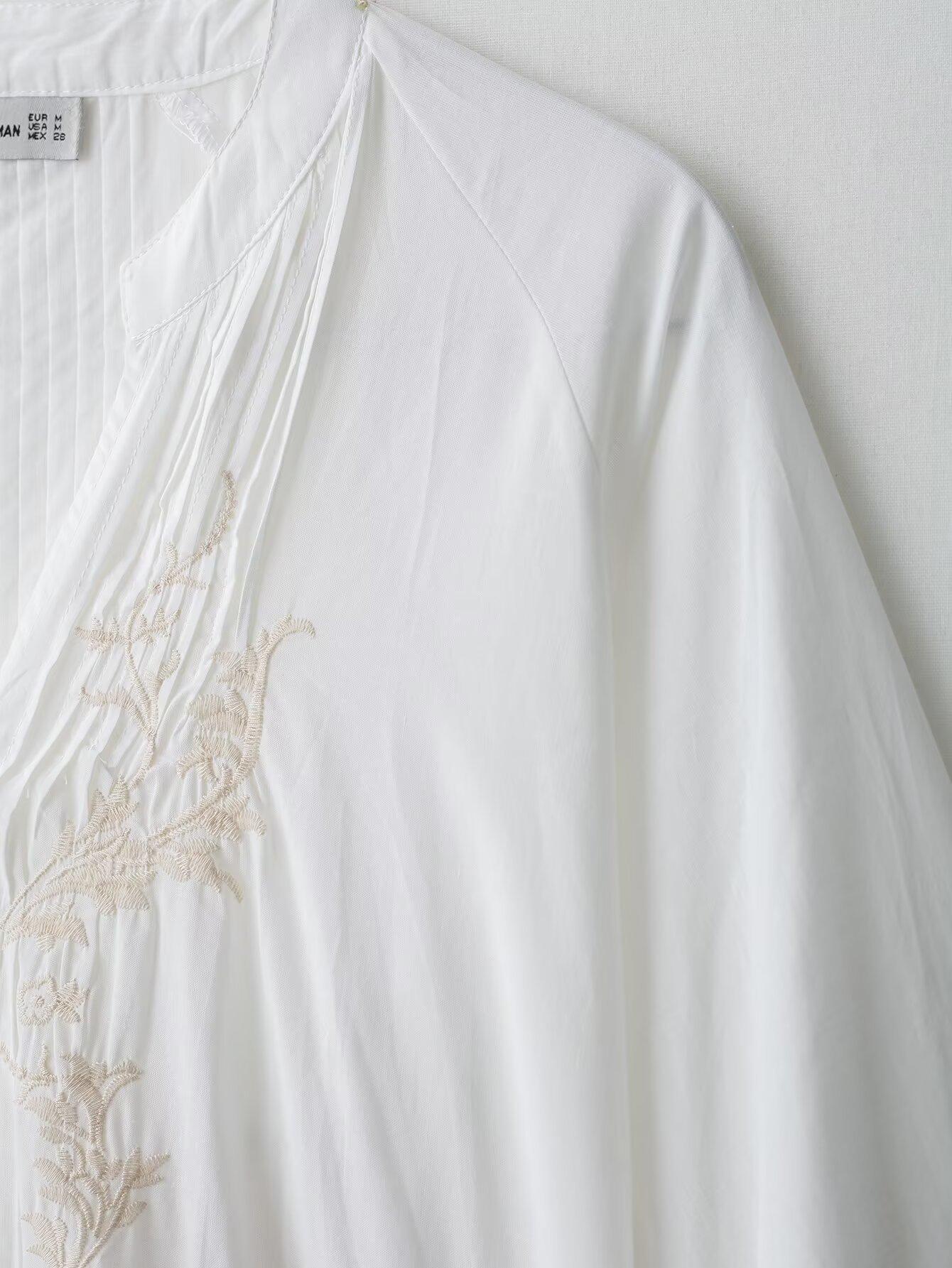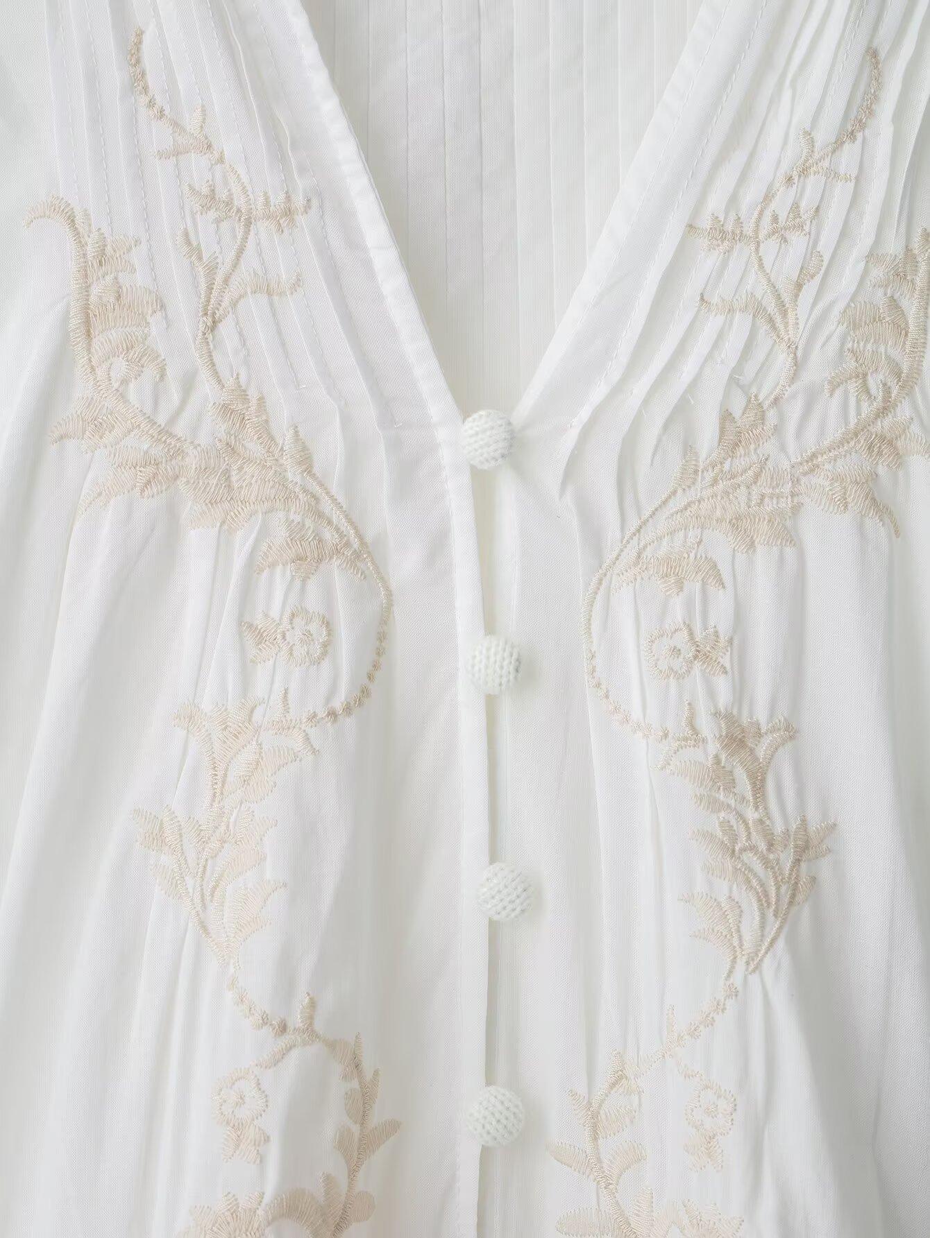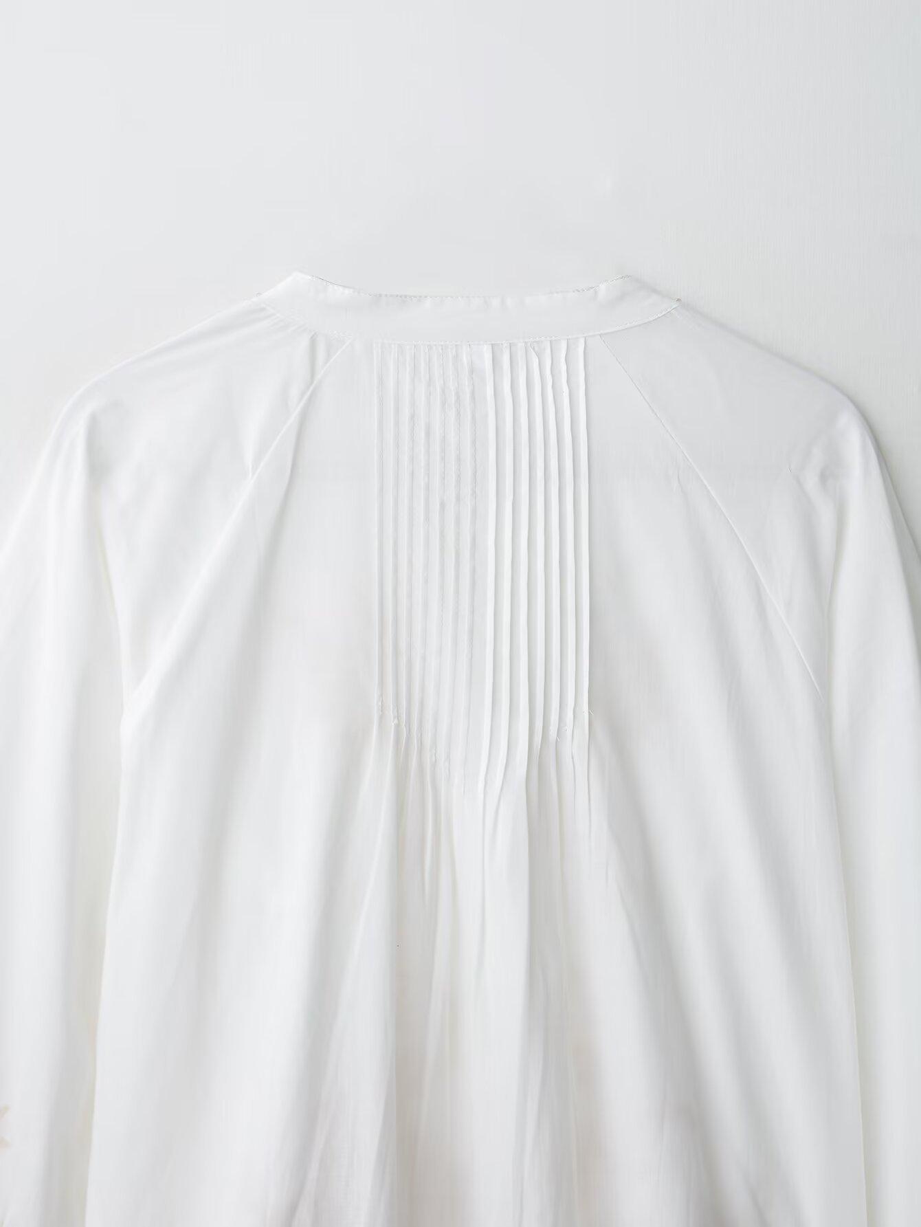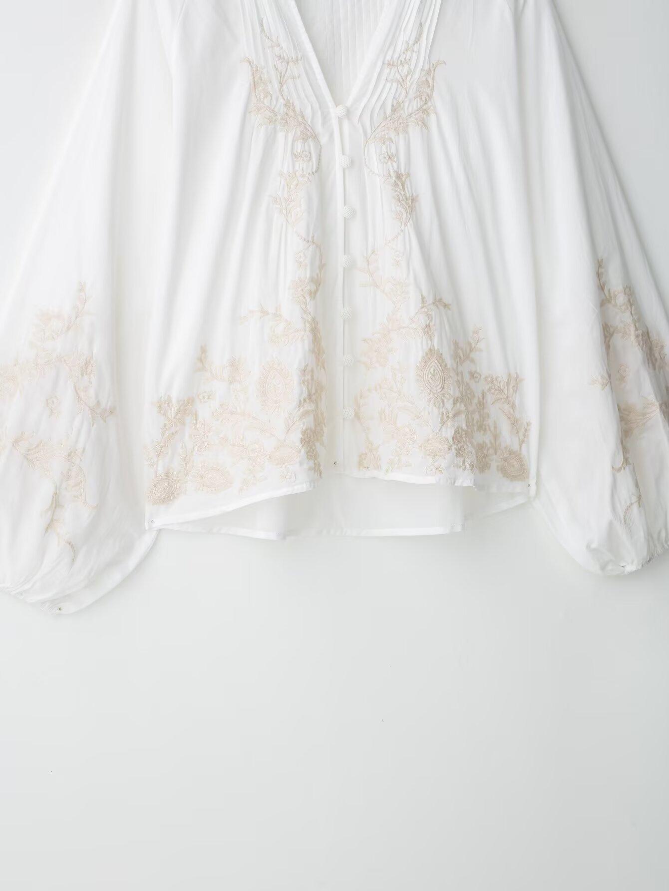 Exportación Transfronteriza Ropa de Mujer 2025 Verano Estilo Europeo y Americano Cuello en V Manga Larga Camisas con Pliegues y Flores Bordadas Tops para Mujer A36553