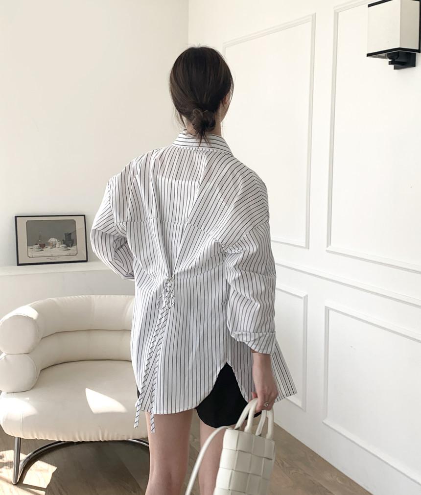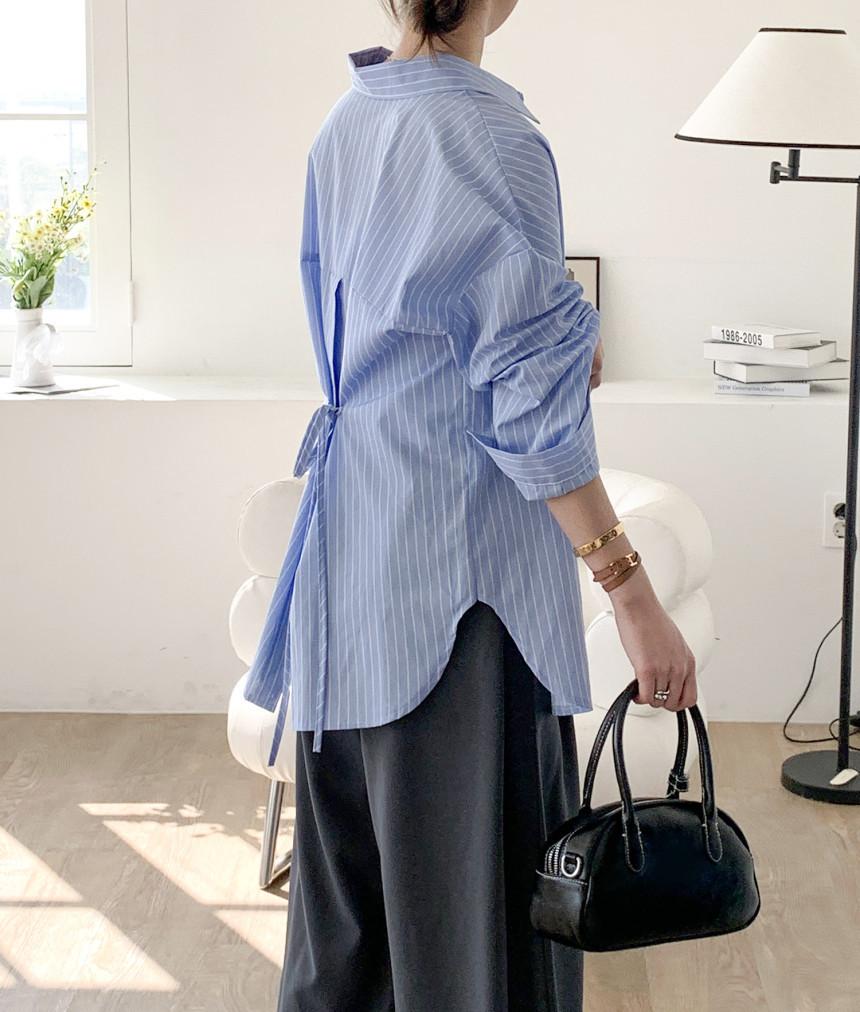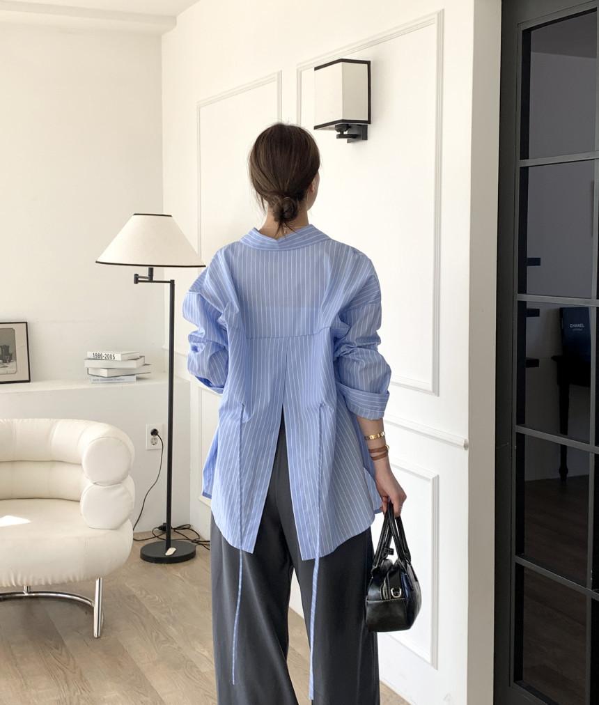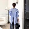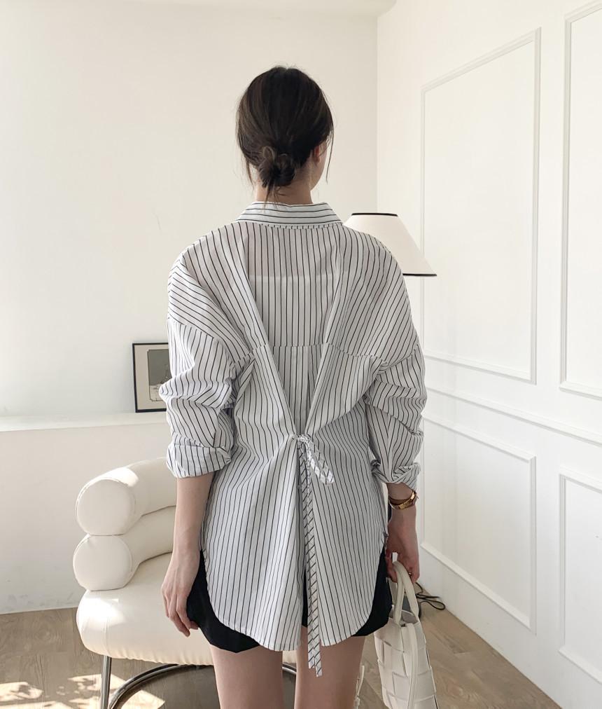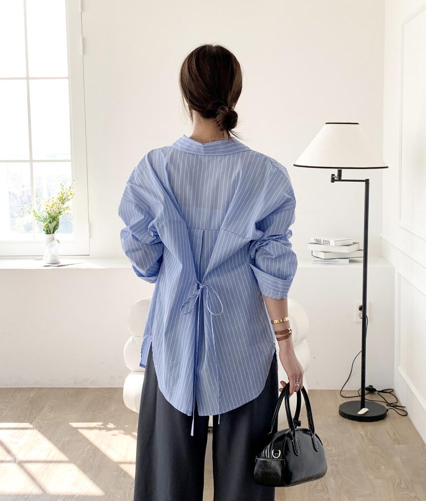 Chic coreano 2025 nuevo otoño diseño francés camisa rayada con abertura trasera y lazo ropa de mujer