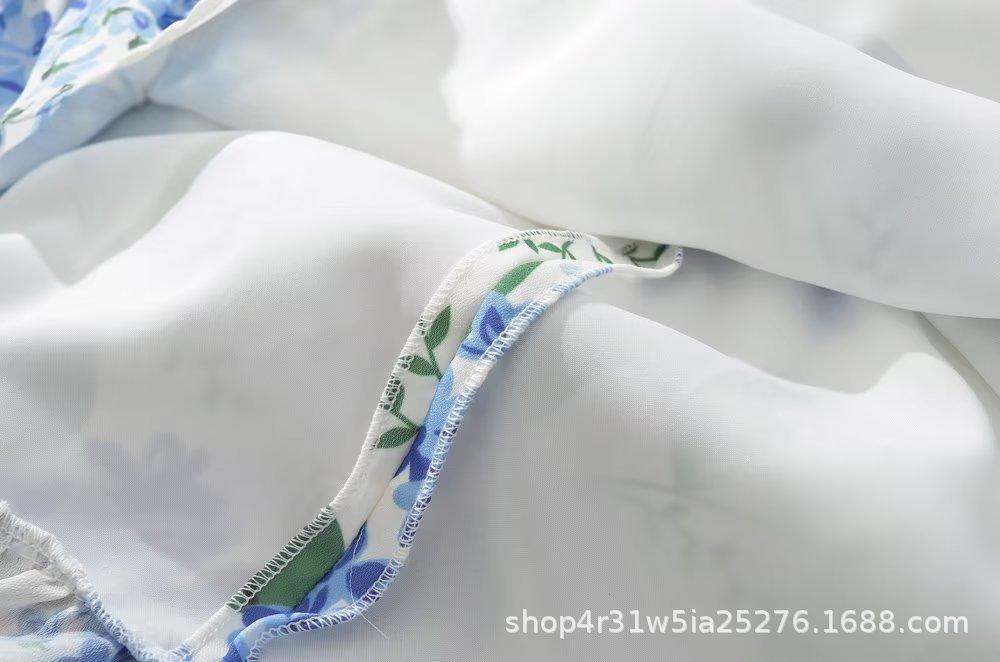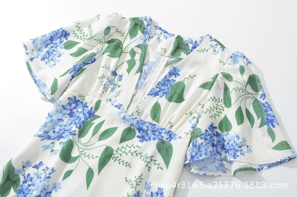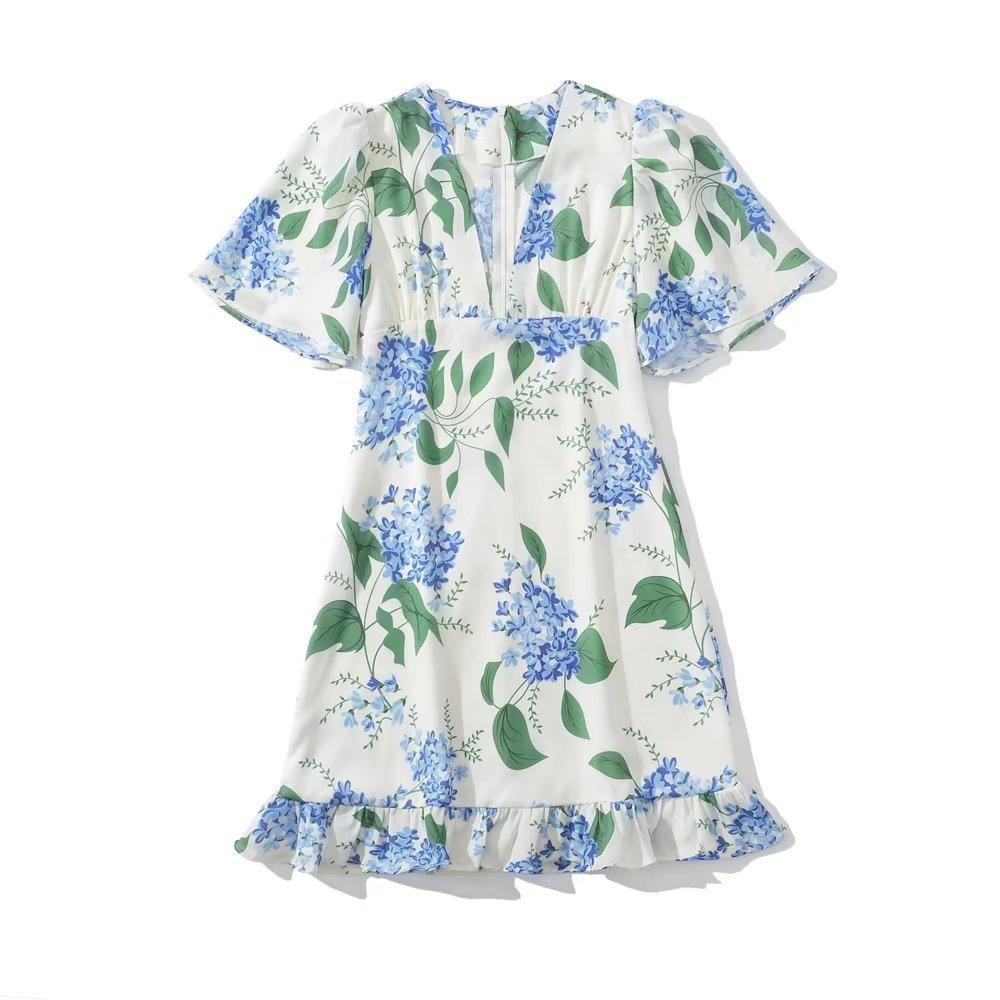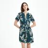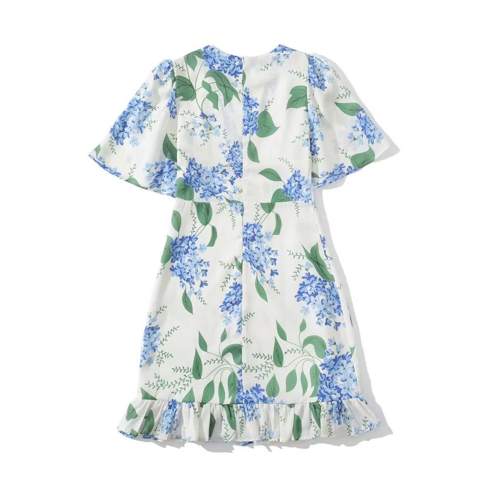 Ropa de mujer nueva de primavera 2023 moda retro cuello en V manga corta adelgazante cintura estampada vestido falda corta moda
