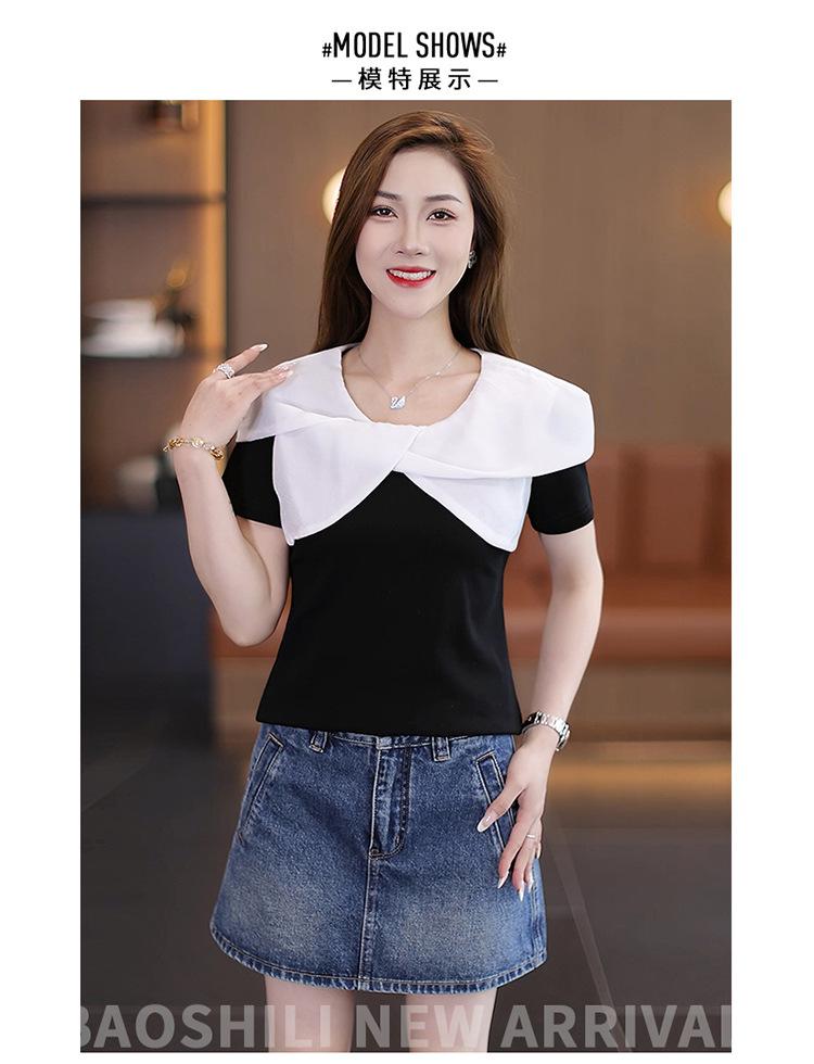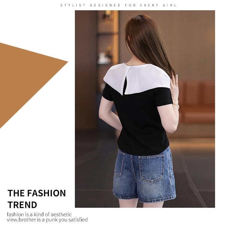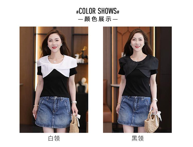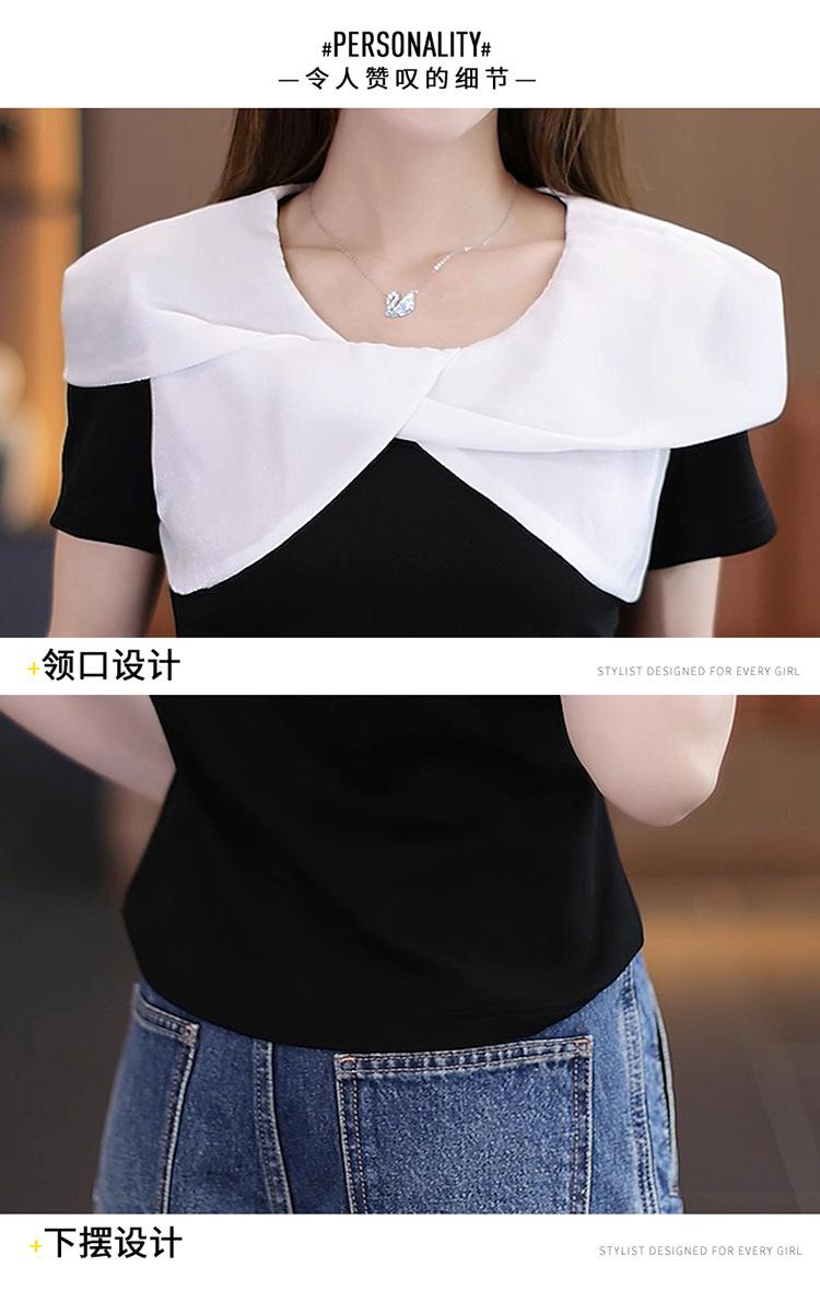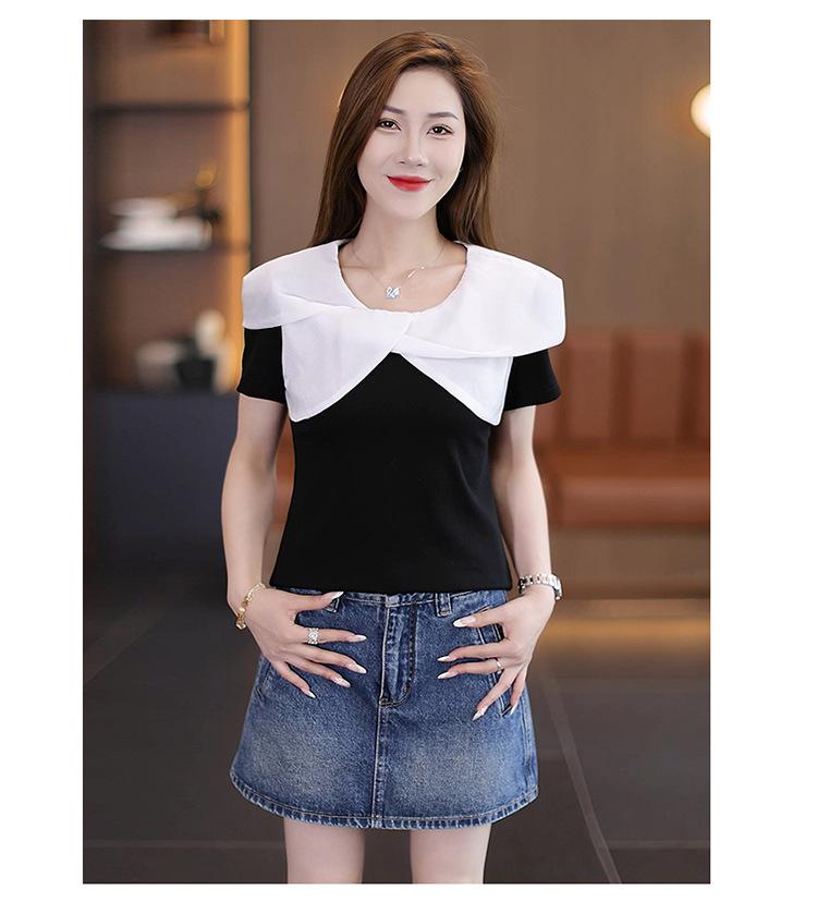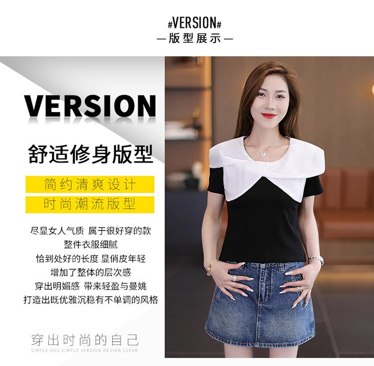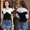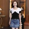Camiseta de Manga Corta con Costuras en Color de Contraste de Moda, Cuello Cruzado, Verano para Mujer, Nueva Elegante, Combinación con Todo, Slim, Top con Lazo