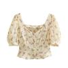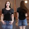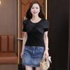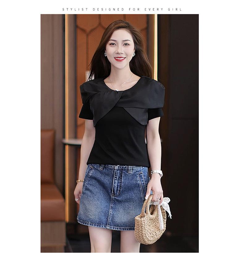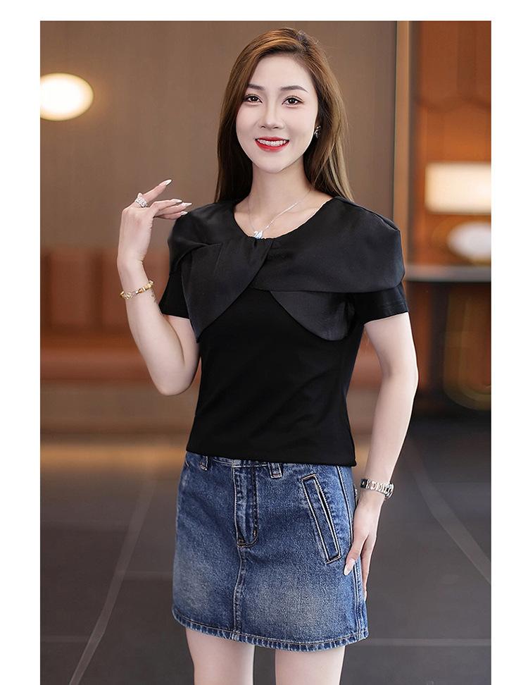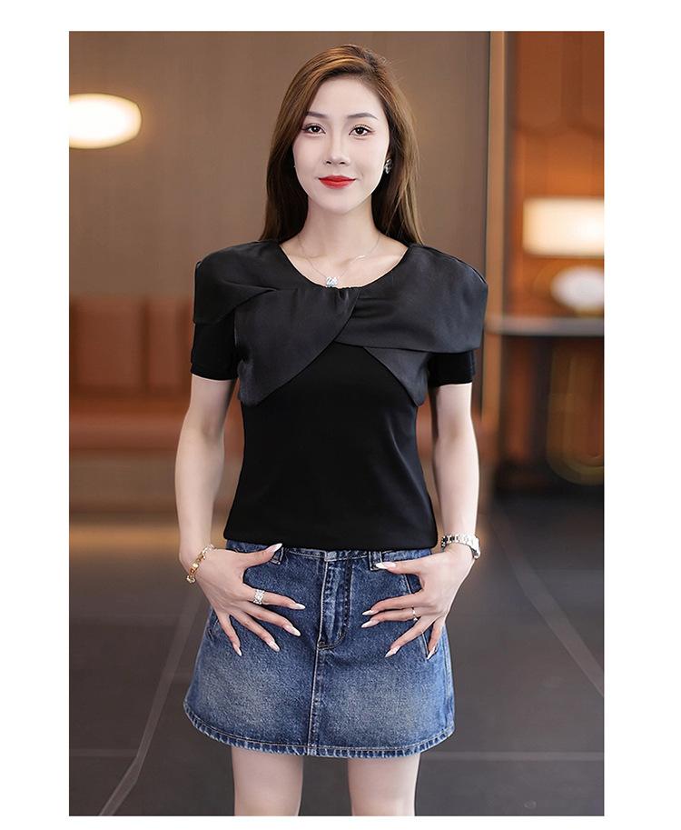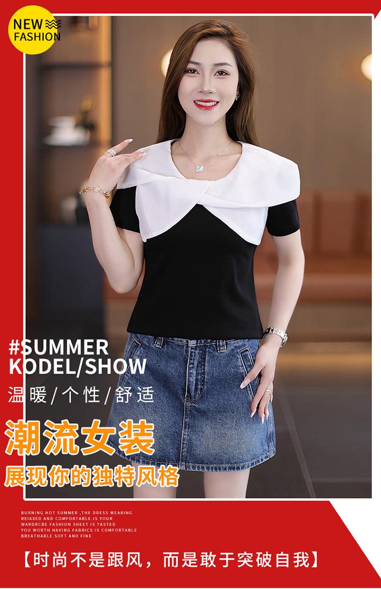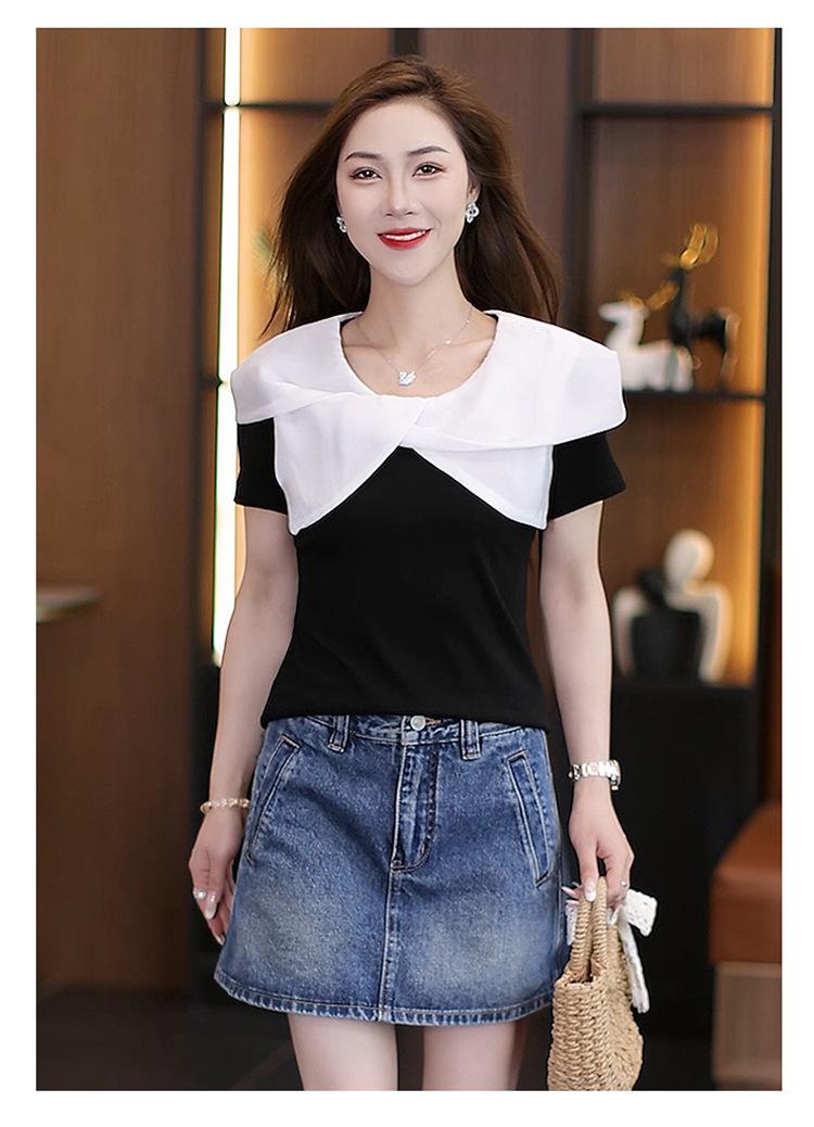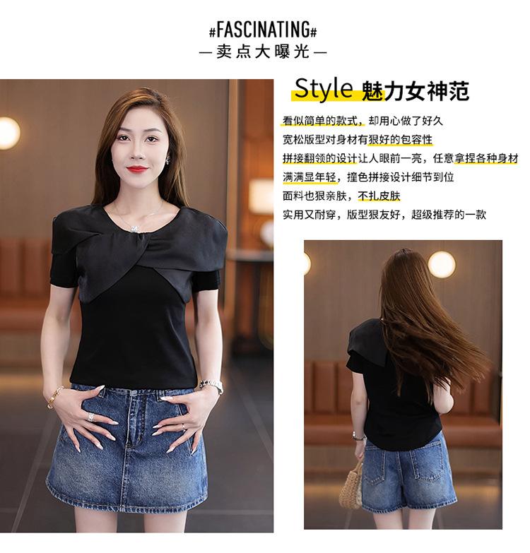 Camiseta de Manga Corta con Costuras en Color de Contraste de Moda, Cuello Cruzado, Verano para Mujer, Nueva Elegante, Combinación con Todo, Slim, Top con Lazo