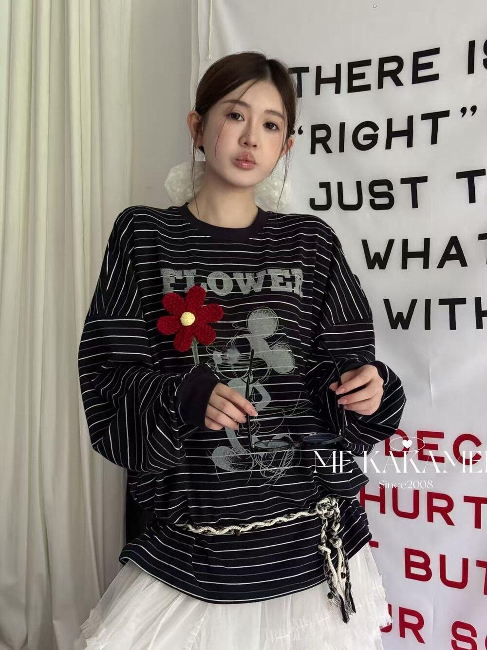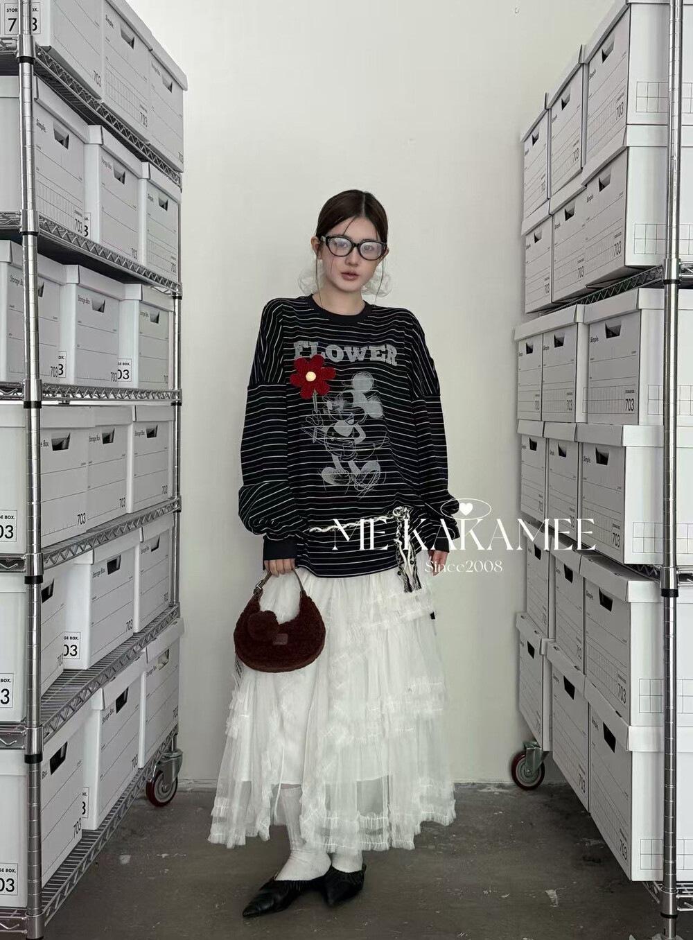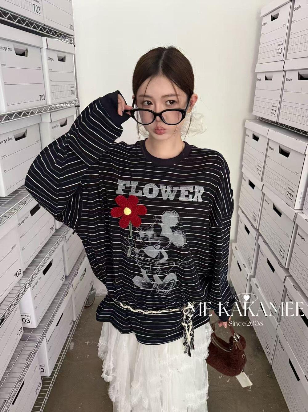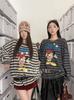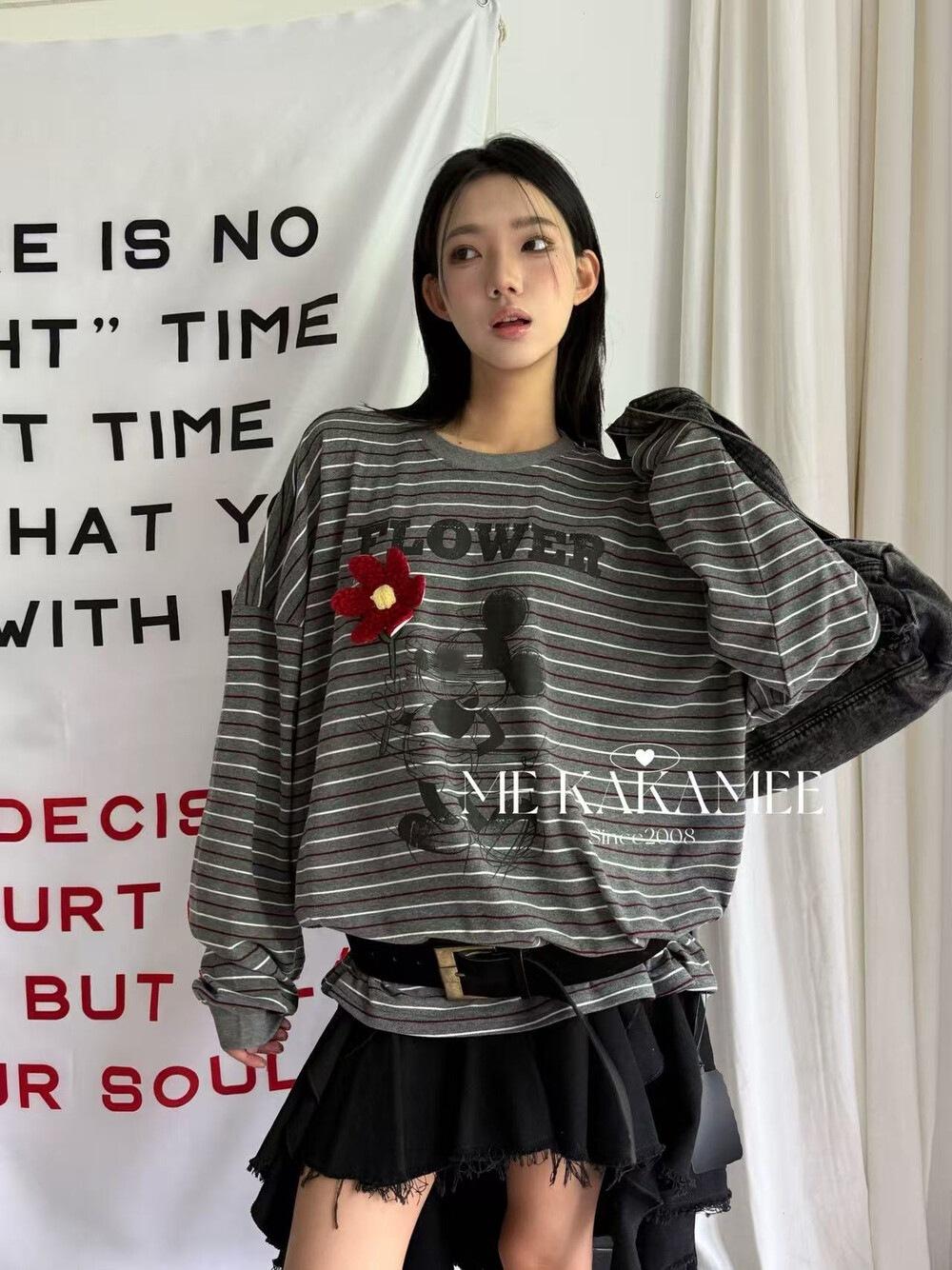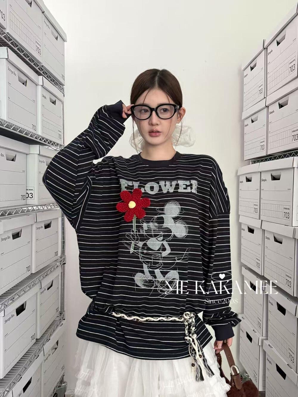 ME KAKAMEE Trece Líneas Otoño Dibujo Animado Americano MQ Casual Holgada Oversized Camiseta de Manga Larga Mujer 8911