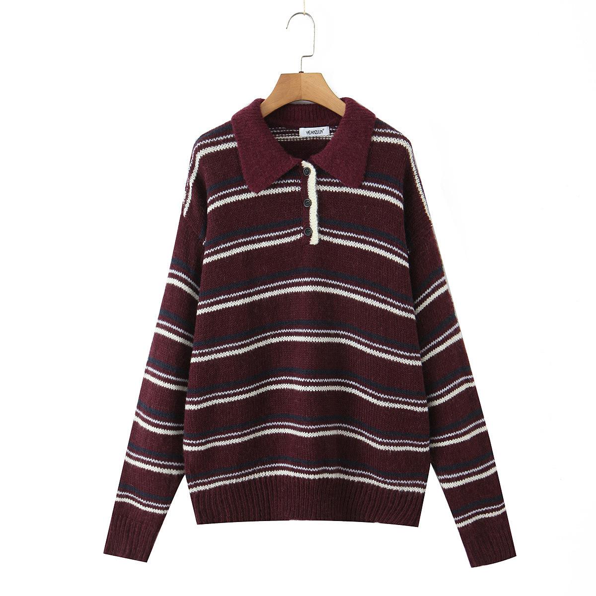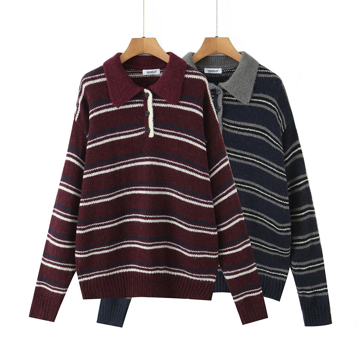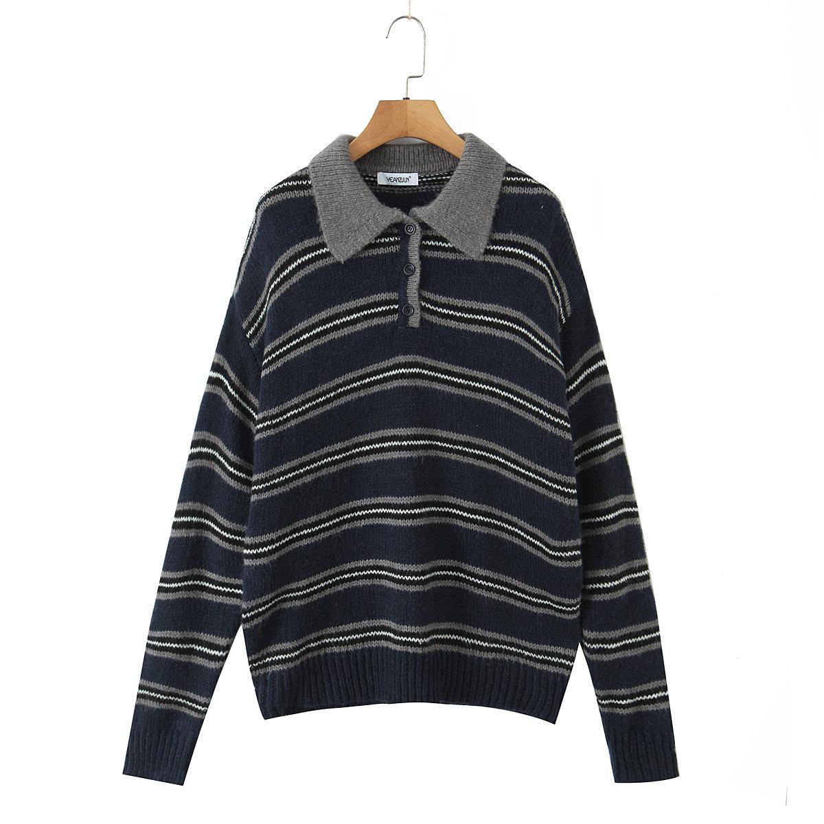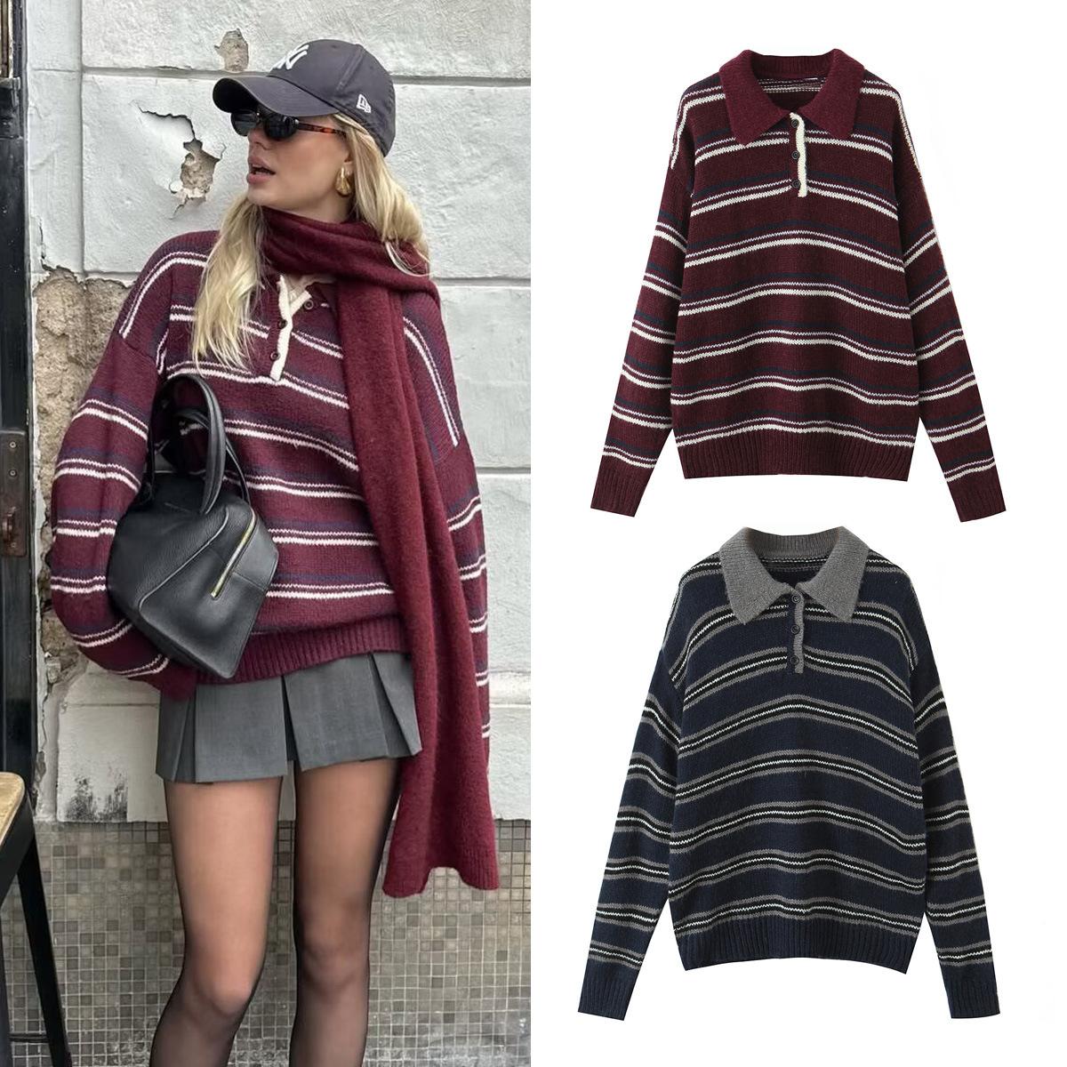 Ropa de Mujer de Comercio Exterior Transfronterizo 2025 Otoño Estilo Europeo y Americano Cuello POLO Manga Larga Bloque de Color Rayado Top de Punto para Mujer D79790