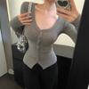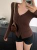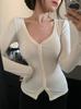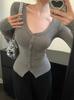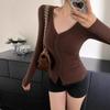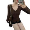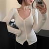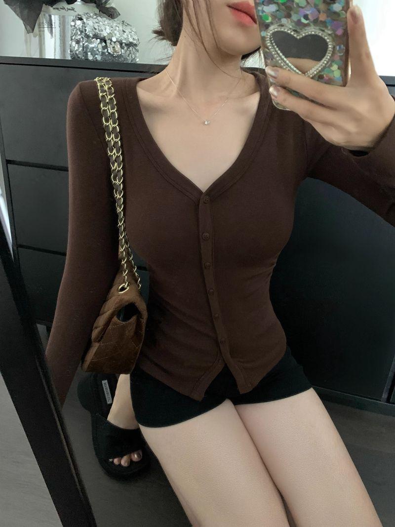 Primavera y Otoño Mujeres Nuevo Estilo Deseo Puro Moda Chica Caliente Sexy Slim Cuello en V Botón Manga Larga Suéter Camiseta Top