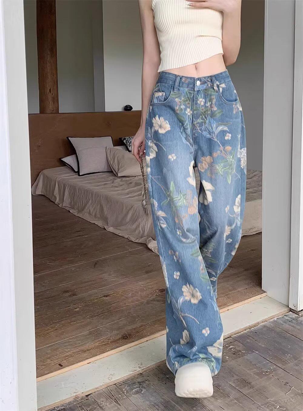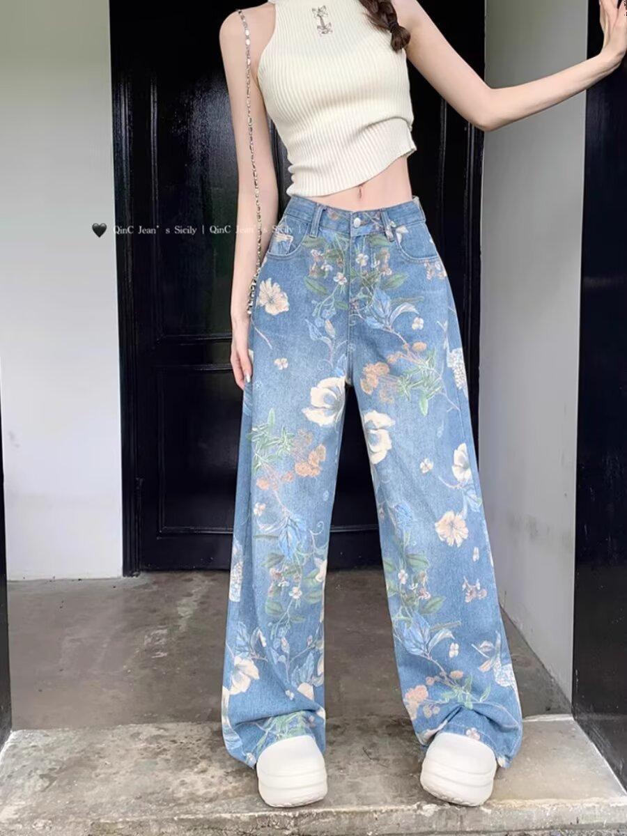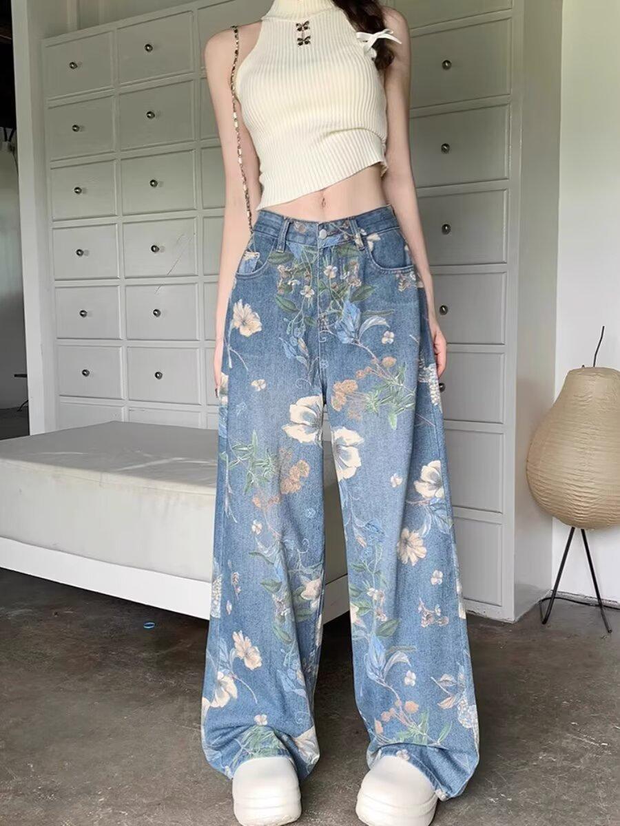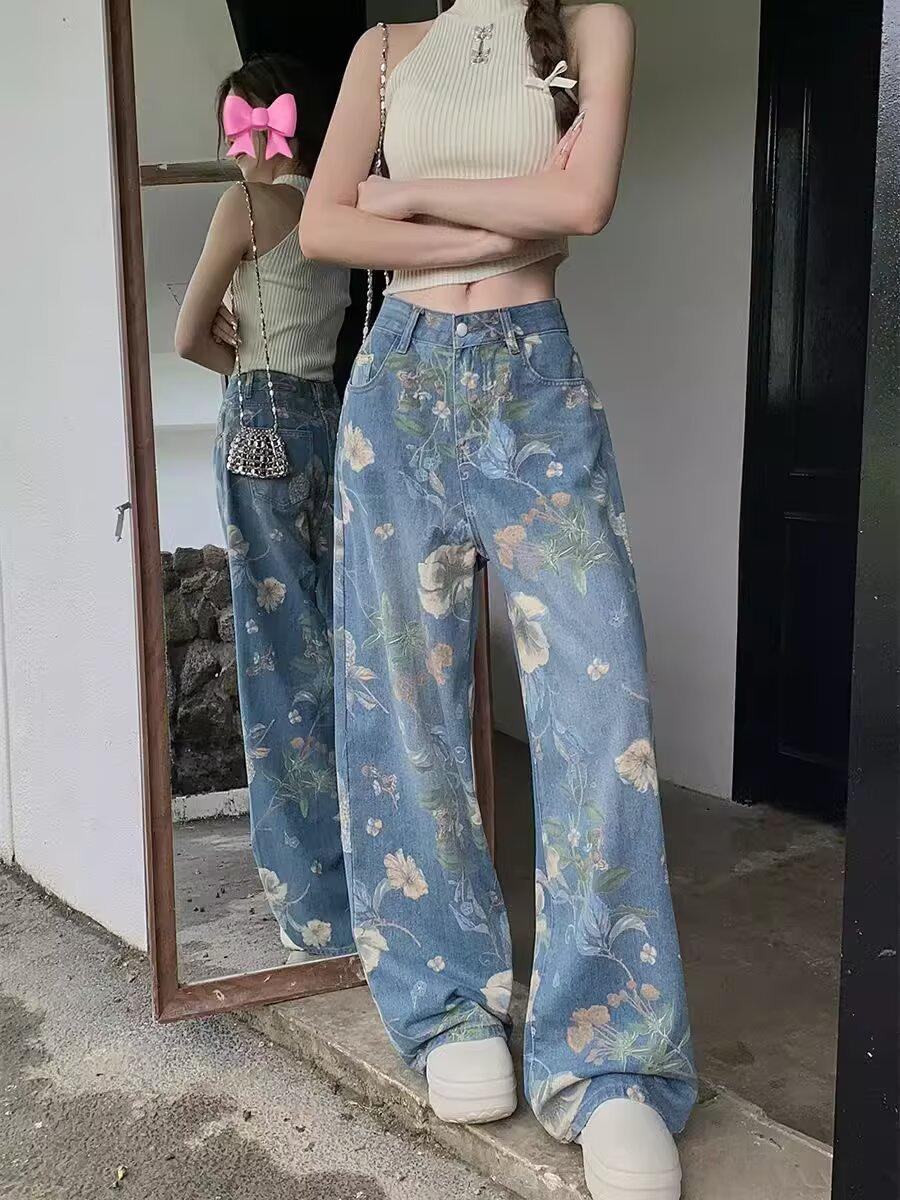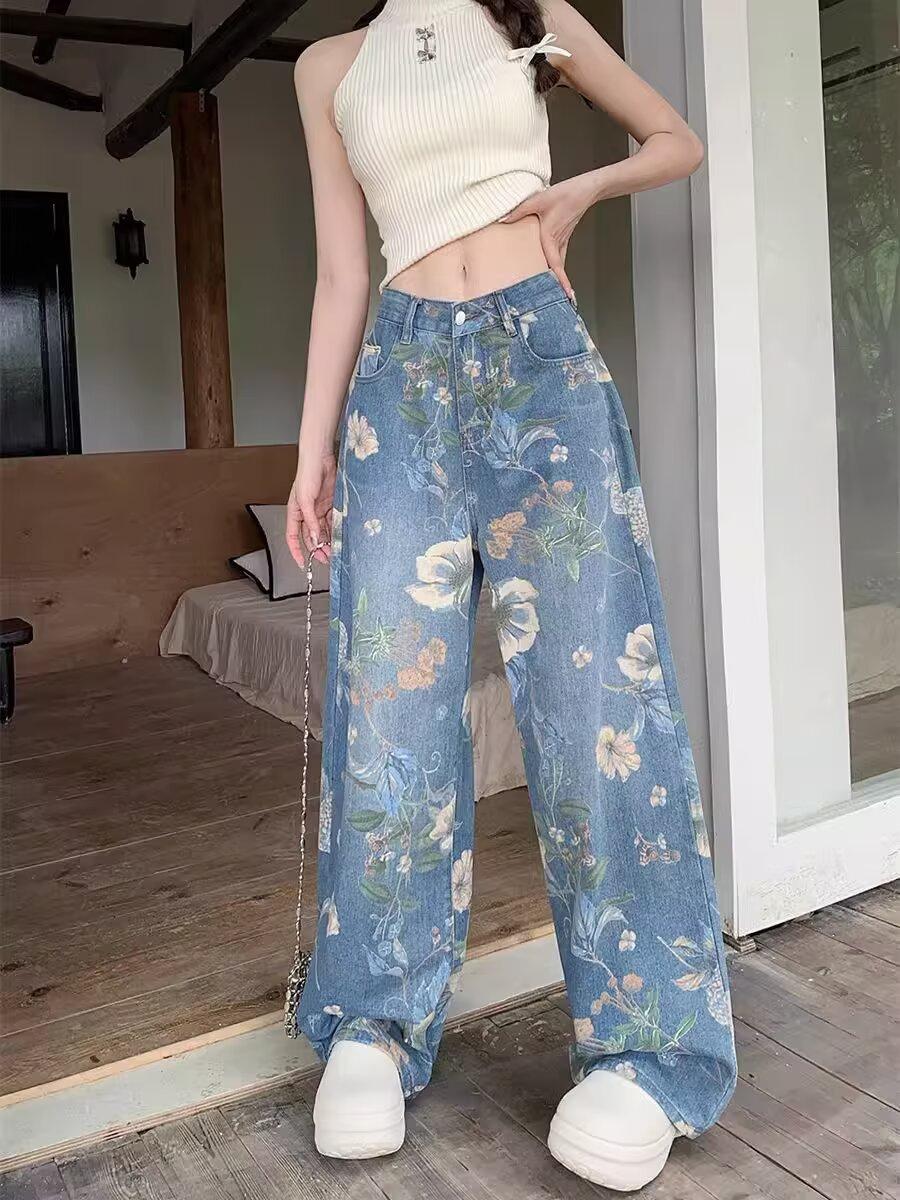 Jeans de Pierna Ancha con Estampado Retro Americano 2025 para Mujer Verano Nuevo Diseño Cintura Alta Pierna Recta Suelta Pantalones Largos hasta el Piso