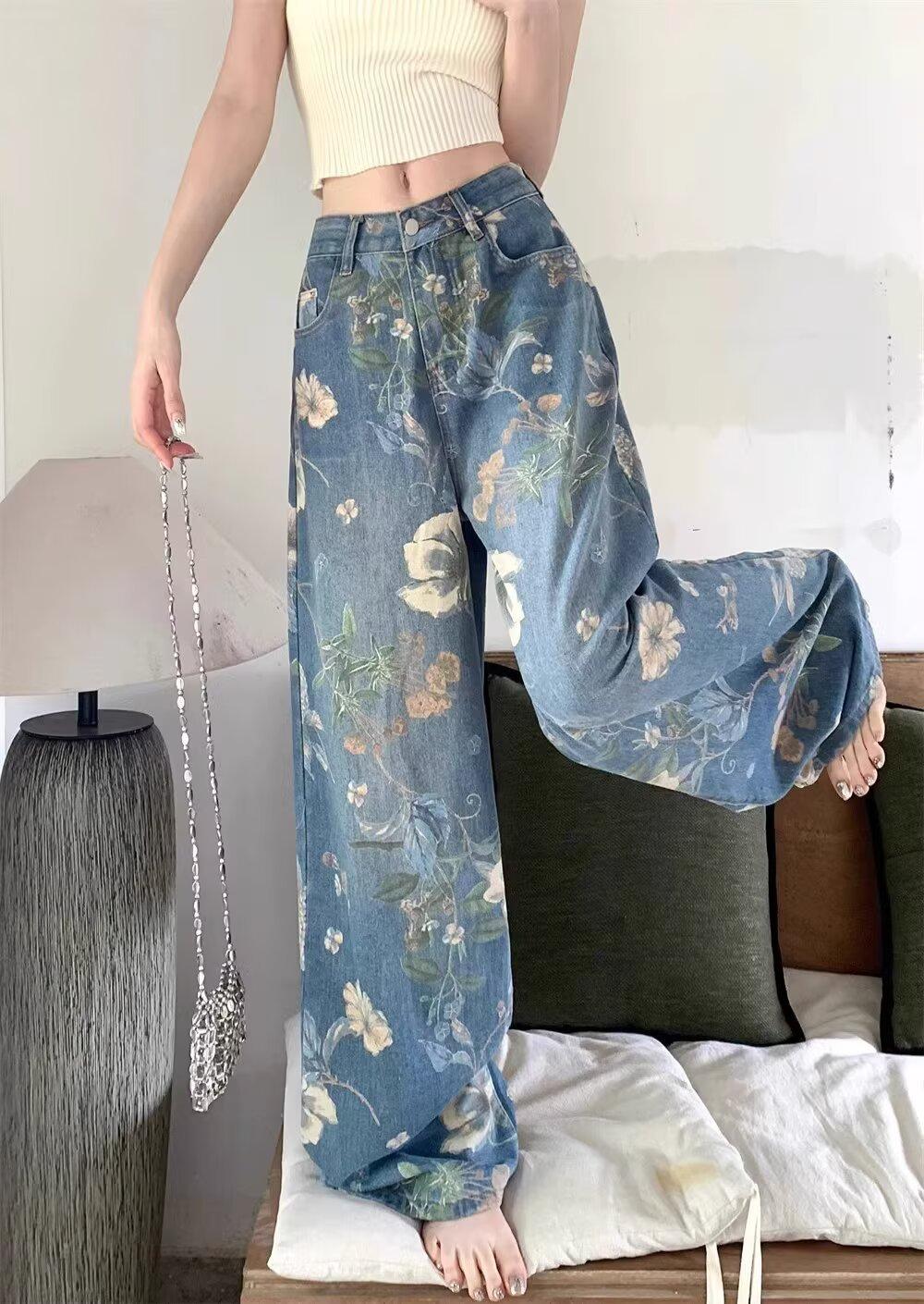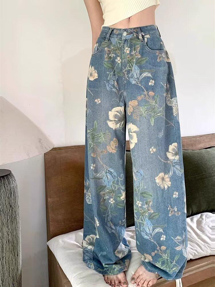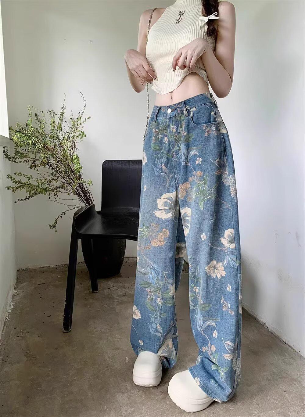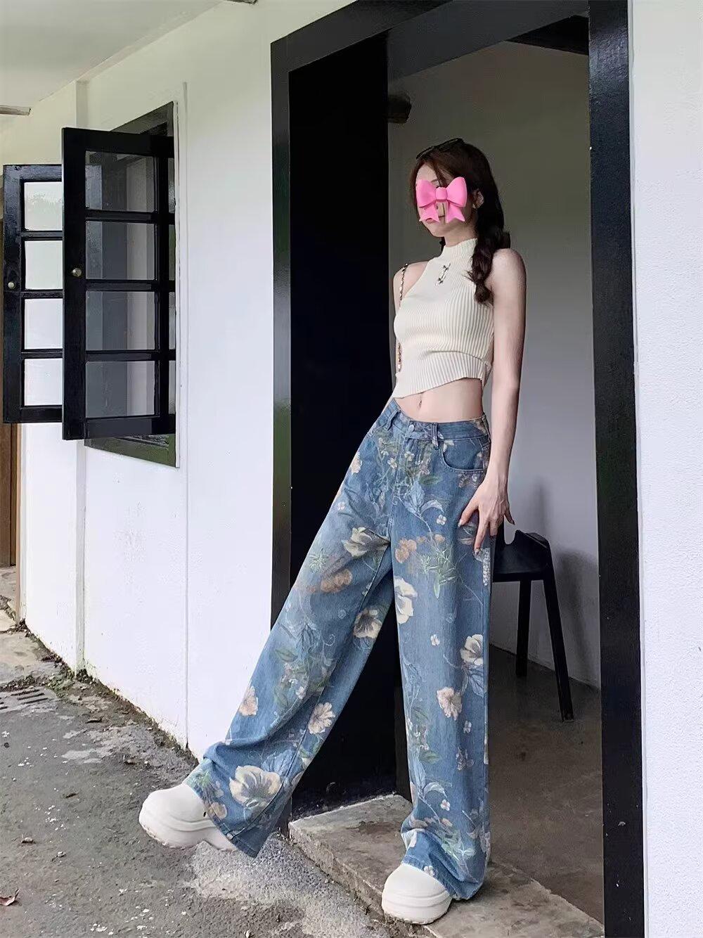 Jeans de Pierna Ancha con Estampado Retro Americano 2025 para Mujer Verano Nuevo Diseño Cintura Alta Pierna Recta Suelta Pantalones Largos hasta el Piso
