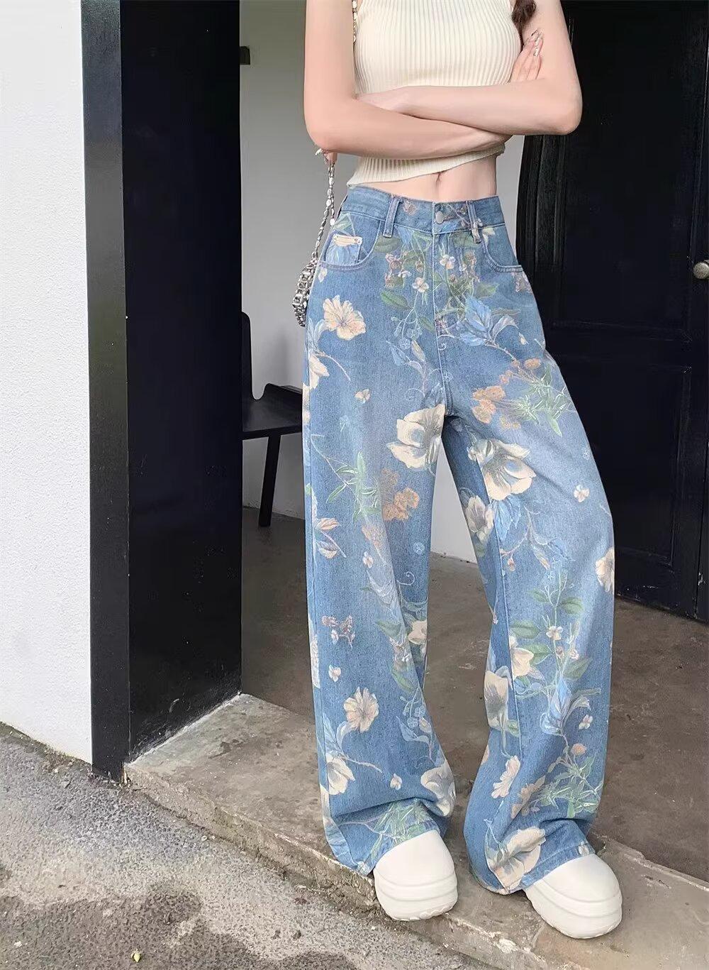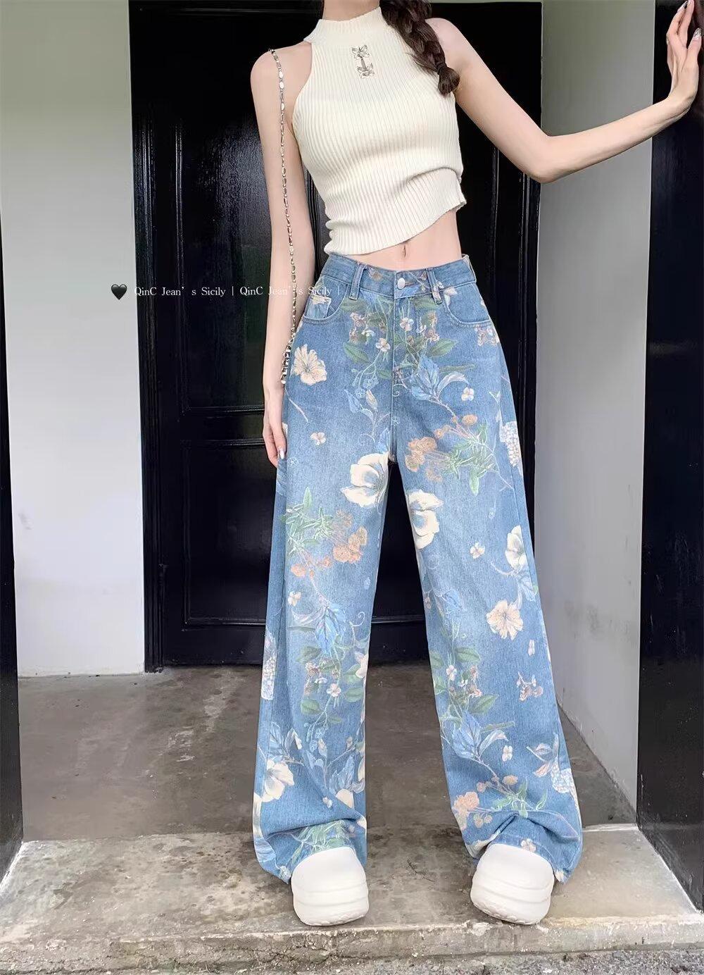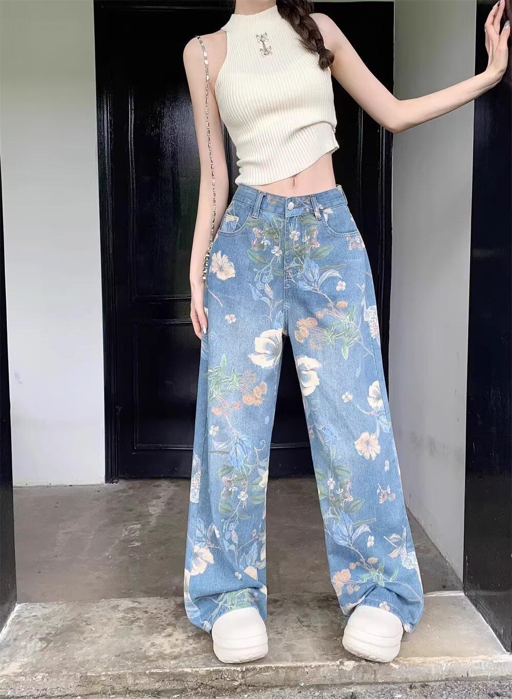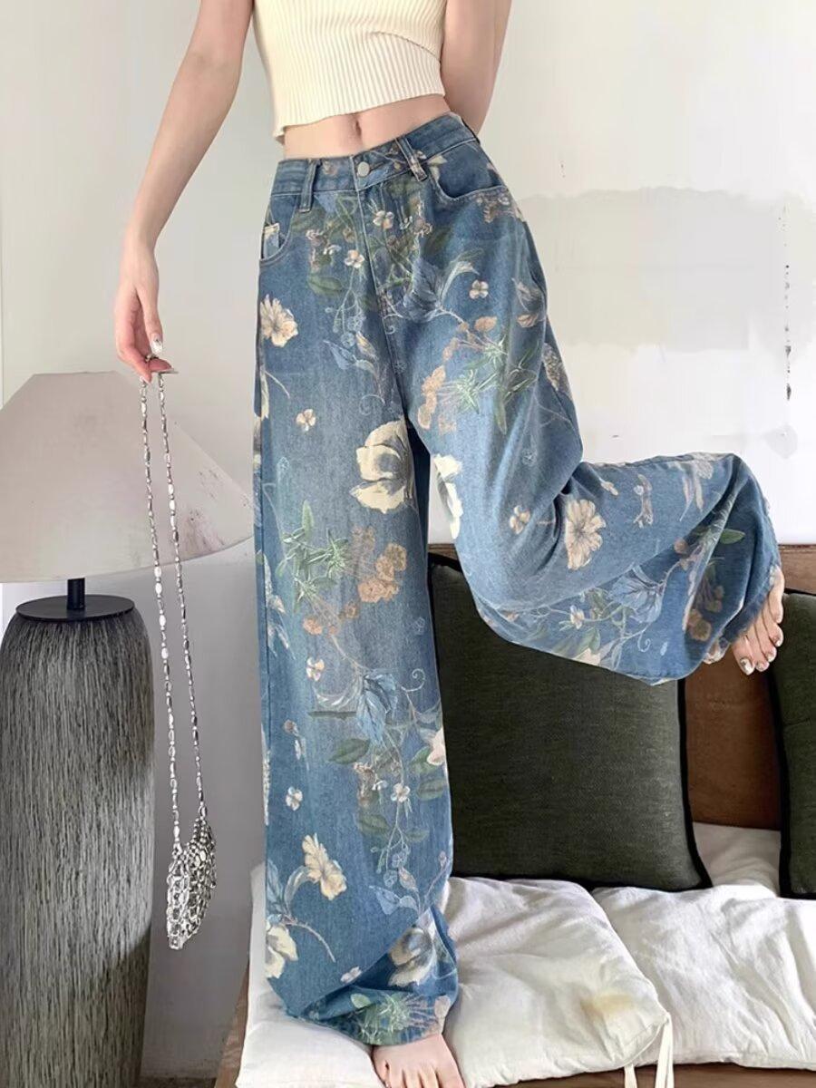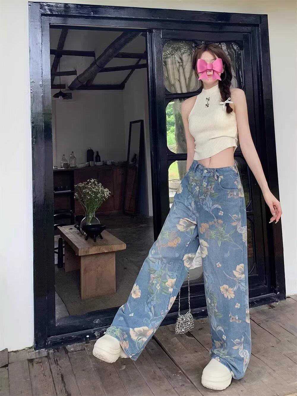 Jeans de Pierna Ancha con Estampado Retro Americano 2025 para Mujer Verano Nuevo Diseño Cintura Alta Pierna Recta Suelta Pantalones Largos hasta el Piso