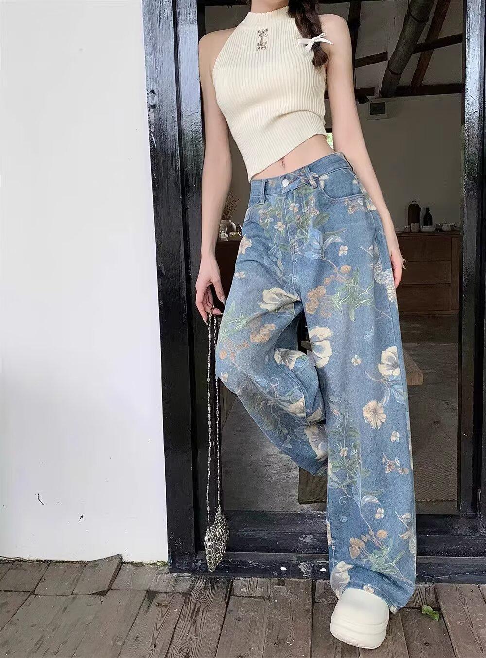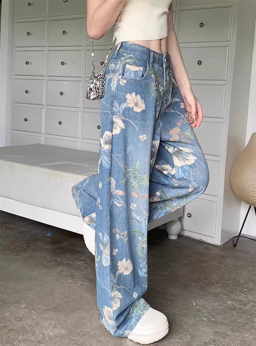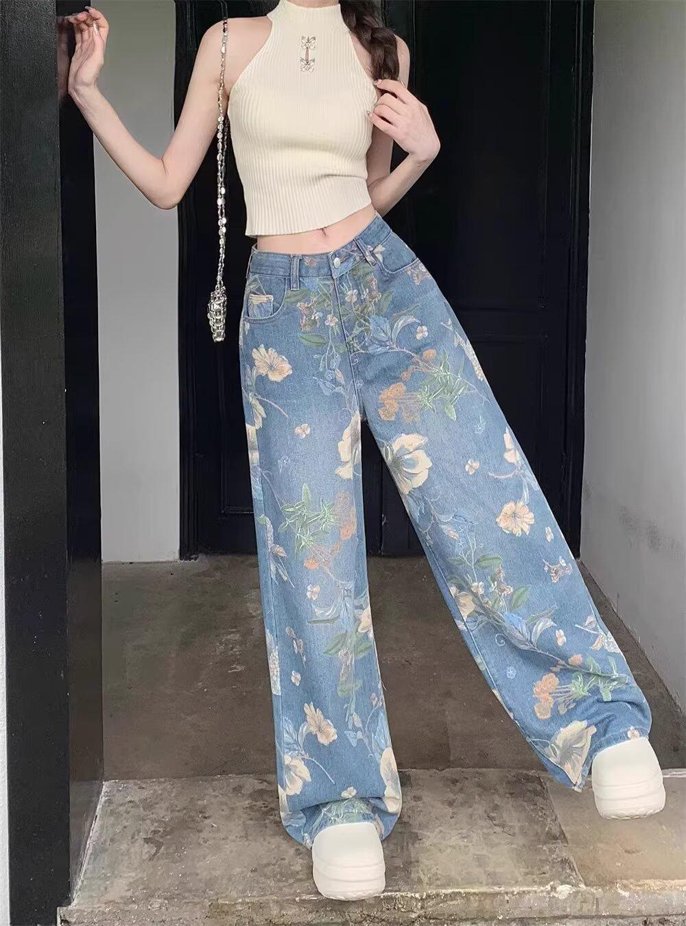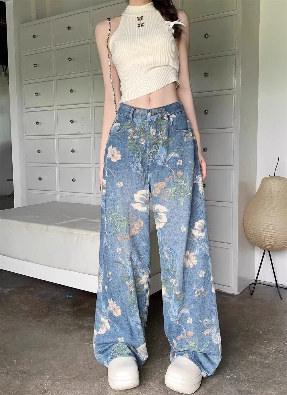 Jeans de Pierna Ancha con Estampado Retro Americano 2025 para Mujer Verano Nuevo Diseño Cintura Alta Pierna Recta Suelta Pantalones Largos hasta el Piso