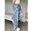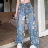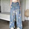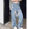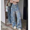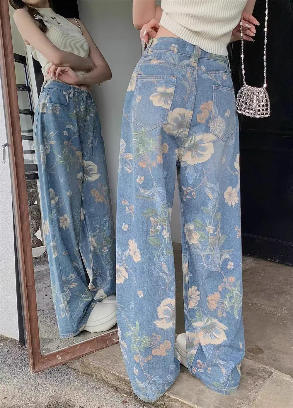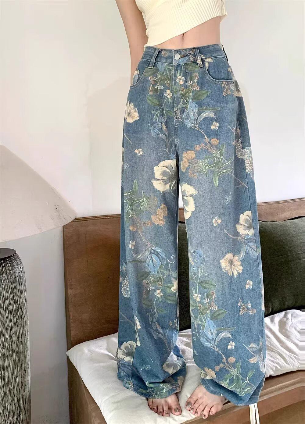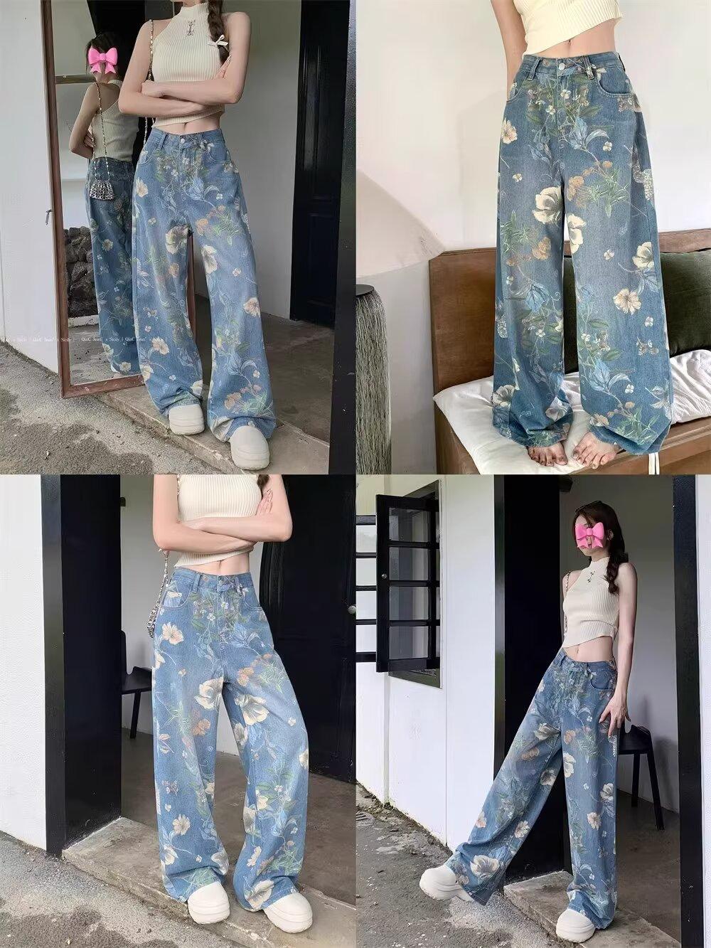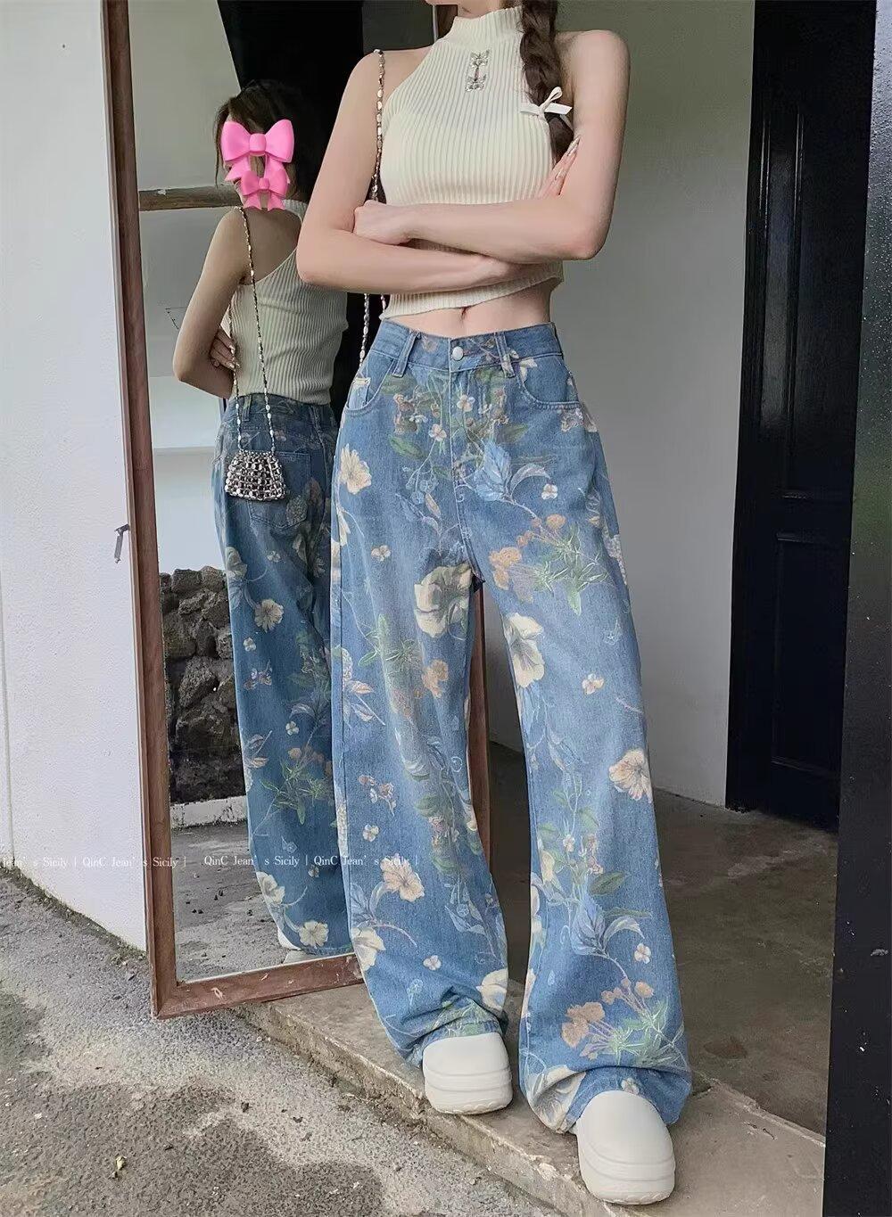 Jeans de Pierna Ancha con Estampado Retro Americano 2025 para Mujer Verano Nuevo Diseño Cintura Alta Pierna Recta Suelta Pantalones Largos hasta el Piso