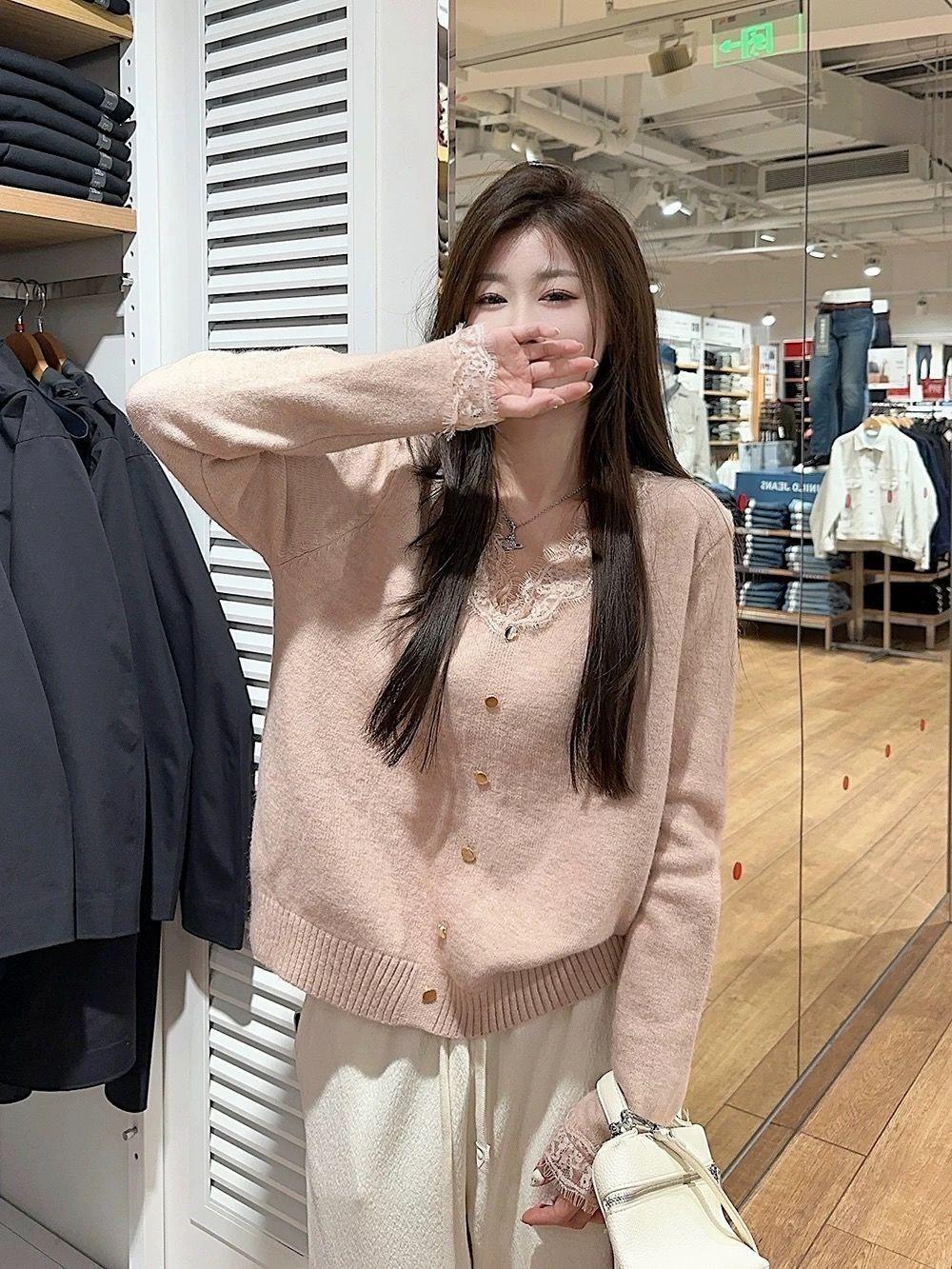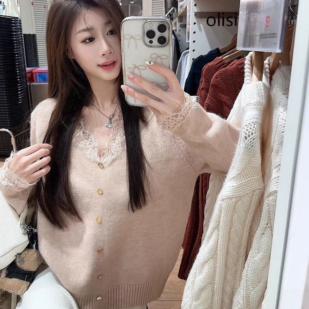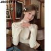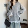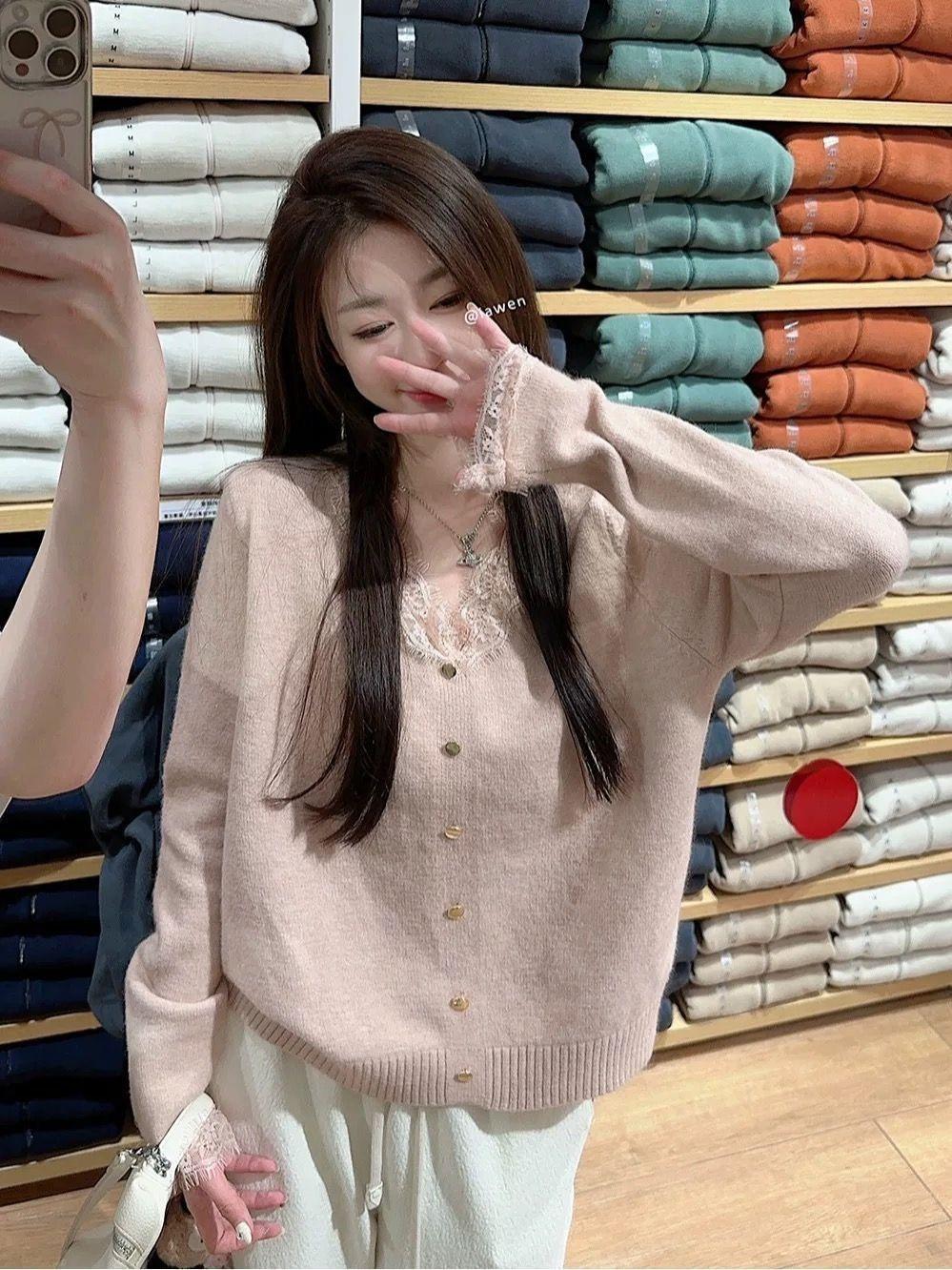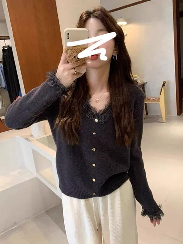 Suéter Negro con Encaje Dopamina para Mujer Invierno Versátil Capa Base Tejido Suave Suelto Top Interior