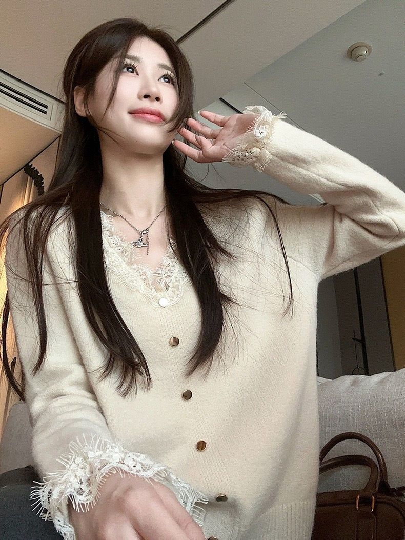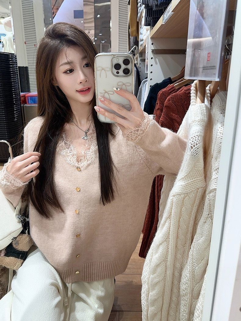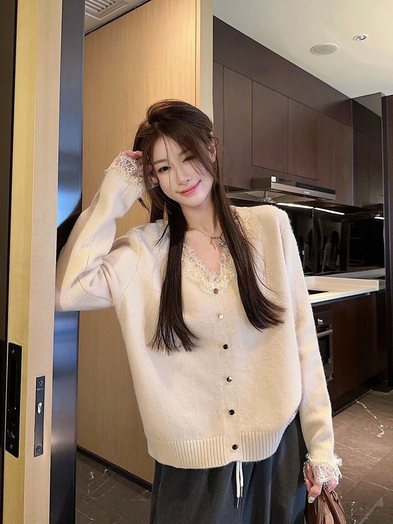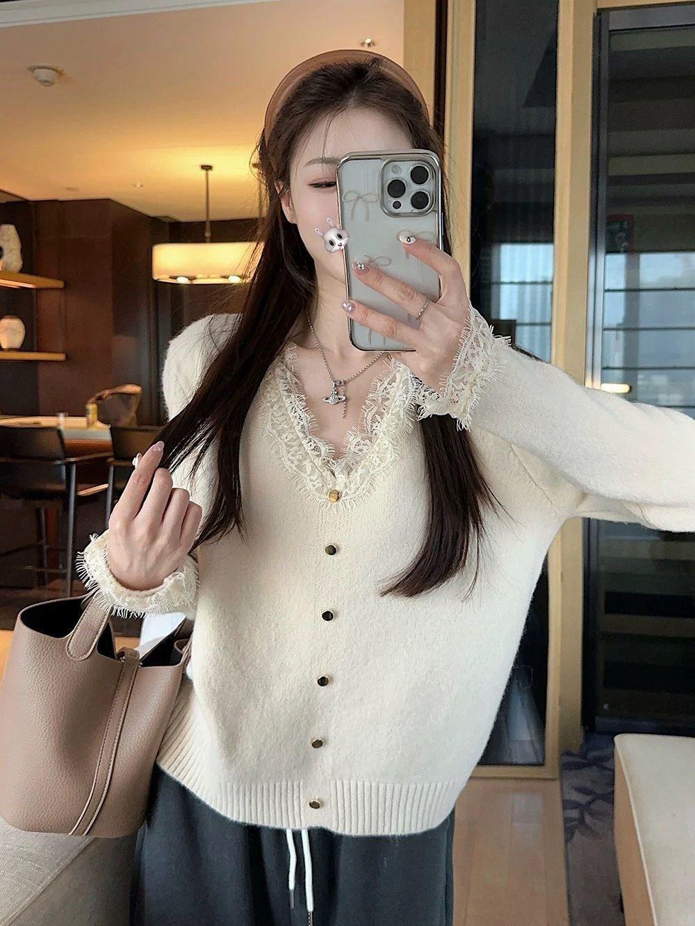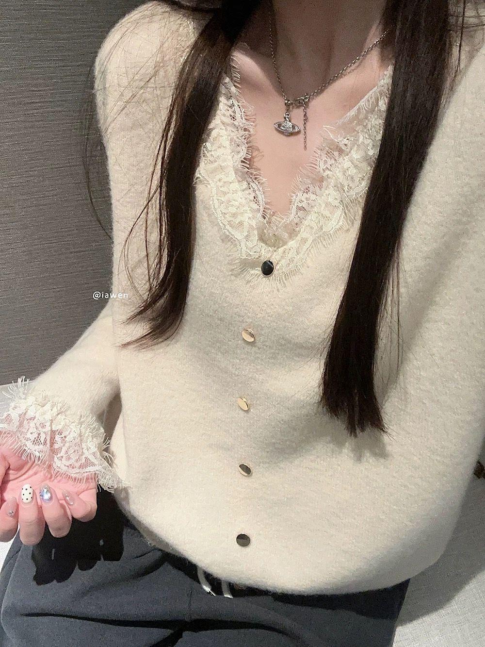 Suéter Negro con Encaje Dopamina para Mujer Invierno Versátil Capa Base Tejido Suave Suelto Top Interior