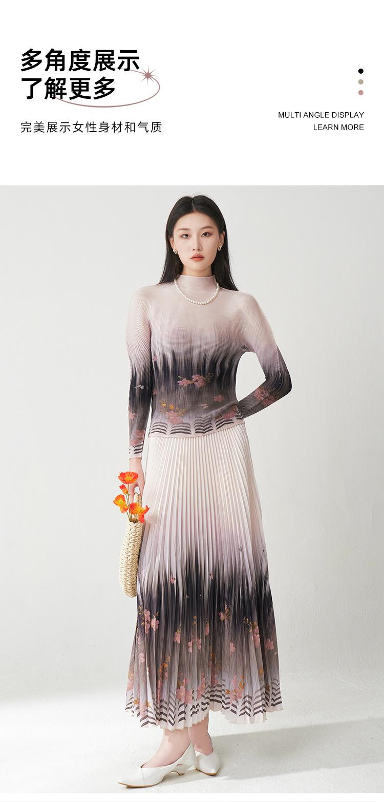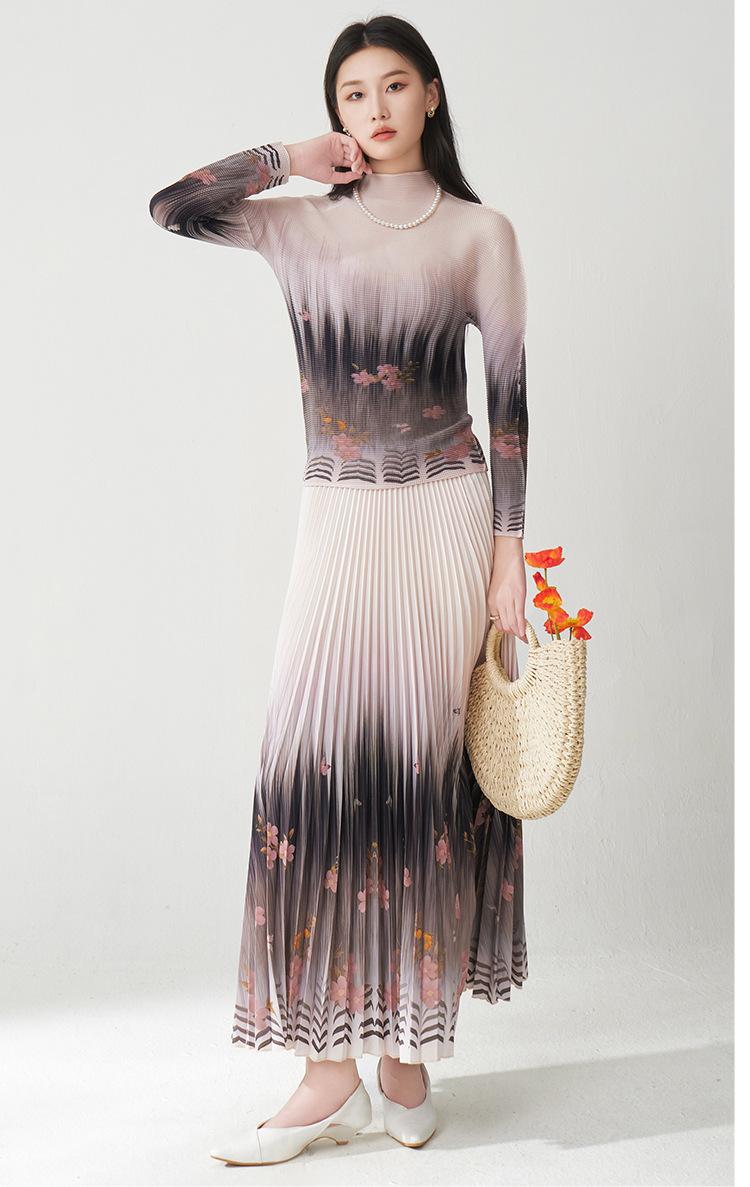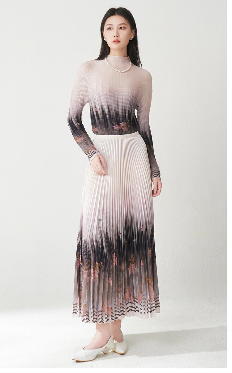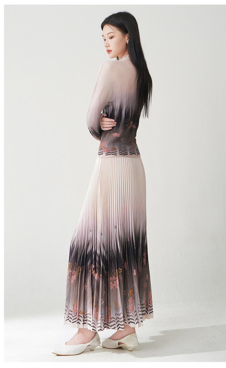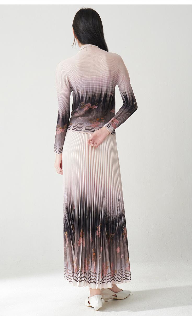 2025 Super Caliente Falda de Dos Piezas Falda Midi Estampado Manga Larga Capa Base Top Ropa Exterior Temperamento Elegante Conjunto Miyake Otoño