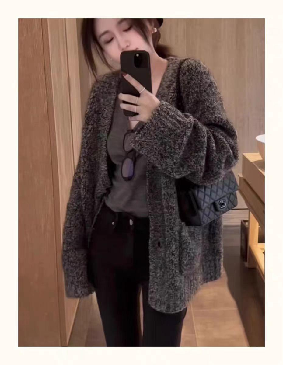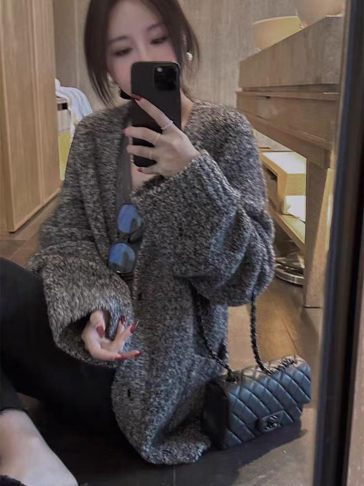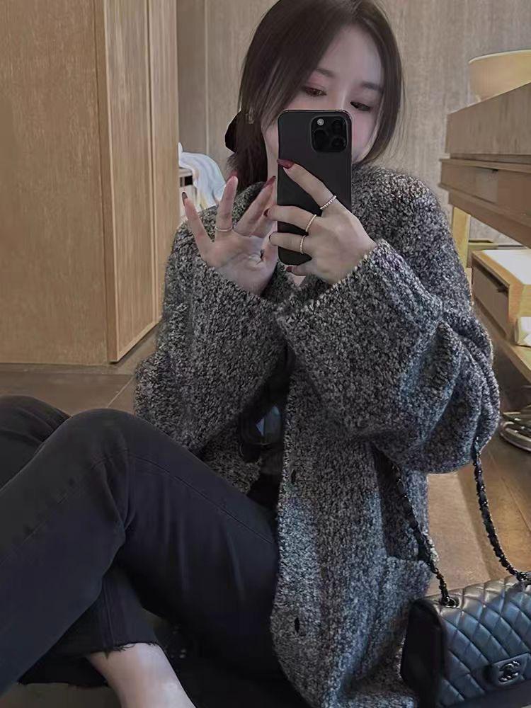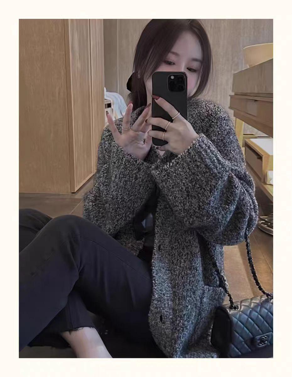 Cárdigan de punto holgado de largo medio con cuello en V estilo coreano nuevo otoño 2025 para mujer, diseño con sentido, suéter de estilo perezoso