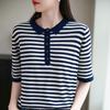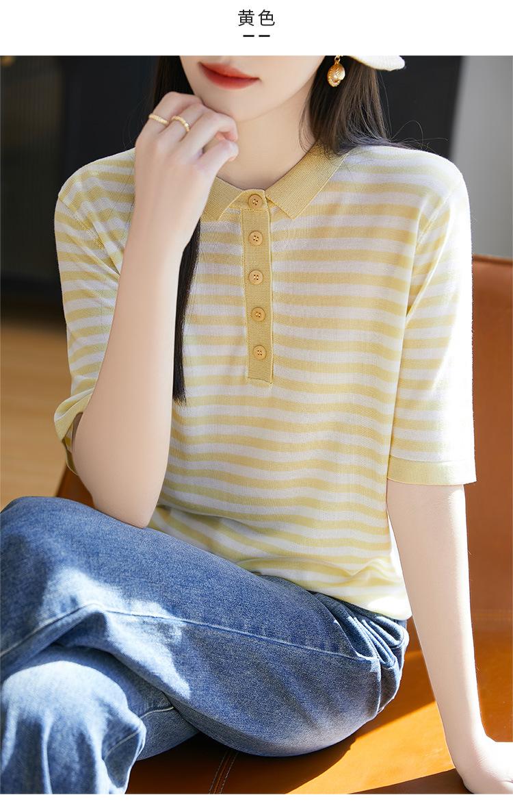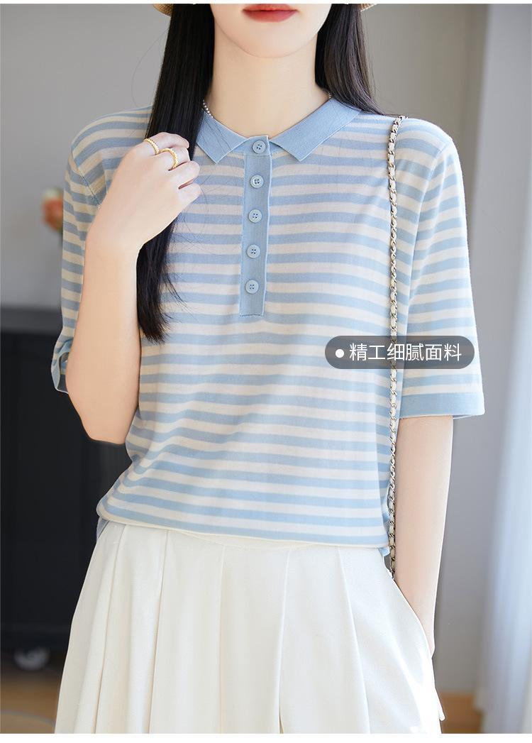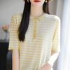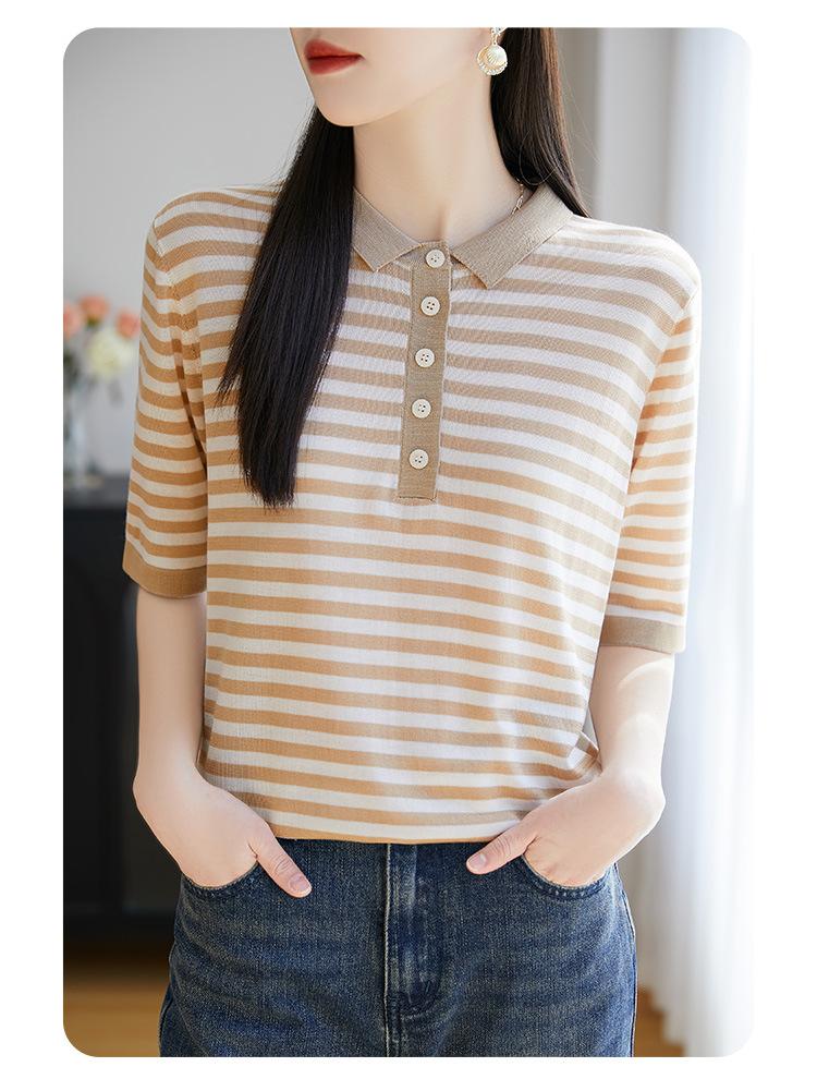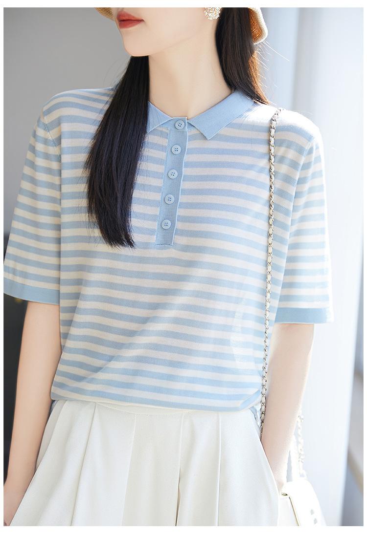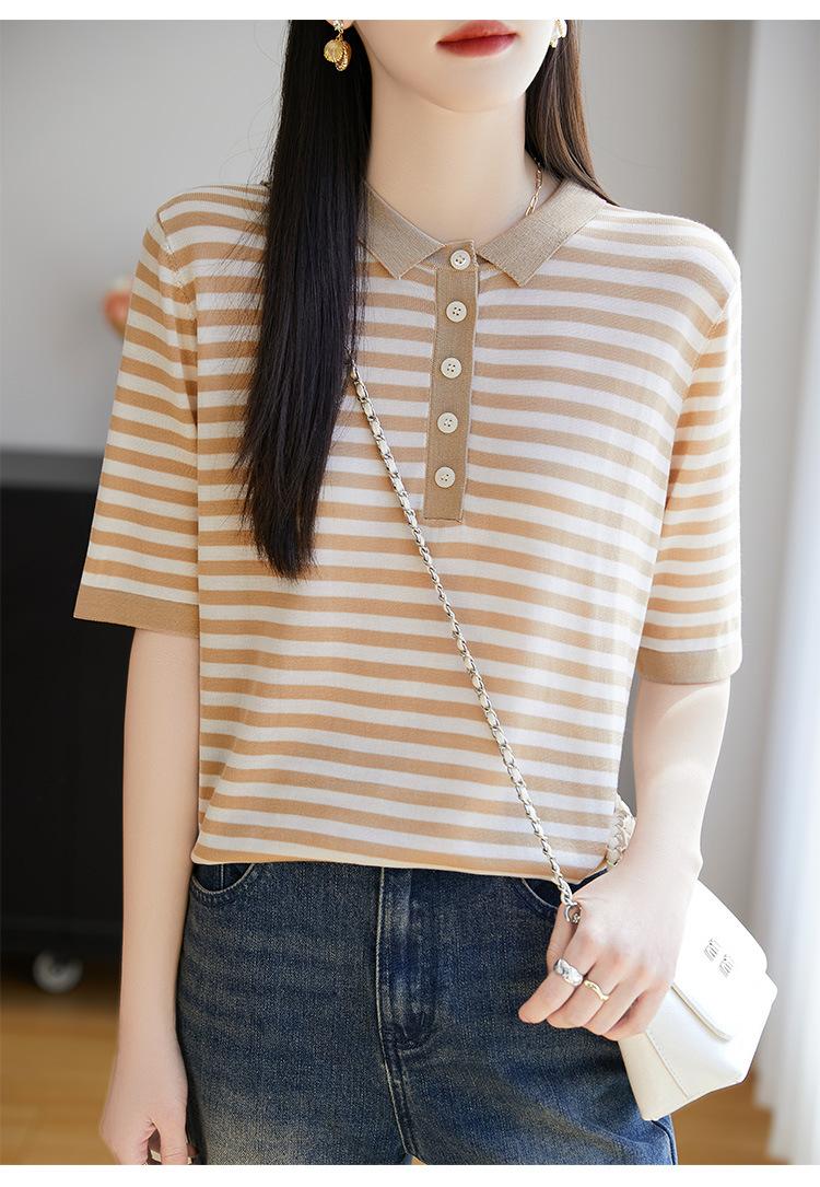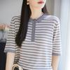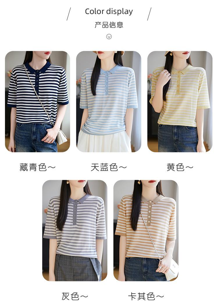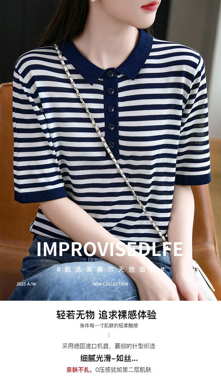 Primavera y Verano 2025 Nuevo Camiseta de Punto Semiabierta Tencel Lyocell Lassel de Manga Corta a Rayas con Combinación de Colores Top Camiseta Básica