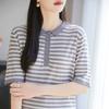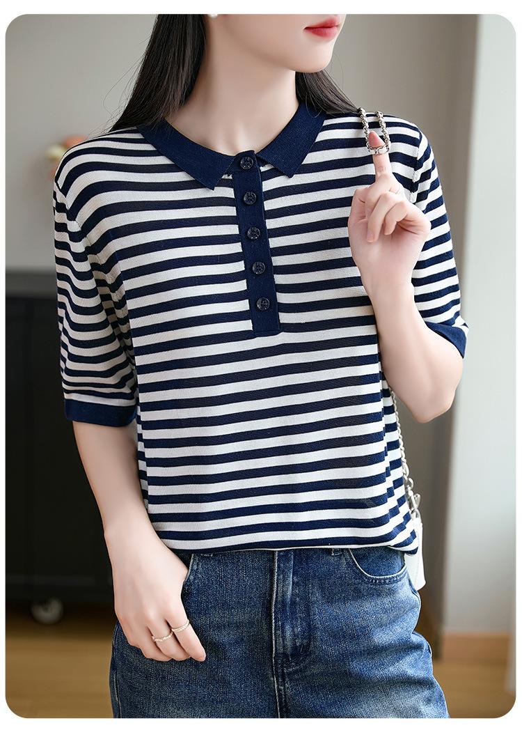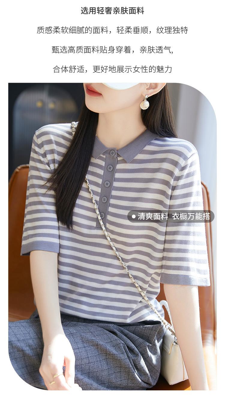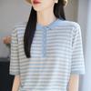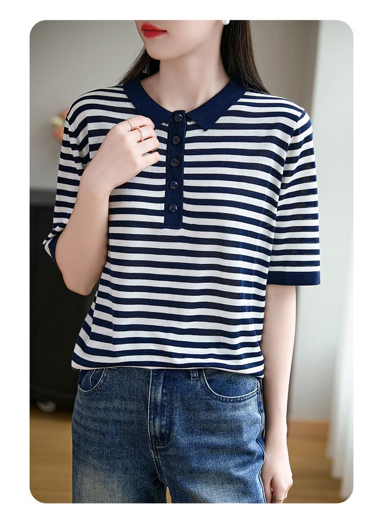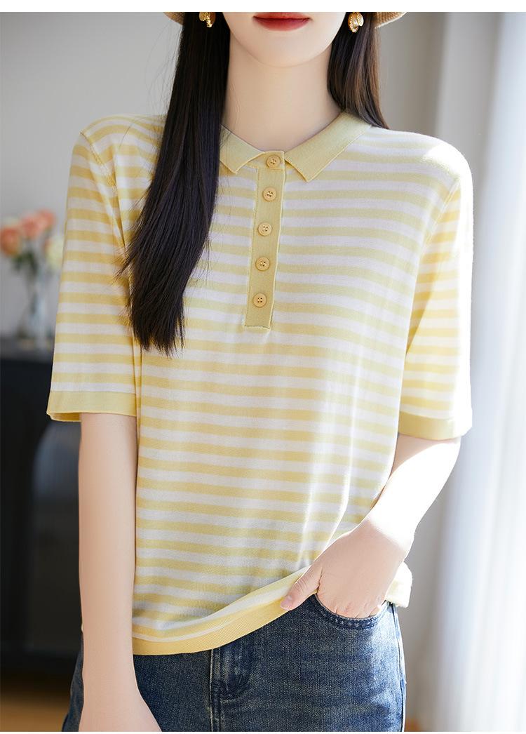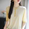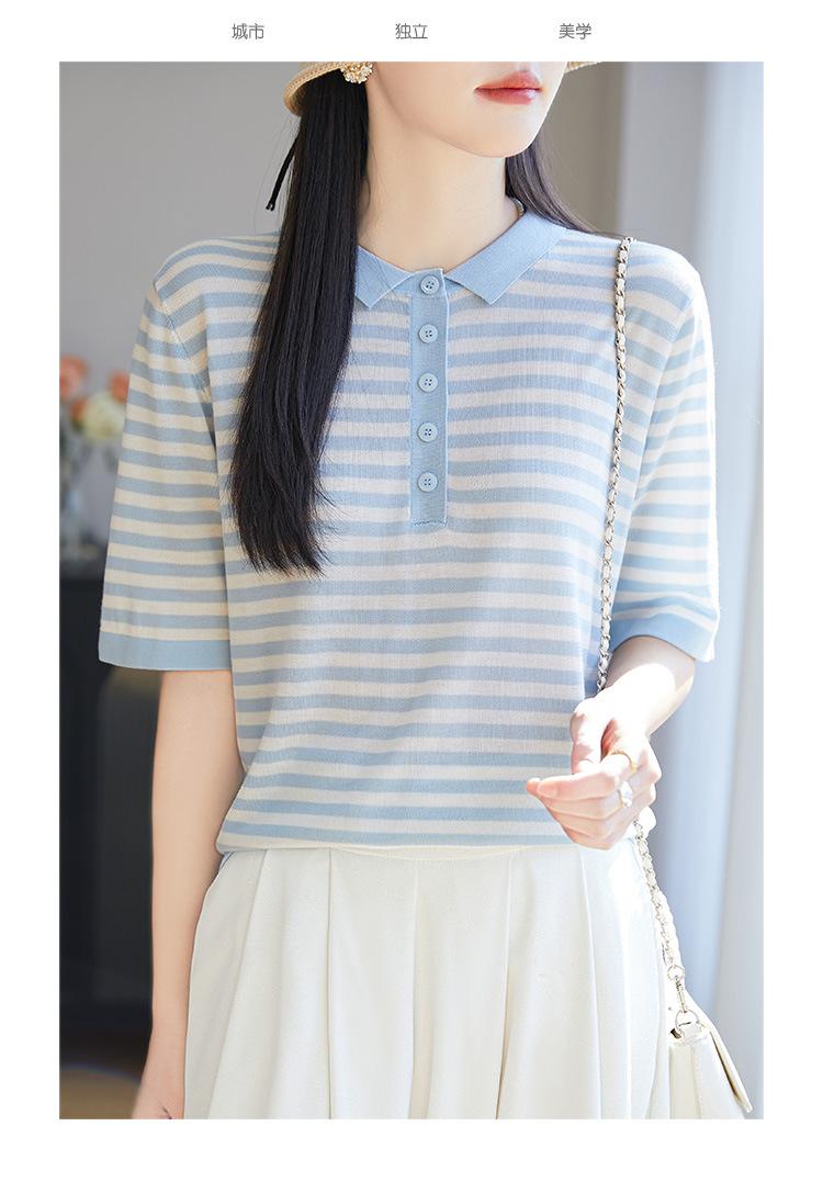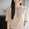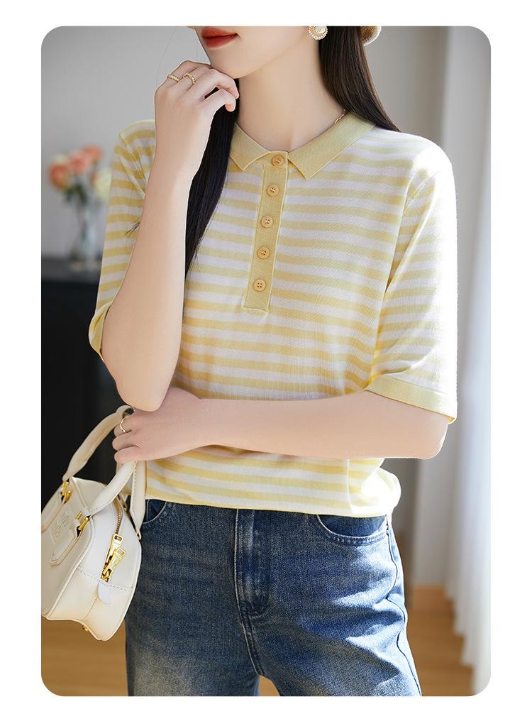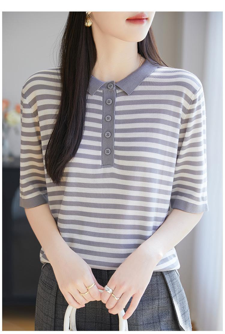 Primavera y Verano 2025 Nuevo Camiseta de Punto Semiabierta Tencel Lyocell Lassel de Manga Corta a Rayas con Combinación de Colores Top Camiseta Básica