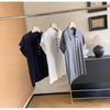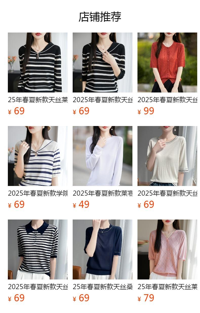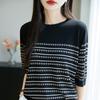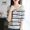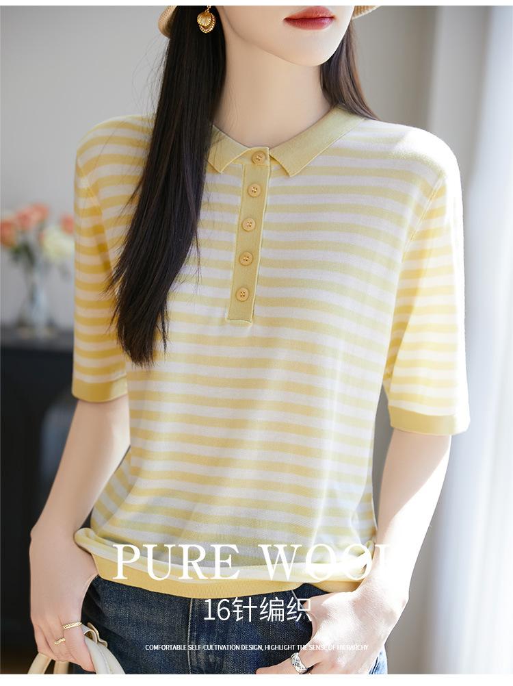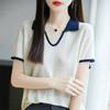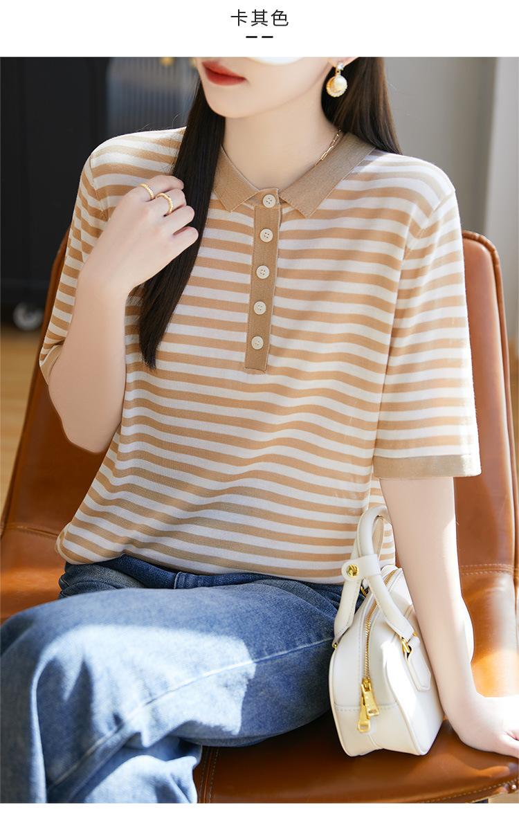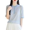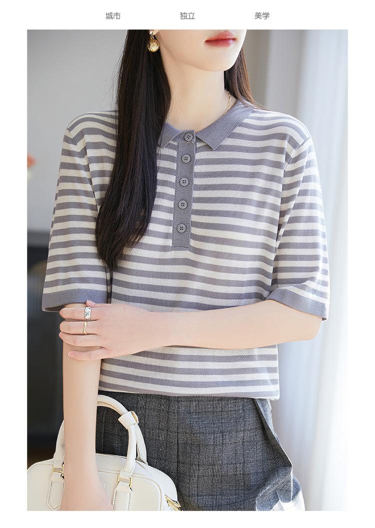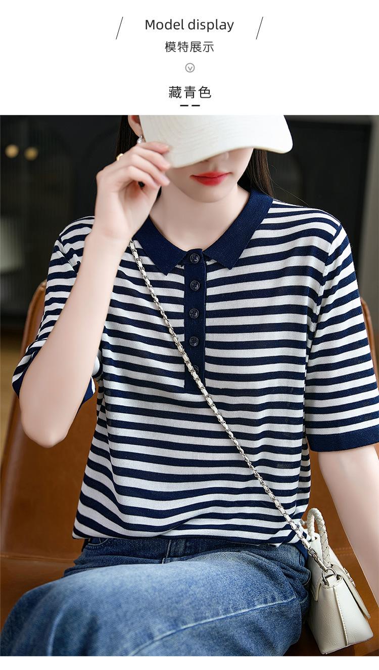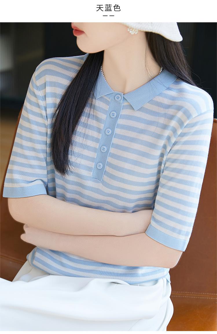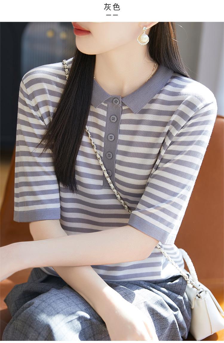 Primavera y Verano 2025 Nuevo Camiseta de Punto Semiabierta Tencel Lyocell Lassel de Manga Corta a Rayas con Combinación de Colores Top Camiseta Básica