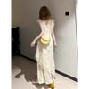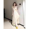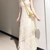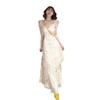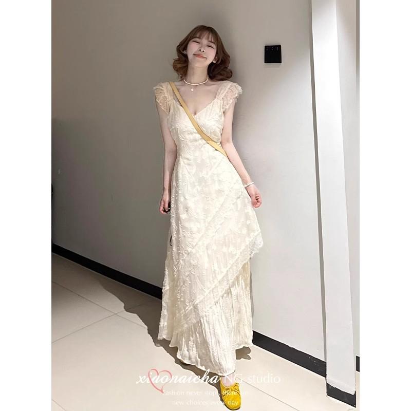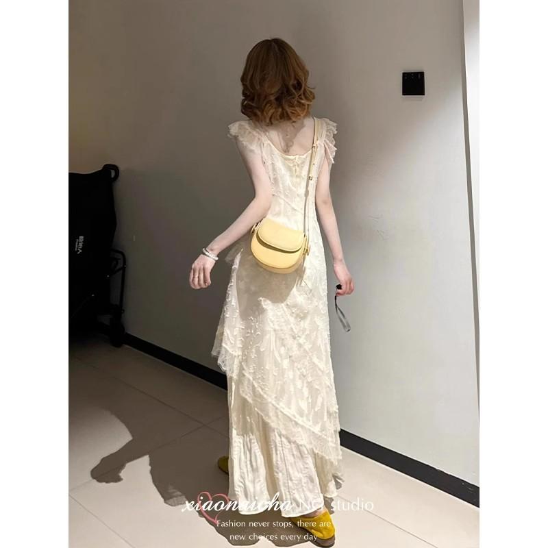 Vestido de Tirantes con Encaje de Estilo Resort Francés y Manga Corta de Mariposa para Mujer, Verano, Adelgazante de Cintura, Falda Larga de Hada