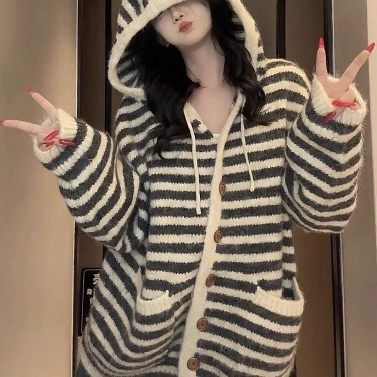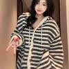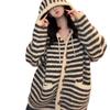 Top holgado de talla grande suéter estilo perezoso mujeres otoño e invierno nuevo abrigo con capucha color block a rayas tejido cárdigan de mujer