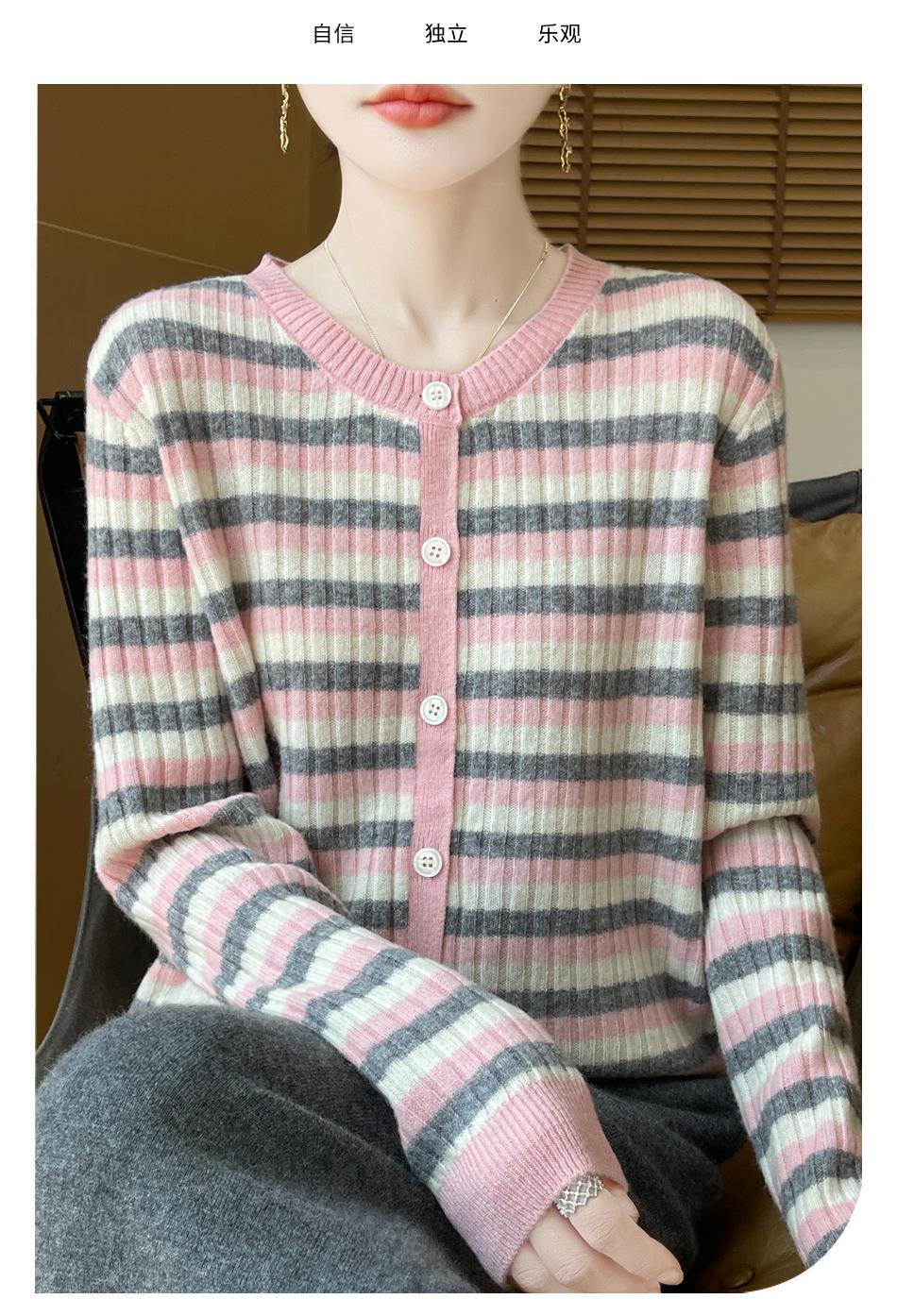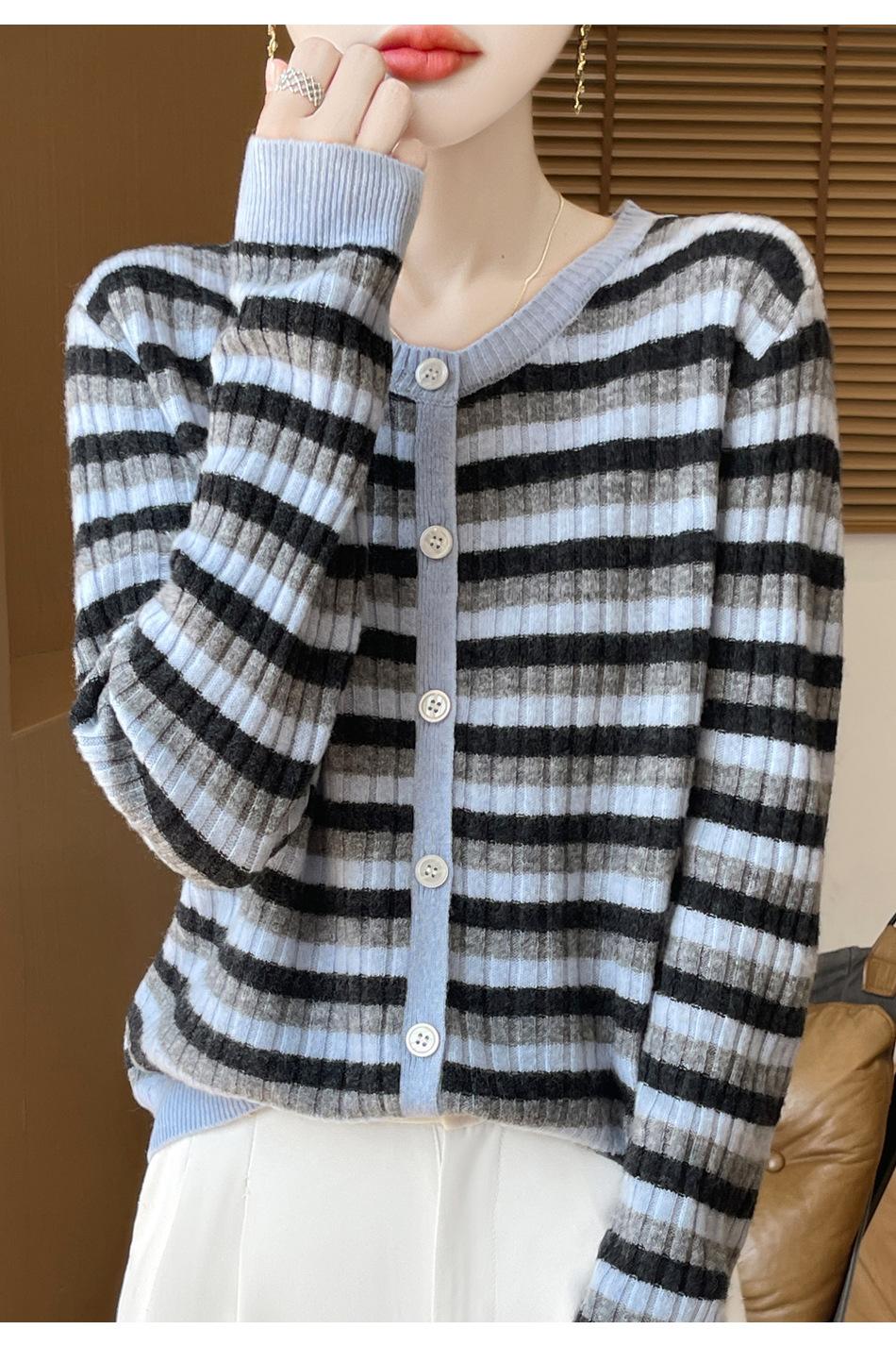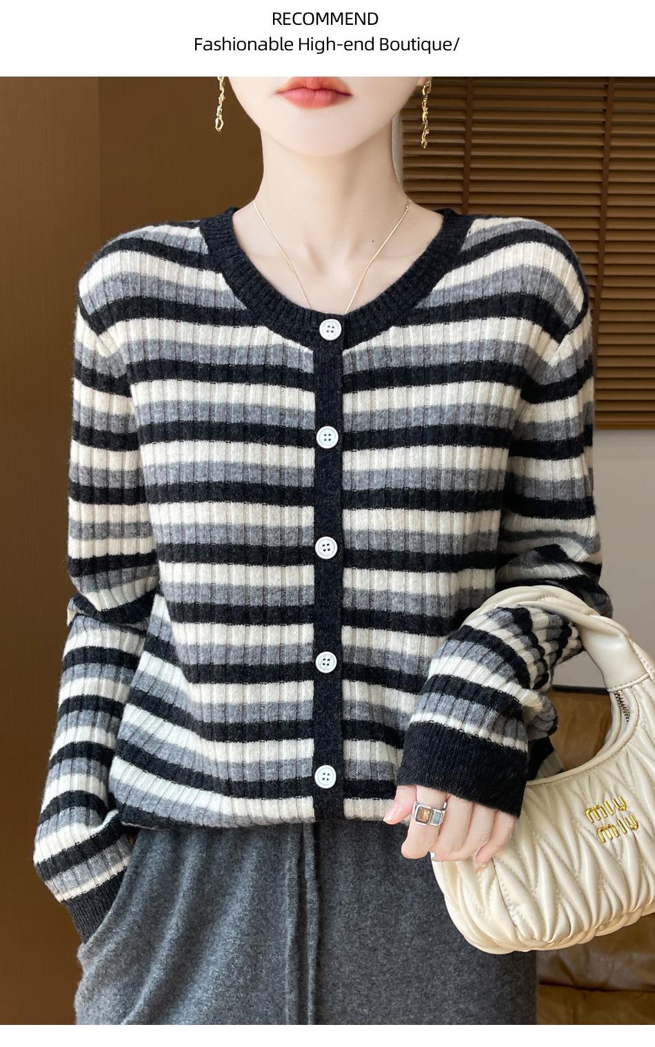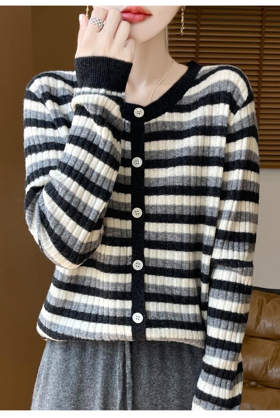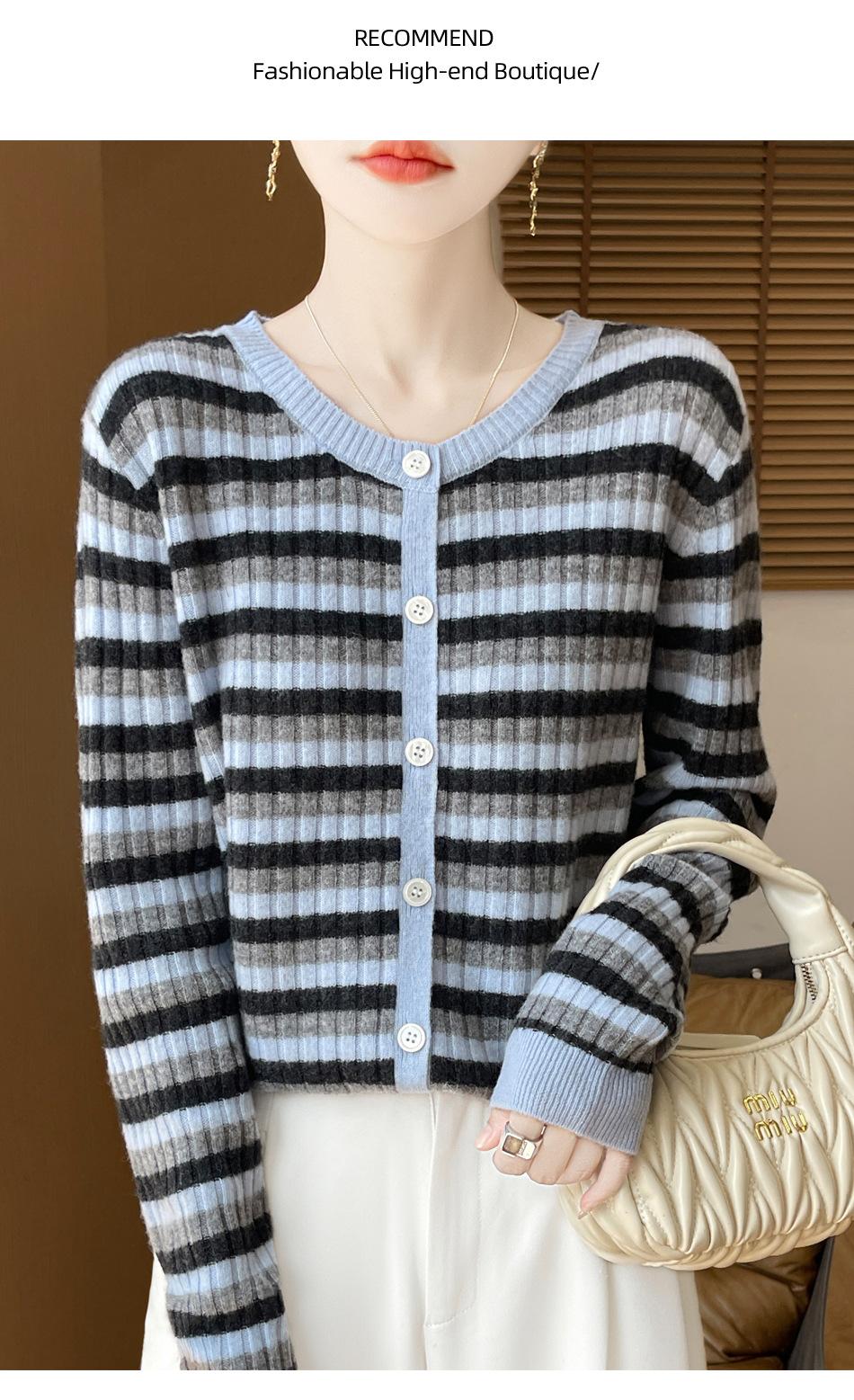 Cárdigan de Punto Básico para Mujer de Otoño/Invierno 2025 Nuevo, 100% Lana Pura, Holgado, Cuello Redondo, Bloque de Color a Rayas, Abotonado