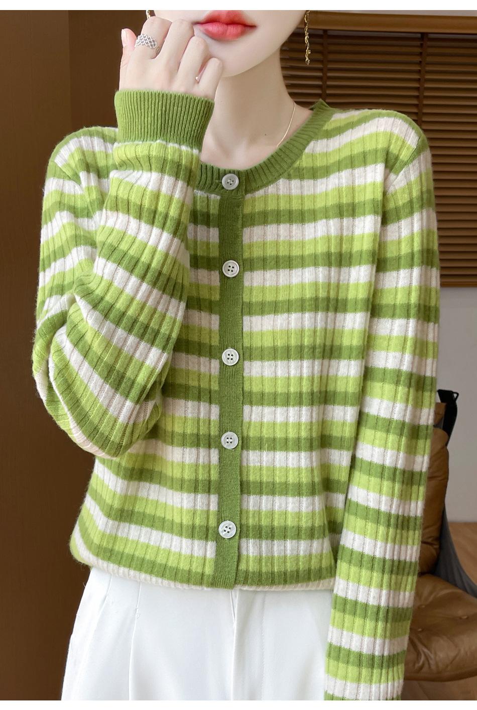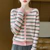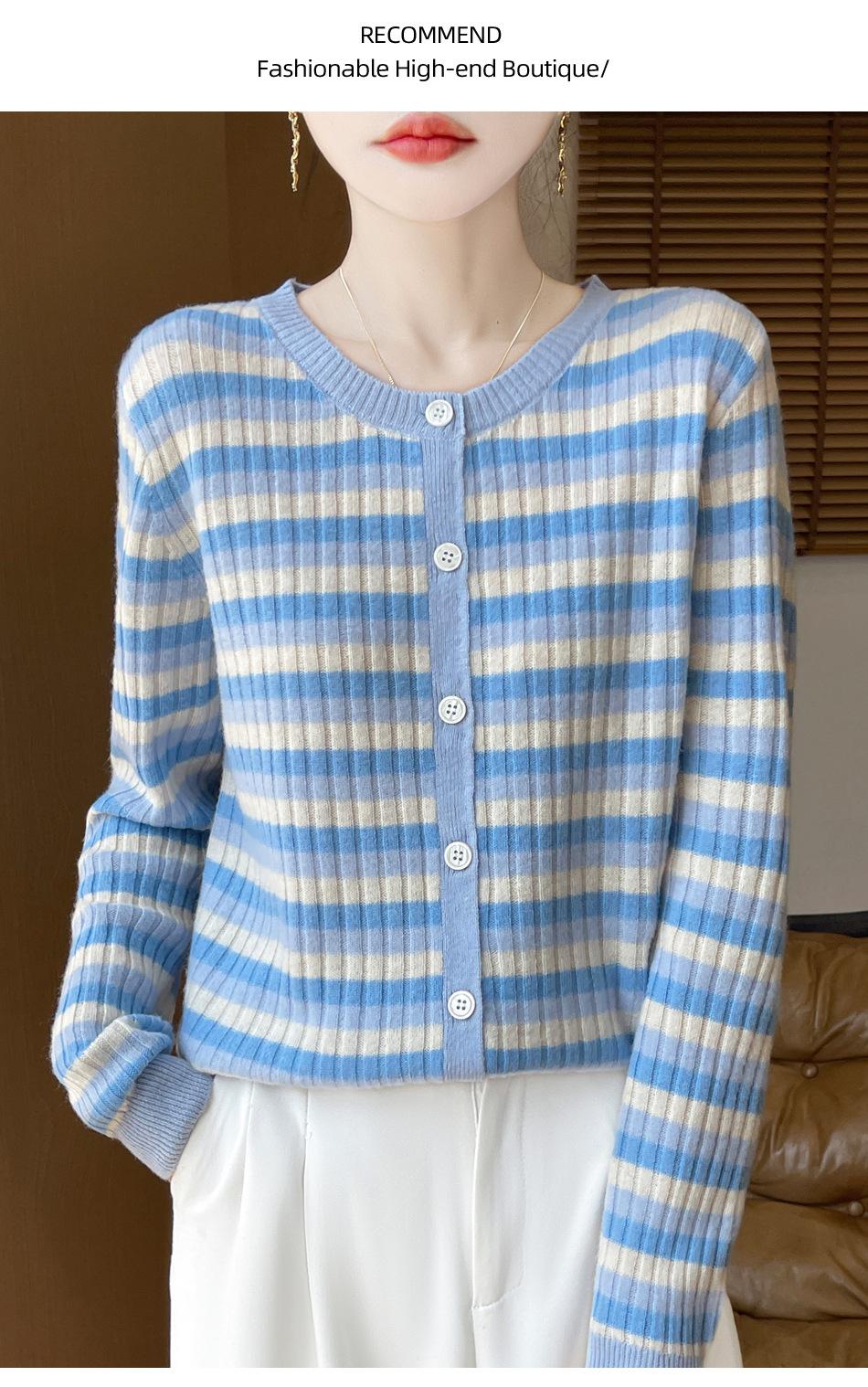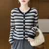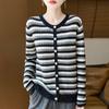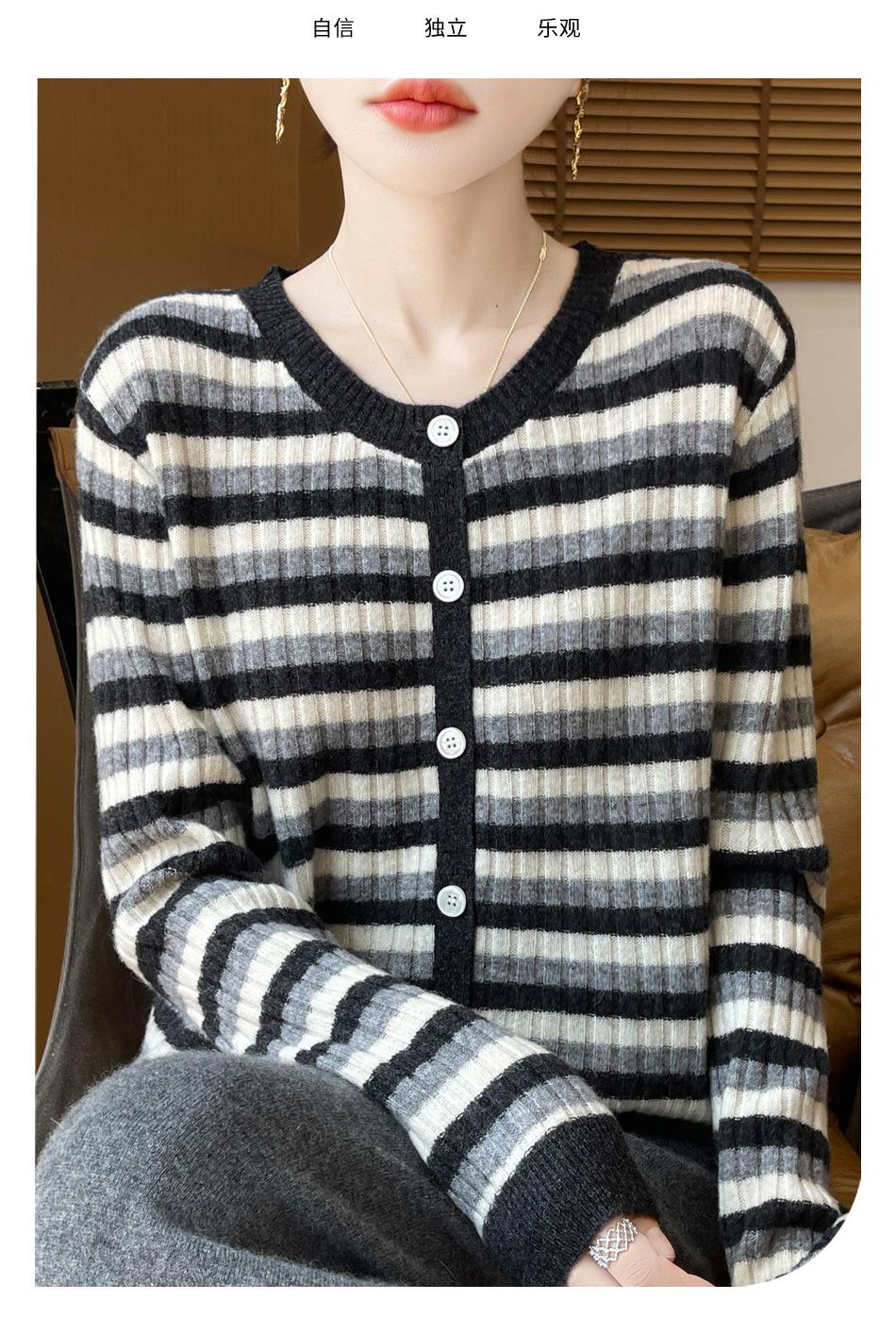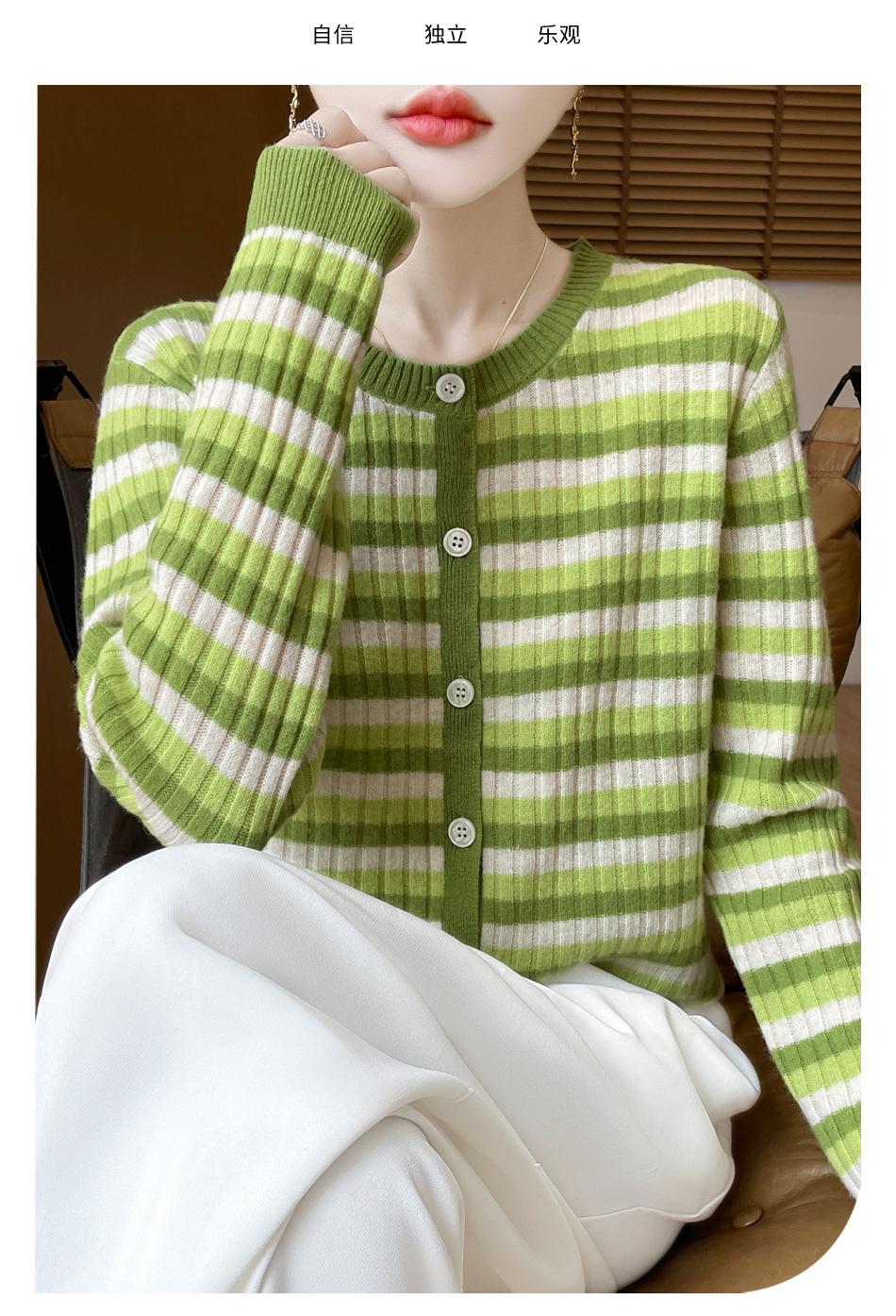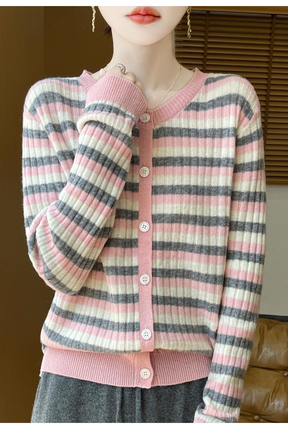Cárdigan de Punto Básico para Mujer de Otoño/Invierno 2025 Nuevo, 100% Lana Pura, Holgado, Cuello Redondo, Bloque de Color a Rayas, Abotonado