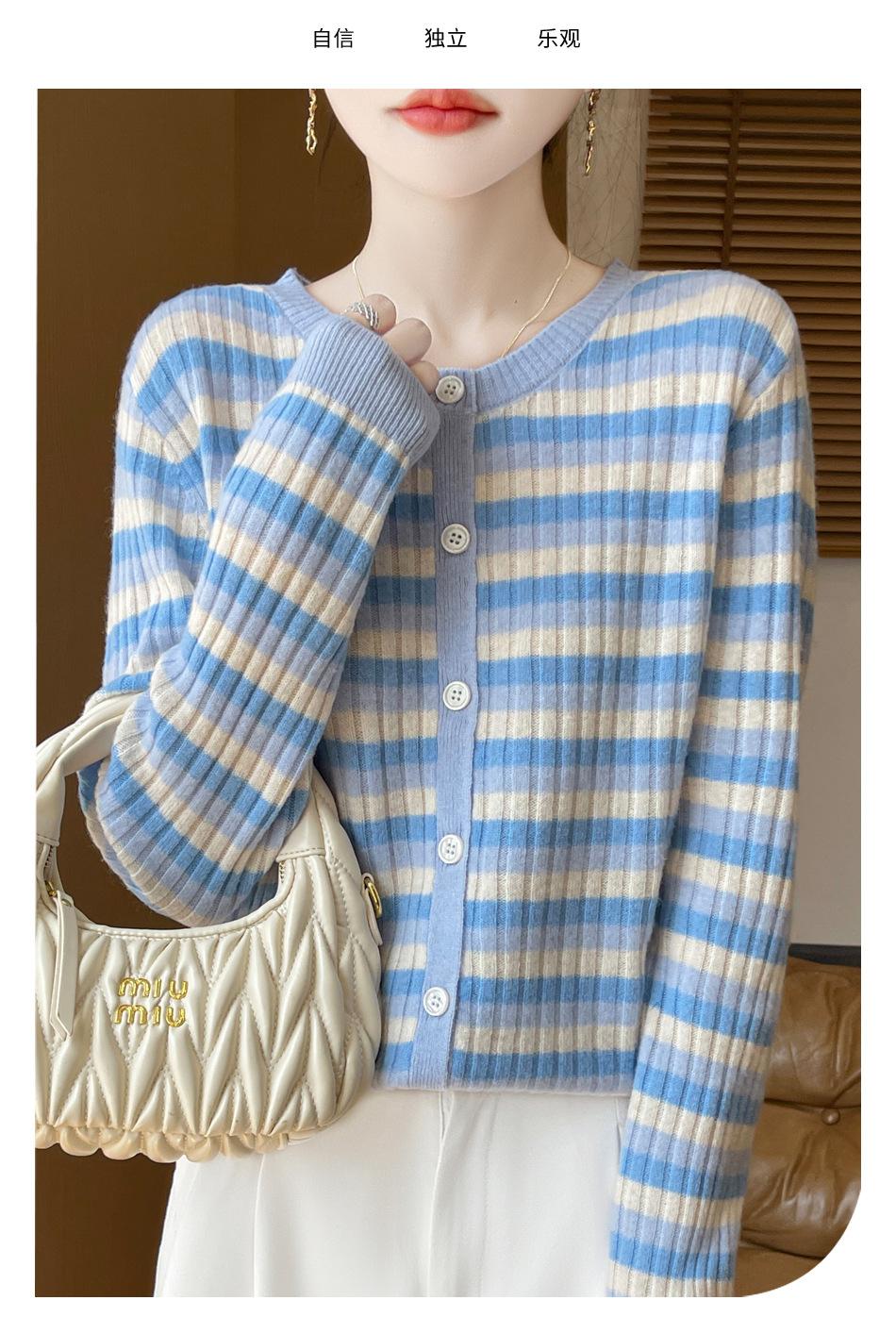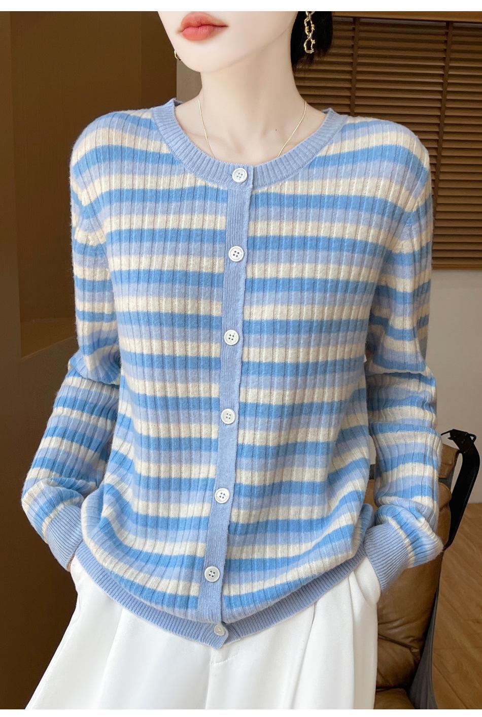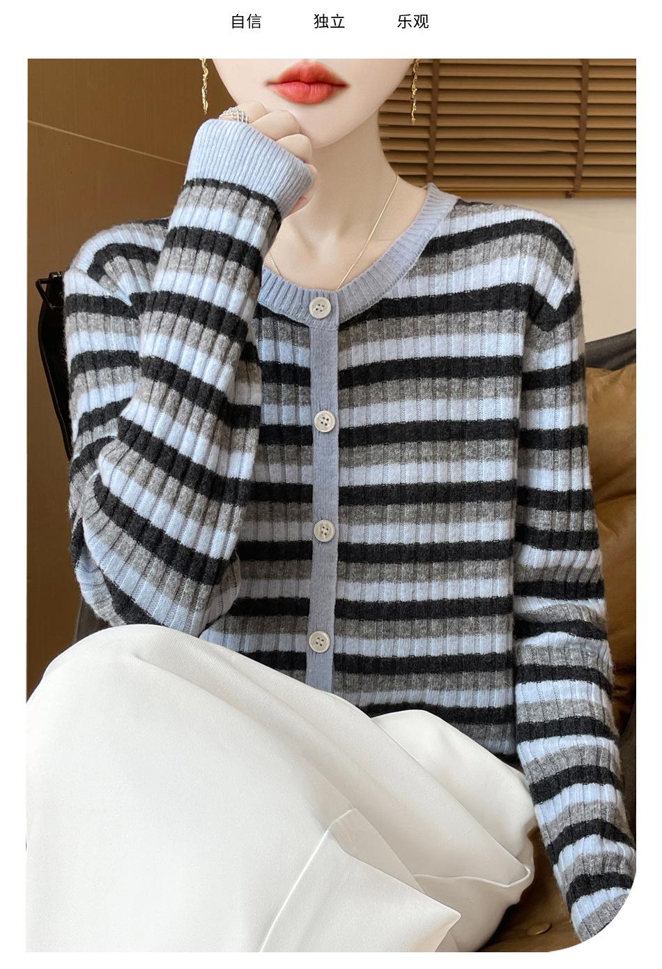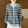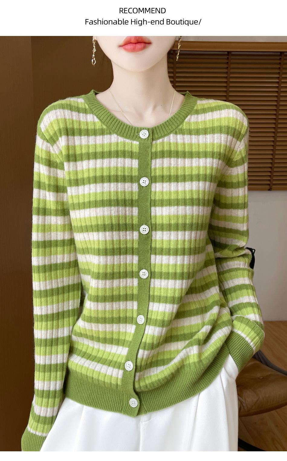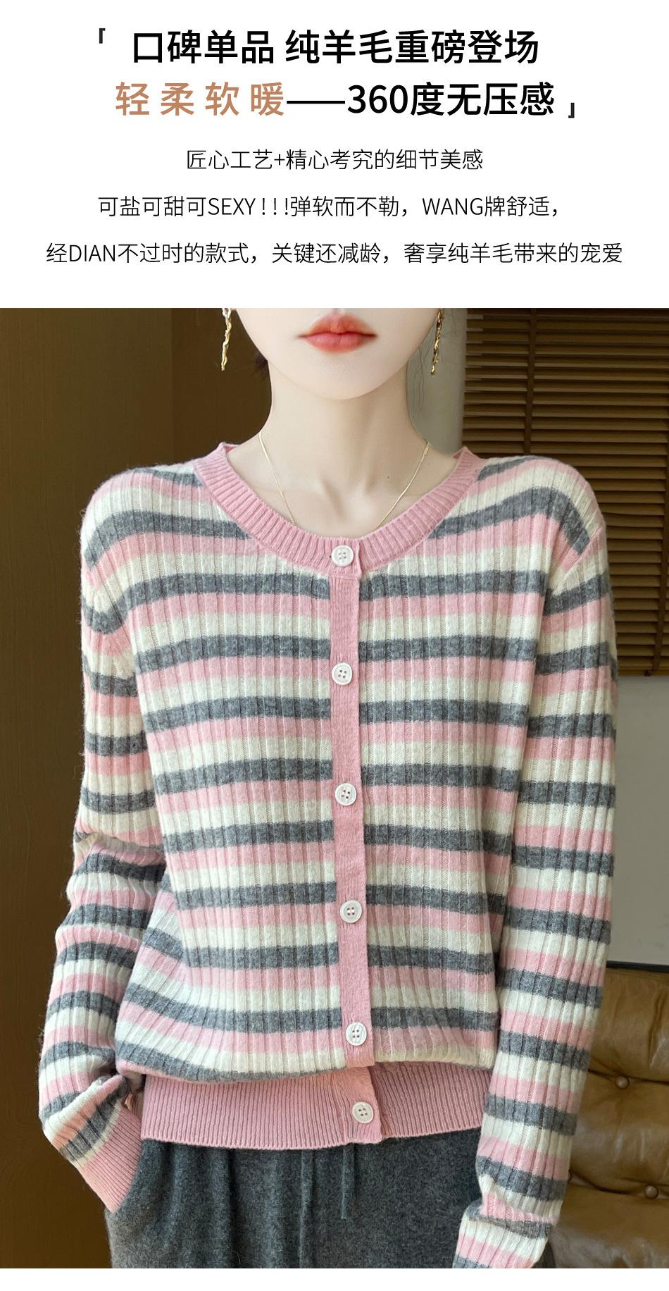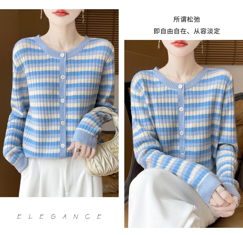 Cárdigan de Punto Básico para Mujer de Otoño/Invierno 2025 Nuevo, 100% Lana Pura, Holgado, Cuello Redondo, Bloque de Color a Rayas, Abotonado