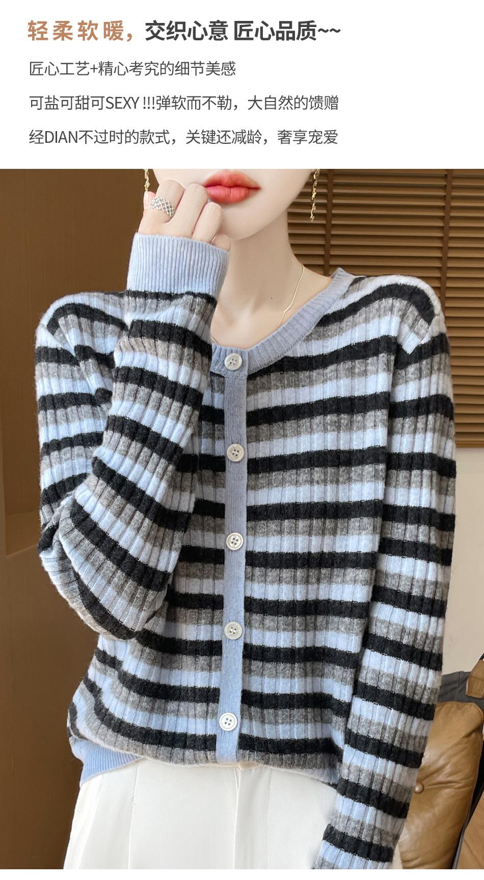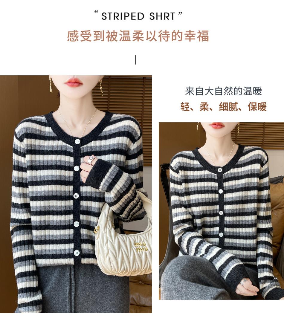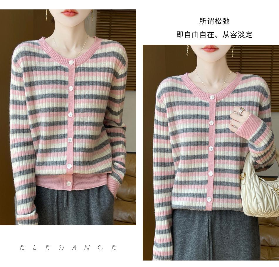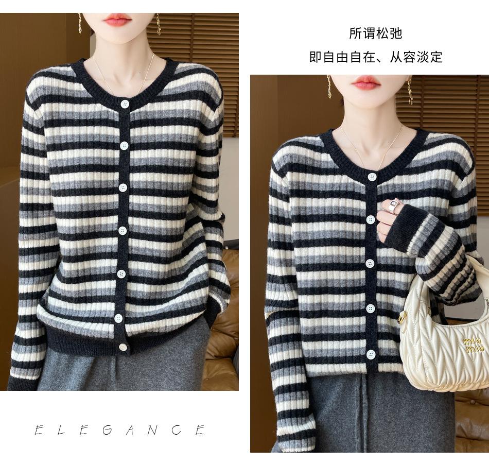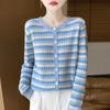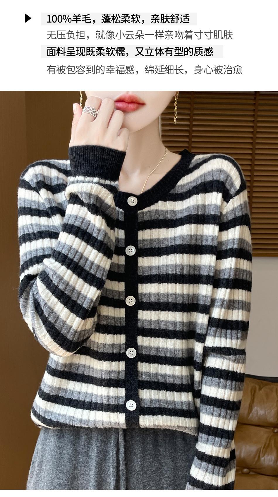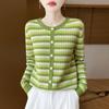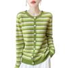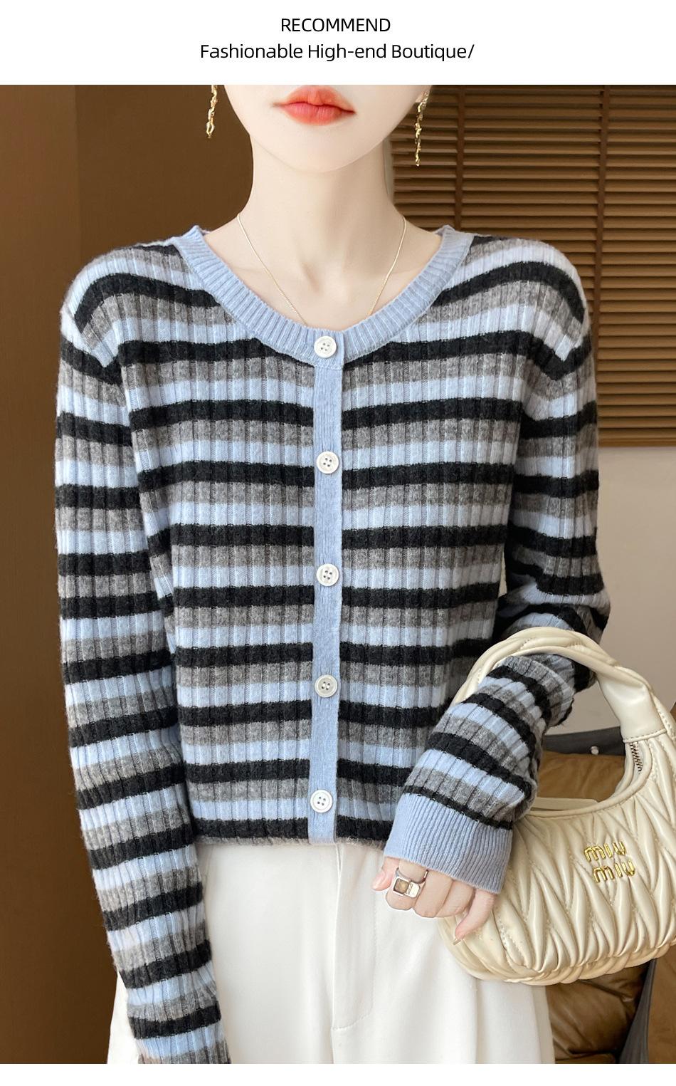 Cárdigan de Punto Básico para Mujer de Otoño/Invierno 2025 Nuevo, 100% Lana Pura, Holgado, Cuello Redondo, Bloque de Color a Rayas, Abotonado