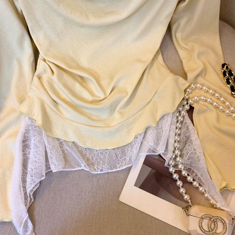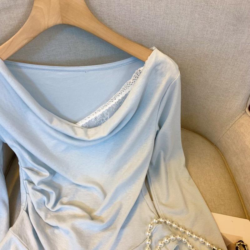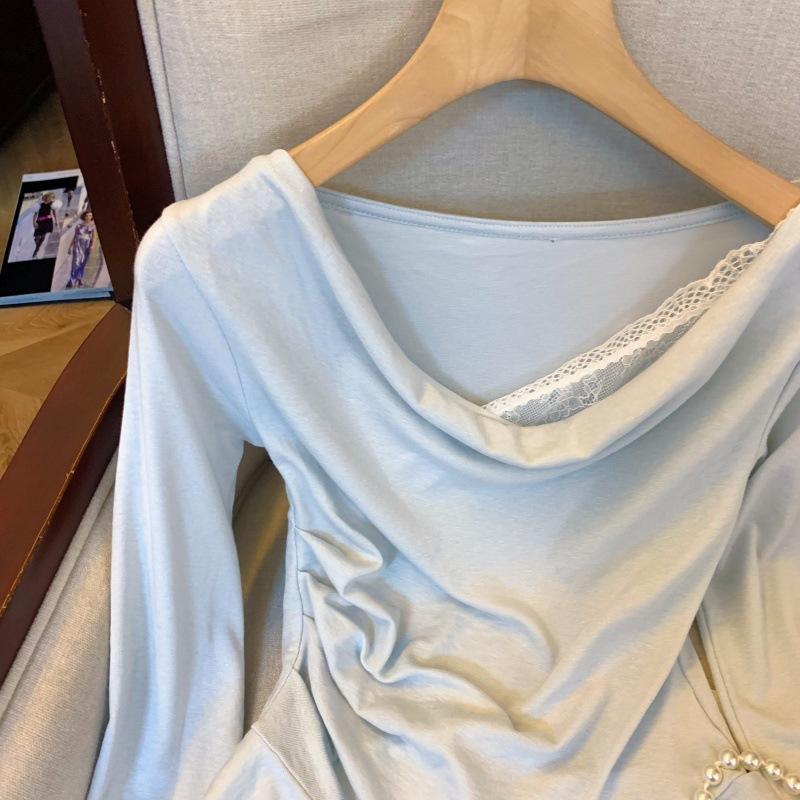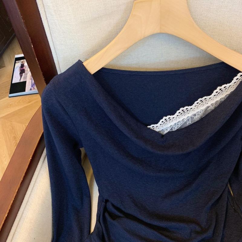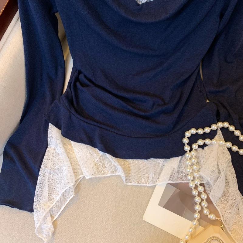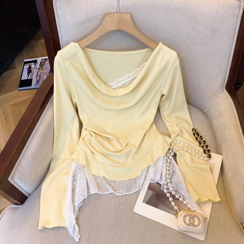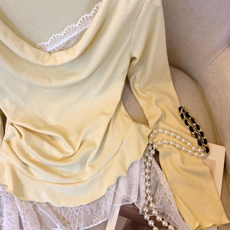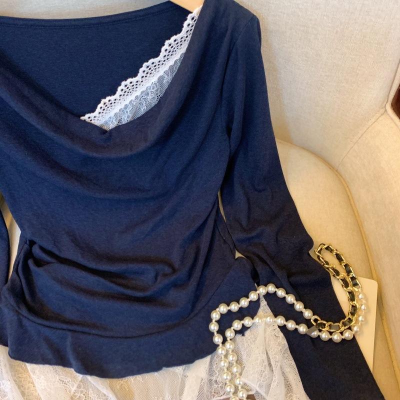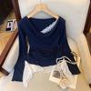 Foto Real 2025 Nuevo Estilo Falso Dos Piezas Cuello Caído Manga Larga Tejido Otoño Invierno Adelgazante Capa Interior Camiseta Base Top Mujer