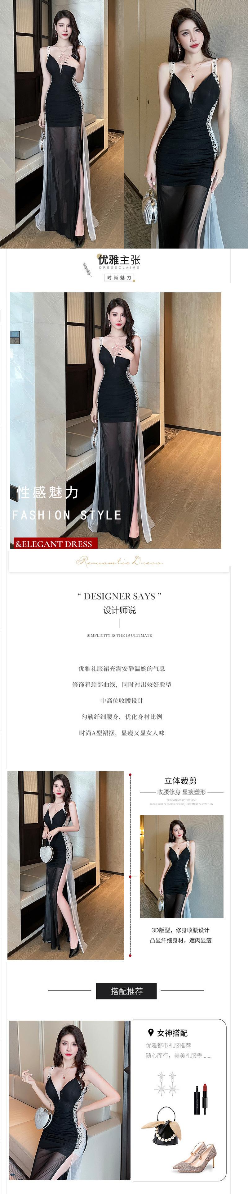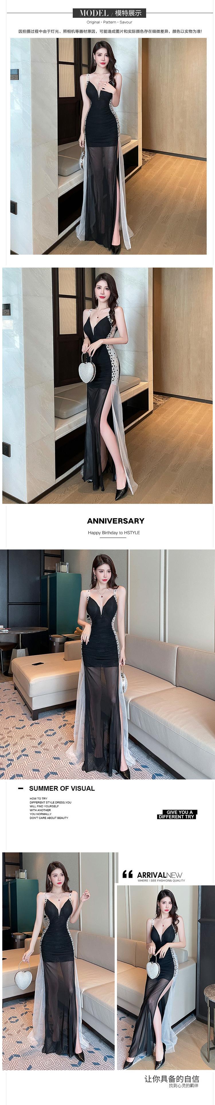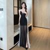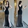 Vestido Sexy Transparente Escotado Adelgazante Malla Vestido de Club Nocturno para Mujer Falda Larga con Tirantes