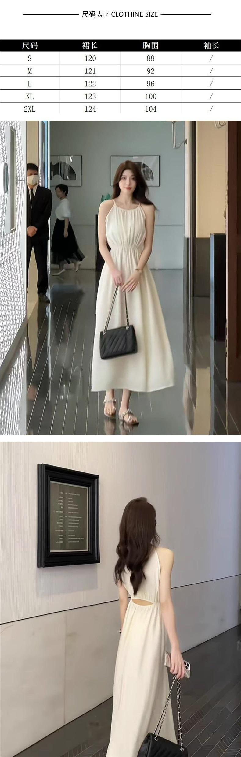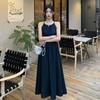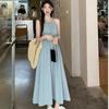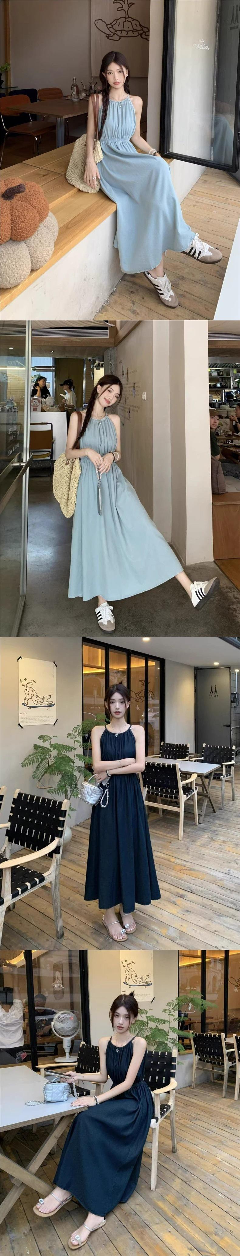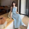 Vestido azul francés con tirantes halter para mujer verano nuevo estilo vacacional junto al mar sin mangas playa vestido largo a la moda